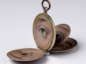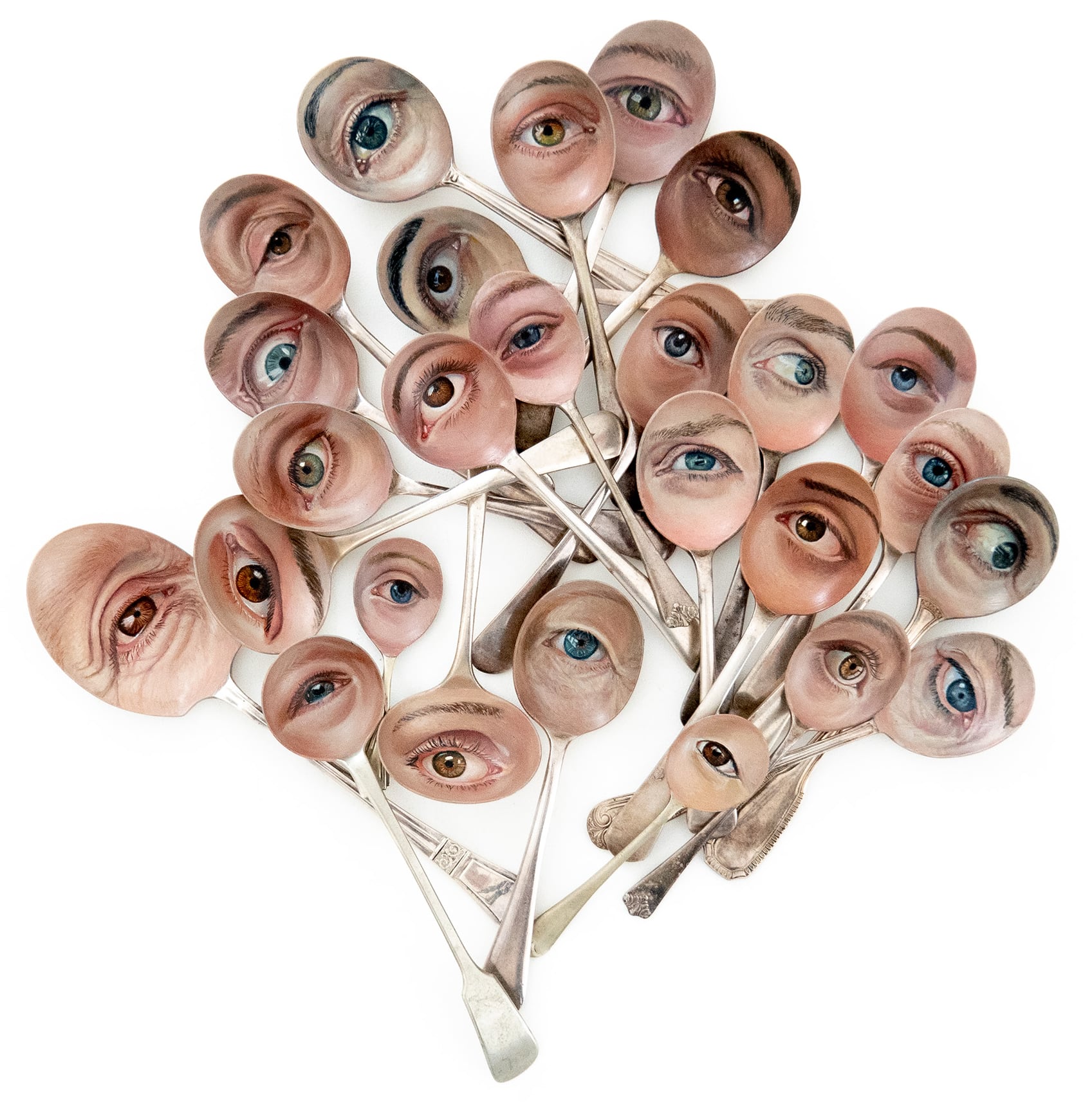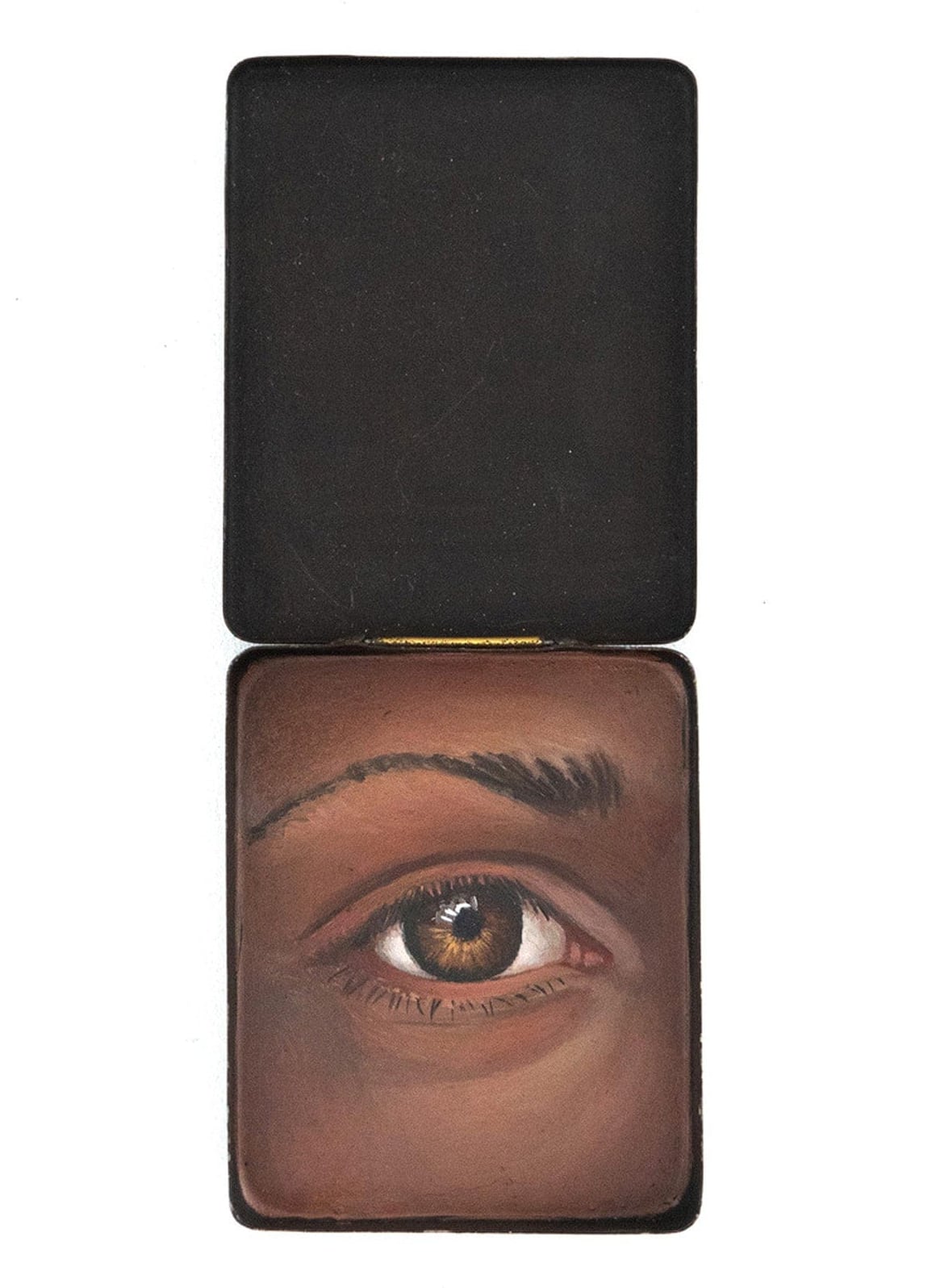 What does it mean to see? To be seen? Artist Robyn Rich (previously) examines these questions in her practice as she paints realistic eyes that peer out from vintage tins and small vessels. The tiny works harness physical particularities to relay the emotions and idiosyncrasies of the subject, whether through thick brows, wrinkles, or mascaraed lashes that frame the delicate organs. Intimate and unsettling when displayed in large collections, the miniature pieces explore various aspects of the gaze and perspective and ask who is watching whom.