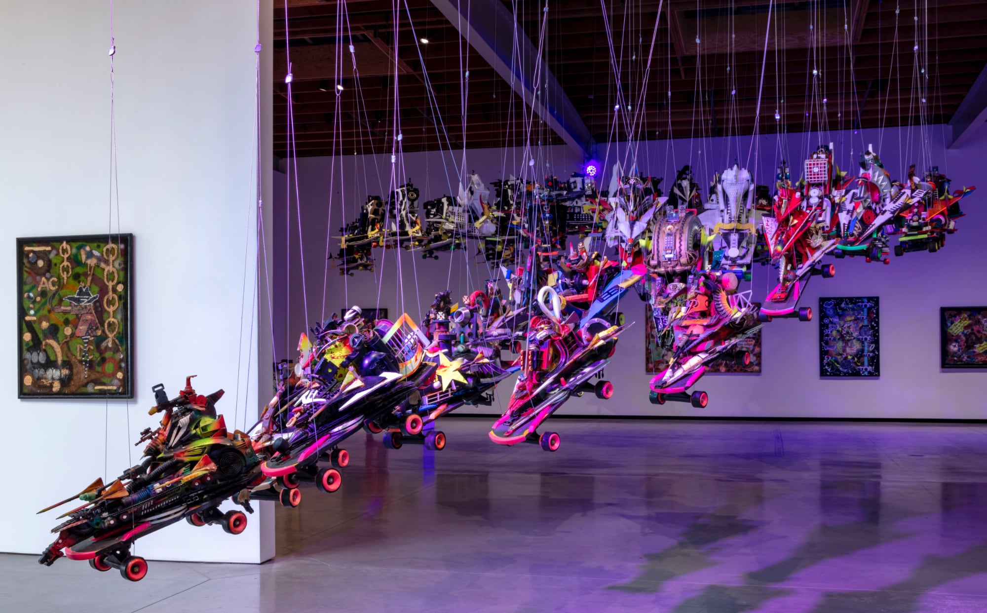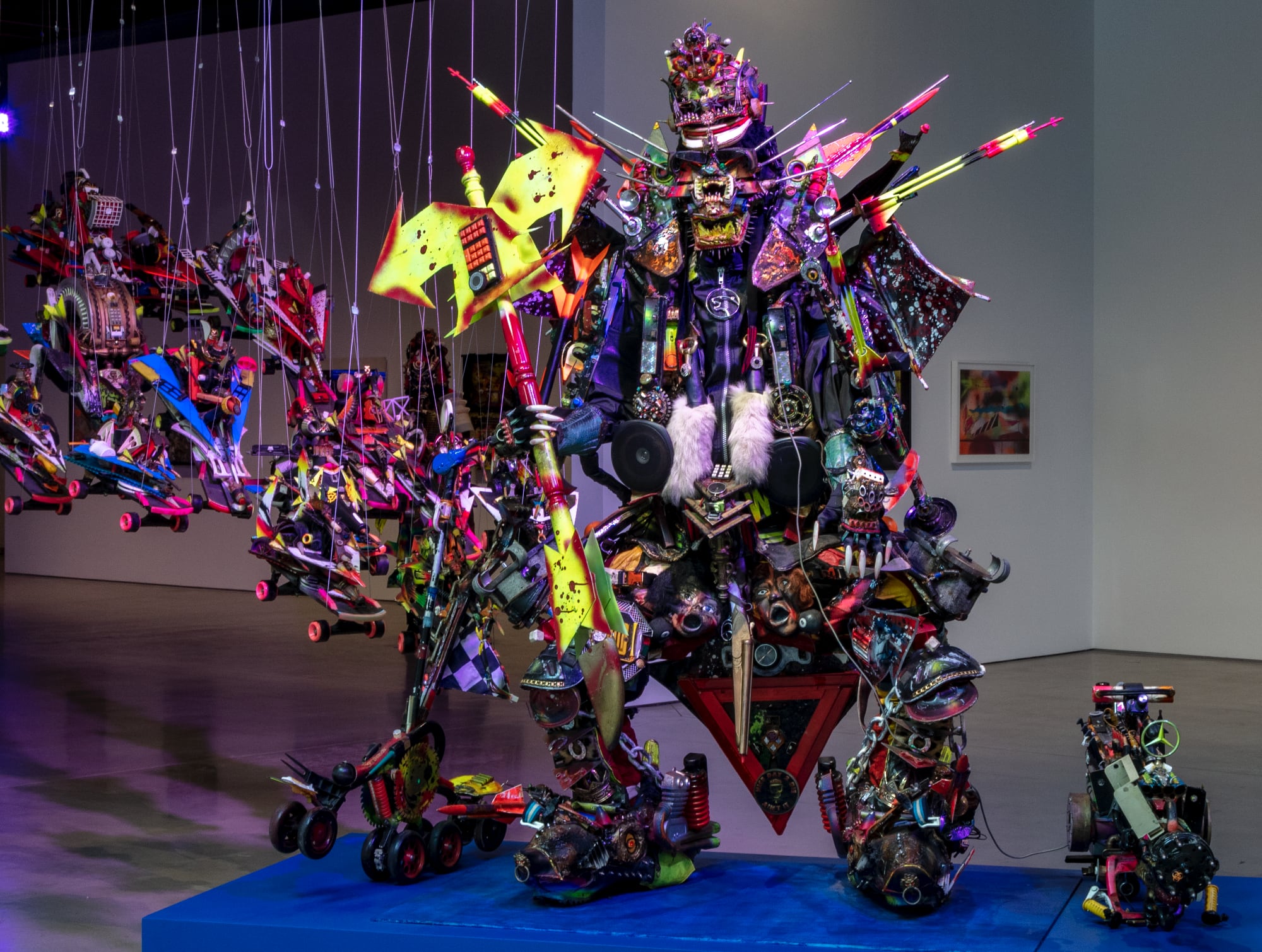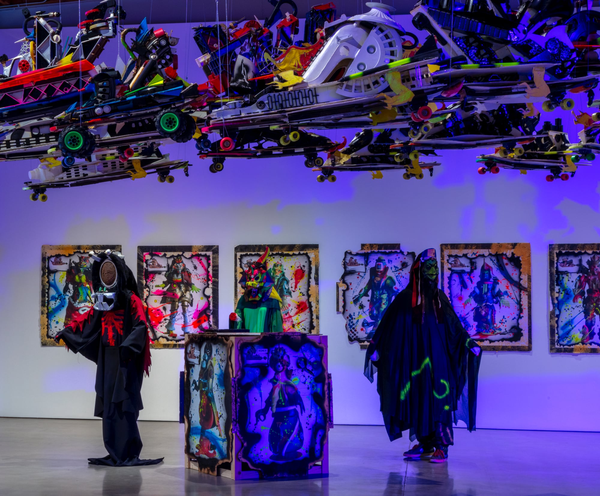 At Jeffrey Deitch in Los Angeles, dozens of spacecraft constructed from skateboards, salvaged plastics, and scrap materials descend from the ceiling in a seeming rescue mission. Awash in blue light, the vehicles hover above the galleries filled with assemblages in a similar vein, from small otherworldly troopers to life-sized characters elaborately outfitted with headdresses of fur and spray-painted crowns.