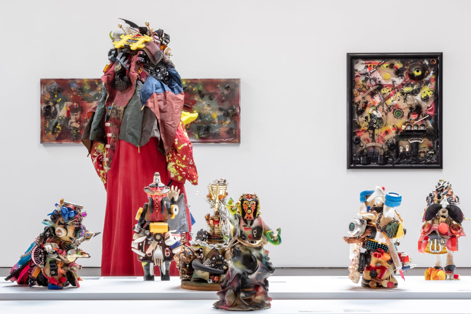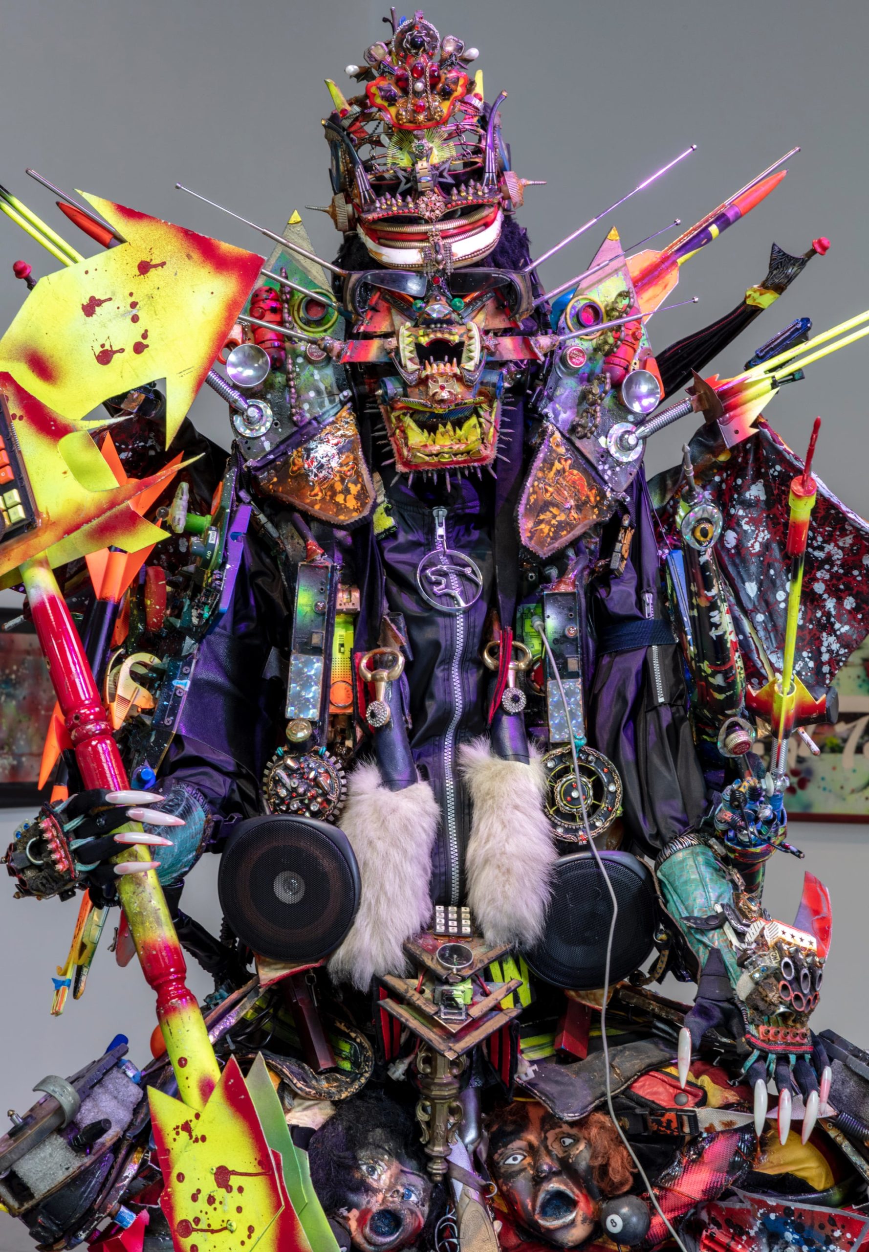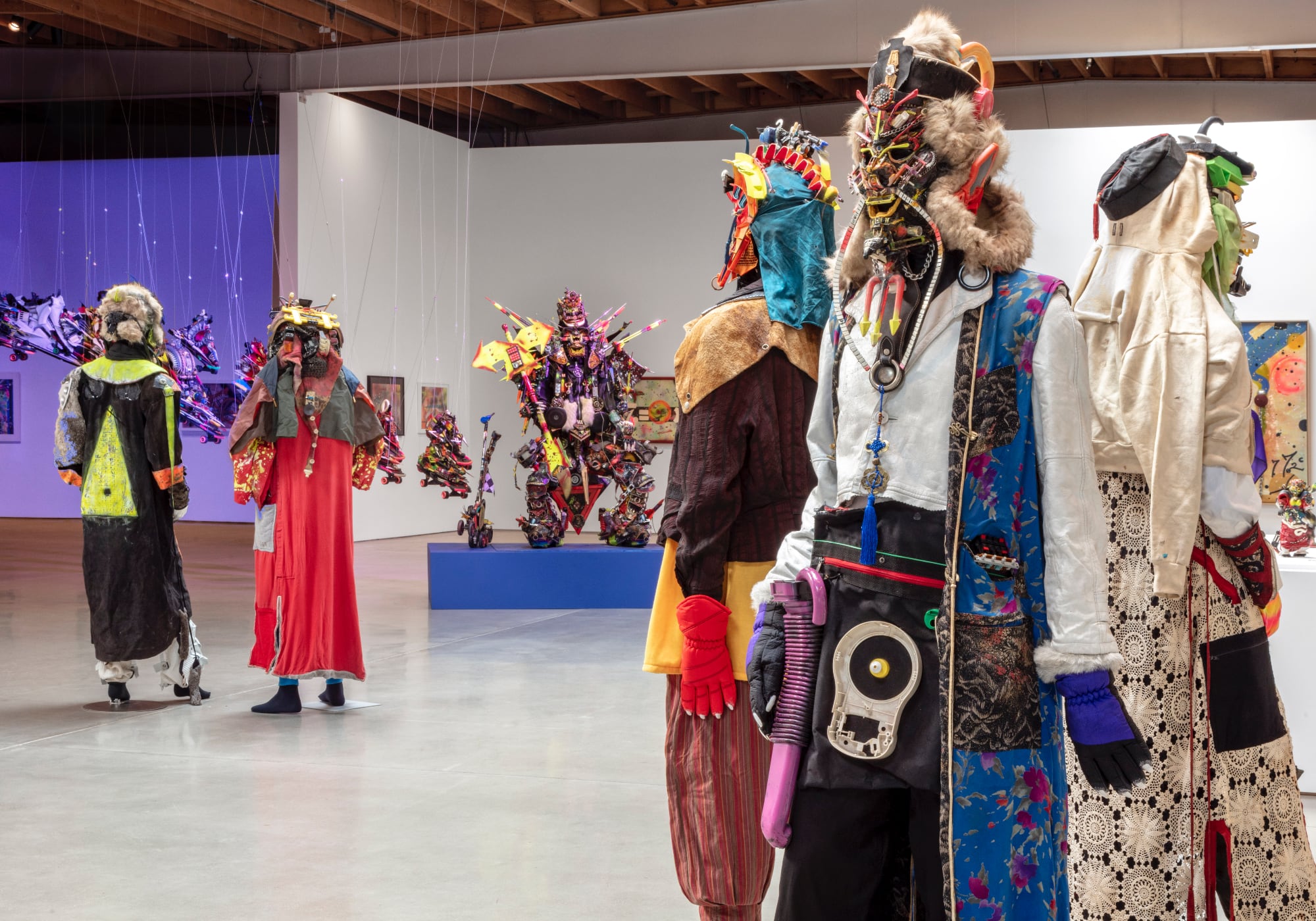 At Jeffrey Deitch in Los Angeles, dozens of spacecraft constructed from skateboards, salvaged plastics, and scrap materials descend from the ceiling in a seeming rescue mission. Awash in blue light, the vehicles hover above the galleries filled with assemblages in a similar vein, from small otherworldly troopers to life-sized characters elaborately outfitted with headdresses of fur and spray-painted crowns.