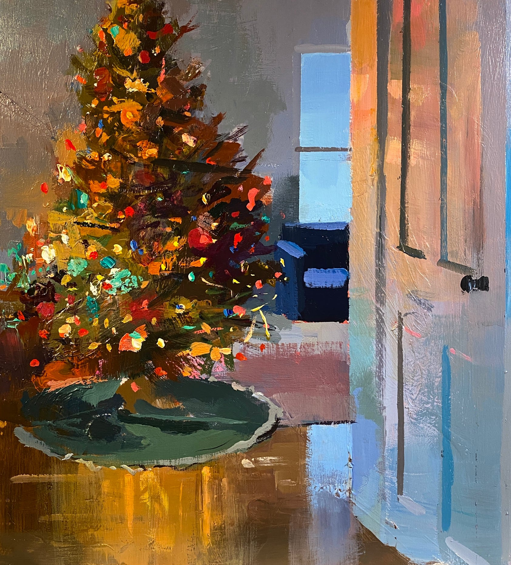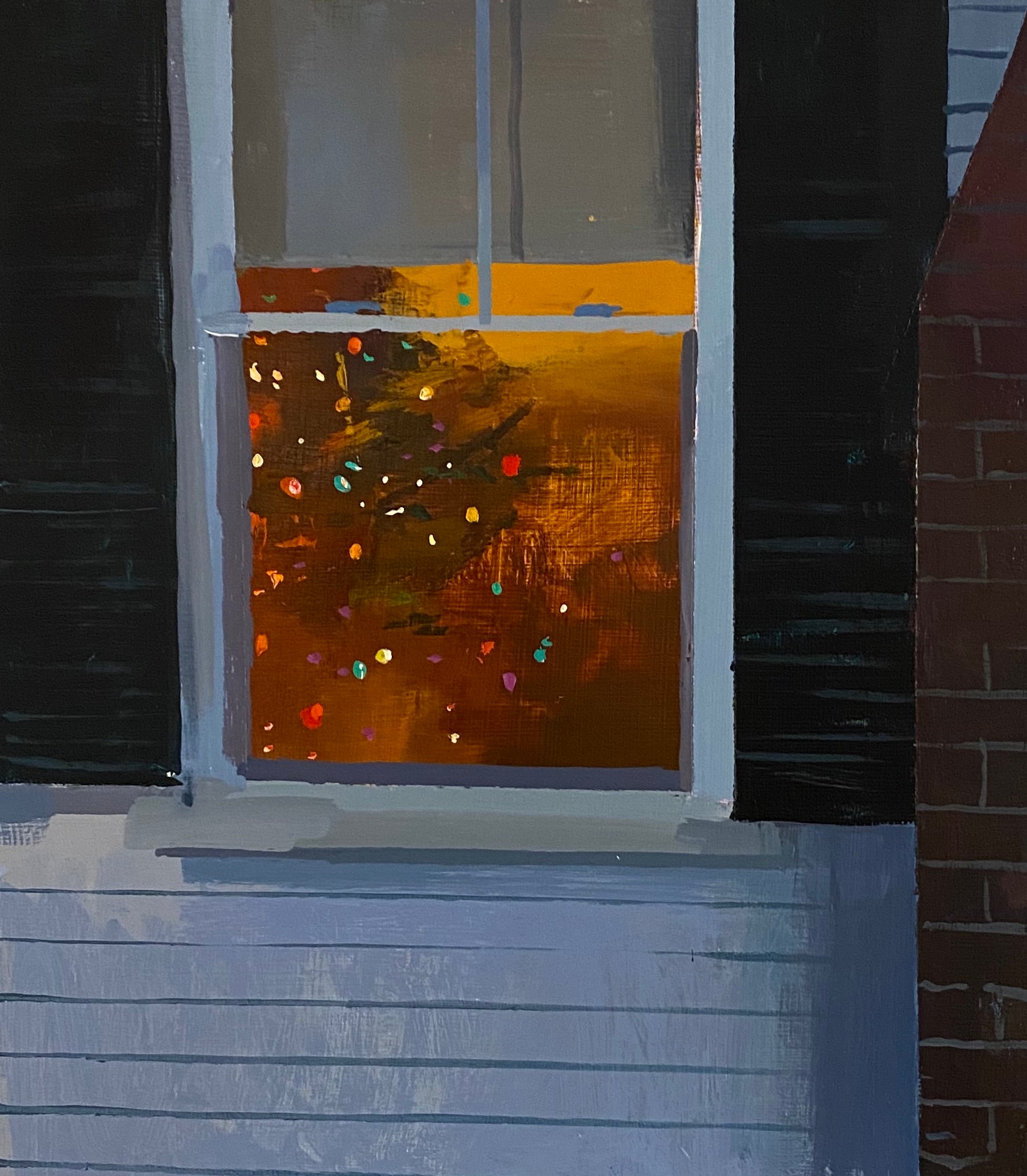 Colorful lights strung on trees and lining gutters cast a welcoming, vibrant glow on dreary, winter evenings in Jeremy Miranda’s paintings. The Maine-based artist (previously) is known for his dreamlike works of landscapes and interiors that incorporate both the domestic and outside world, and elements of nostalgia, intimacy, and memory echo throughout the scenes. Often illuminating the magical in the mundane, Miranda has been creating a growing collection of holiday paintings during the last few years that center on Christmas trees and decorated homes, capturing the warmth of the season as it shines through stark, frigid nights.