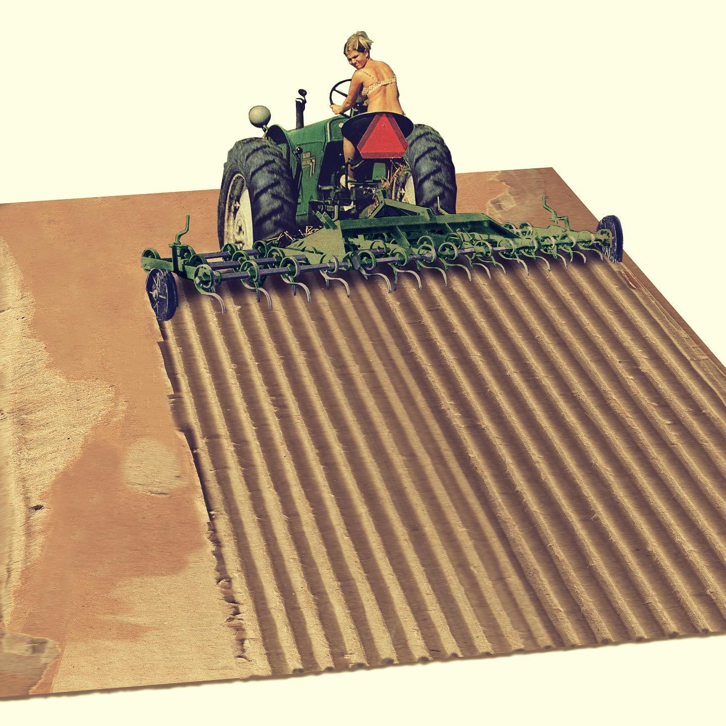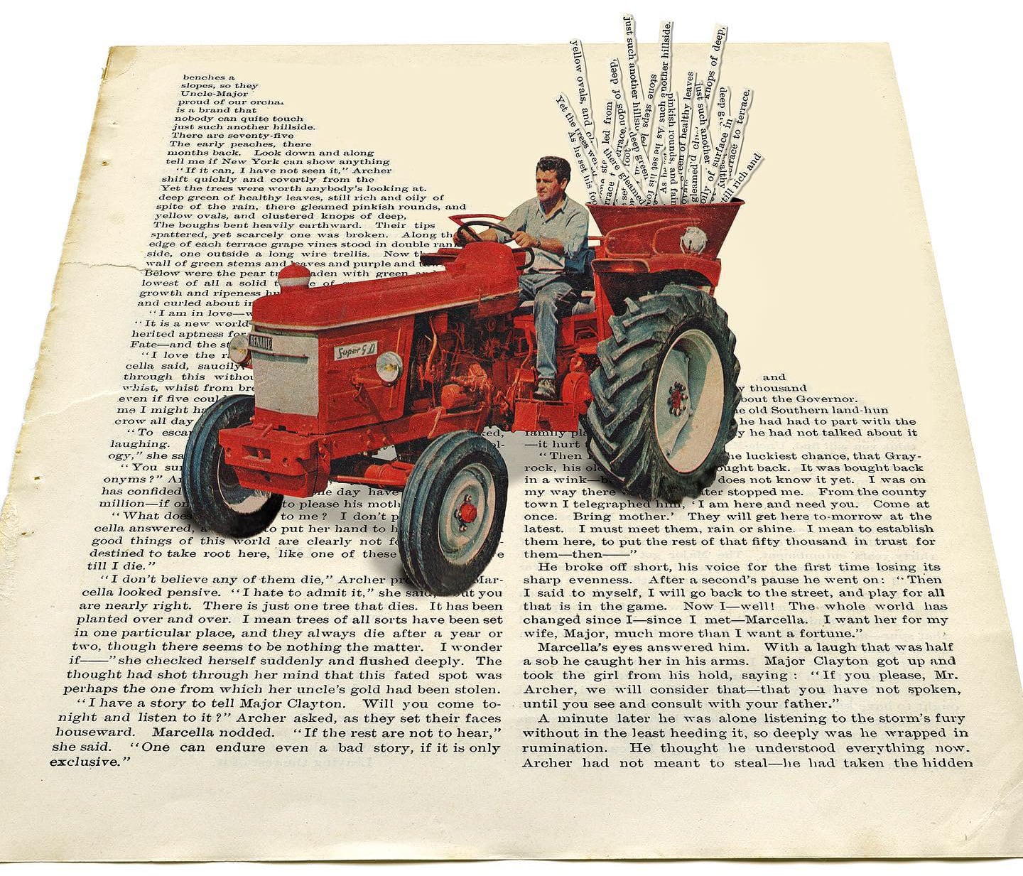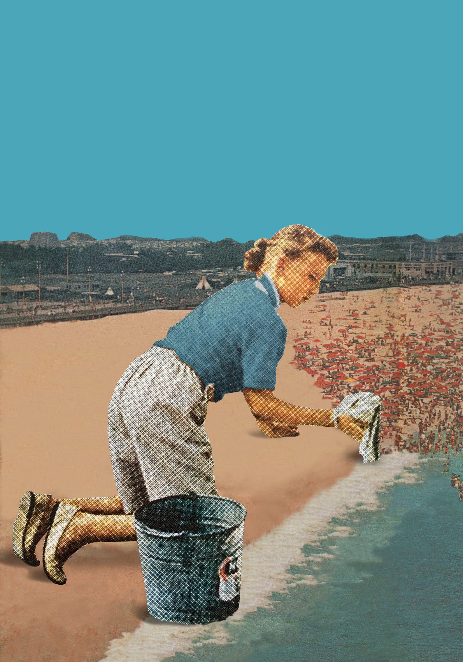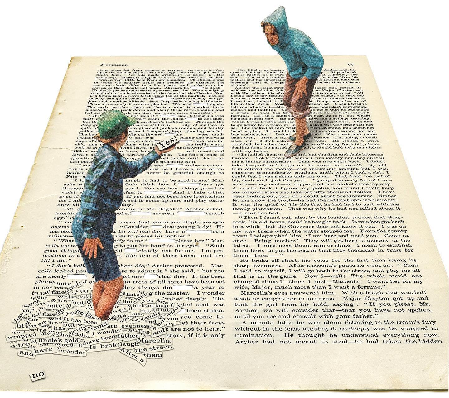 A man mows a field of text, a vacuum cleaner sucks up beachgoers, and kids shield themselves from falling words in the witty collages of Toon Joosen. From his studio in The Netherlands, the artist cuts and splices vintage photos, magazines, postcards, and book pages into clever works that take an ironic and surreal approach to everyday activities. Joosen tends to play with scale and perspective, creating tongue-in-cheek scenarios brimming with nostalgia and humor. He shares dozens of works on Instagram and has prints, buttons, and other goods available on Etsy.