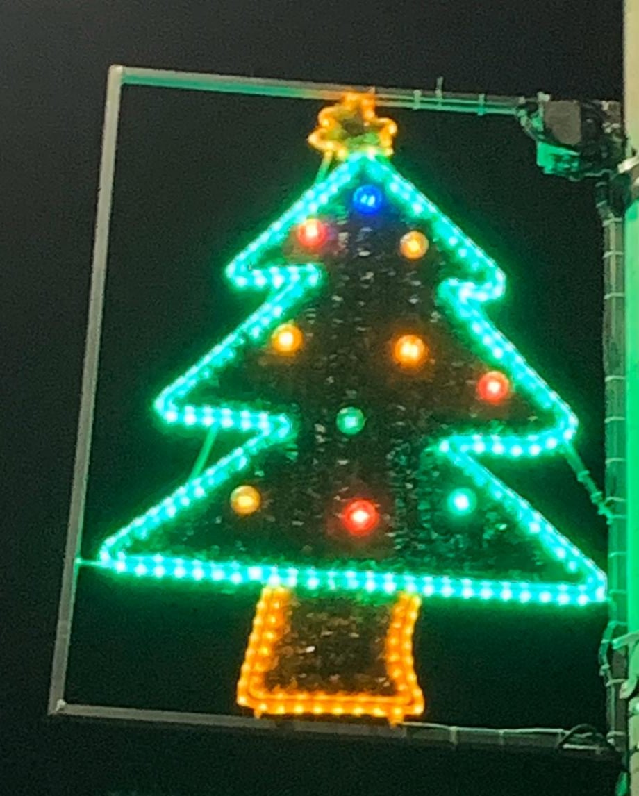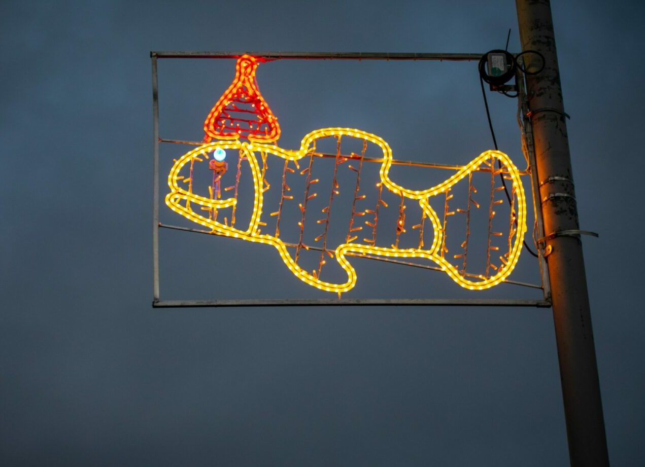 For more than 20 years, the town of Newburgh in Fife, Scotland, has marked the holiday season with a wonderfully wonky tradition. Each autumn, young residents are invited to submit original sketches of Christmas decorations to a competition, and once a winning design is selected, Blachere Illumination transforms the work into an LED sculpture that’s then displayed throughout the town. The newest light is a salmon nicknamed “Happy Nemo” that sports a red hat, and the menagerie also features a “reinduck,” a cheerful piece of candy in a green wrapper with arms and legs, and a dinosaur with a star on its head.