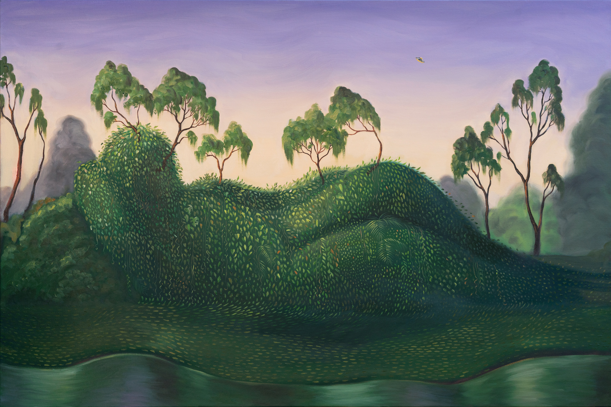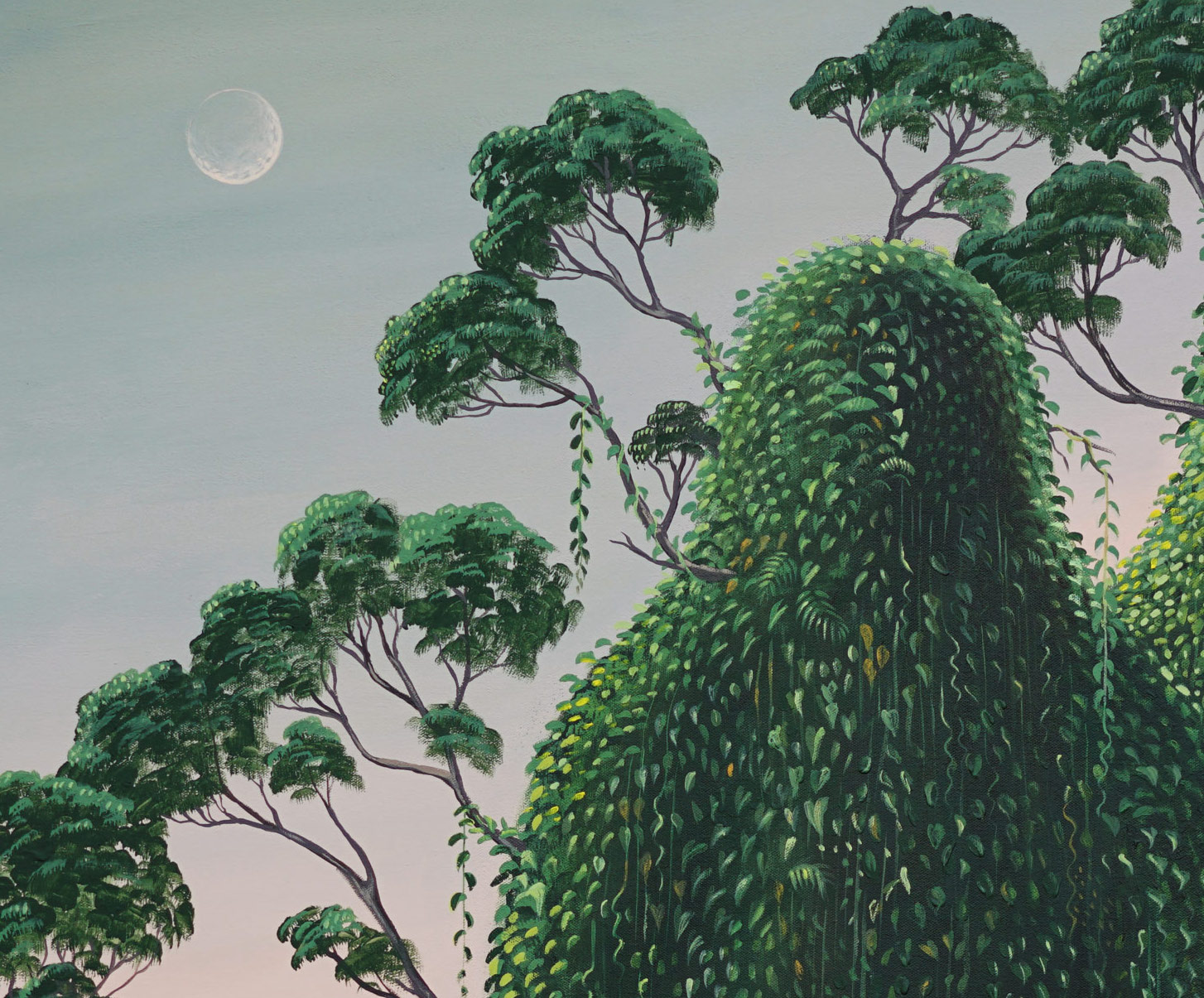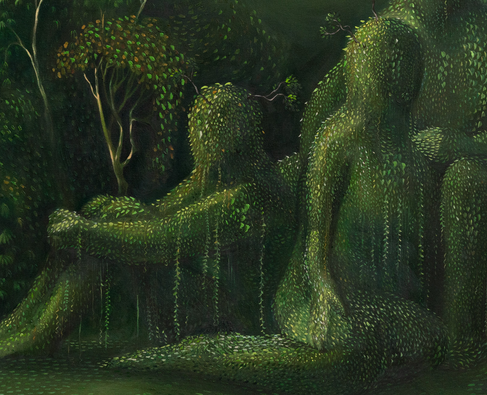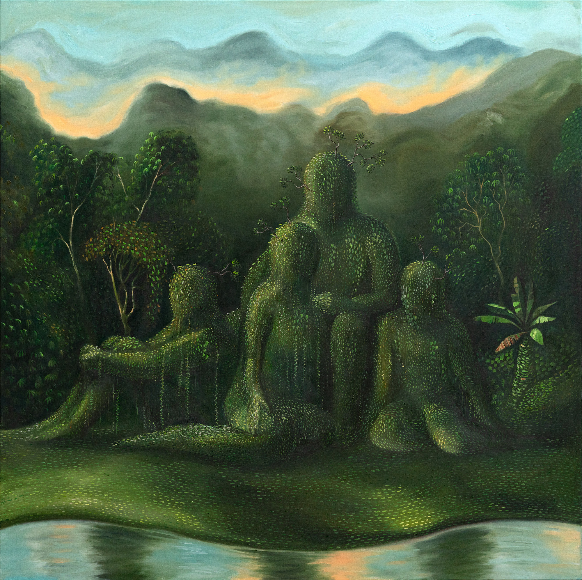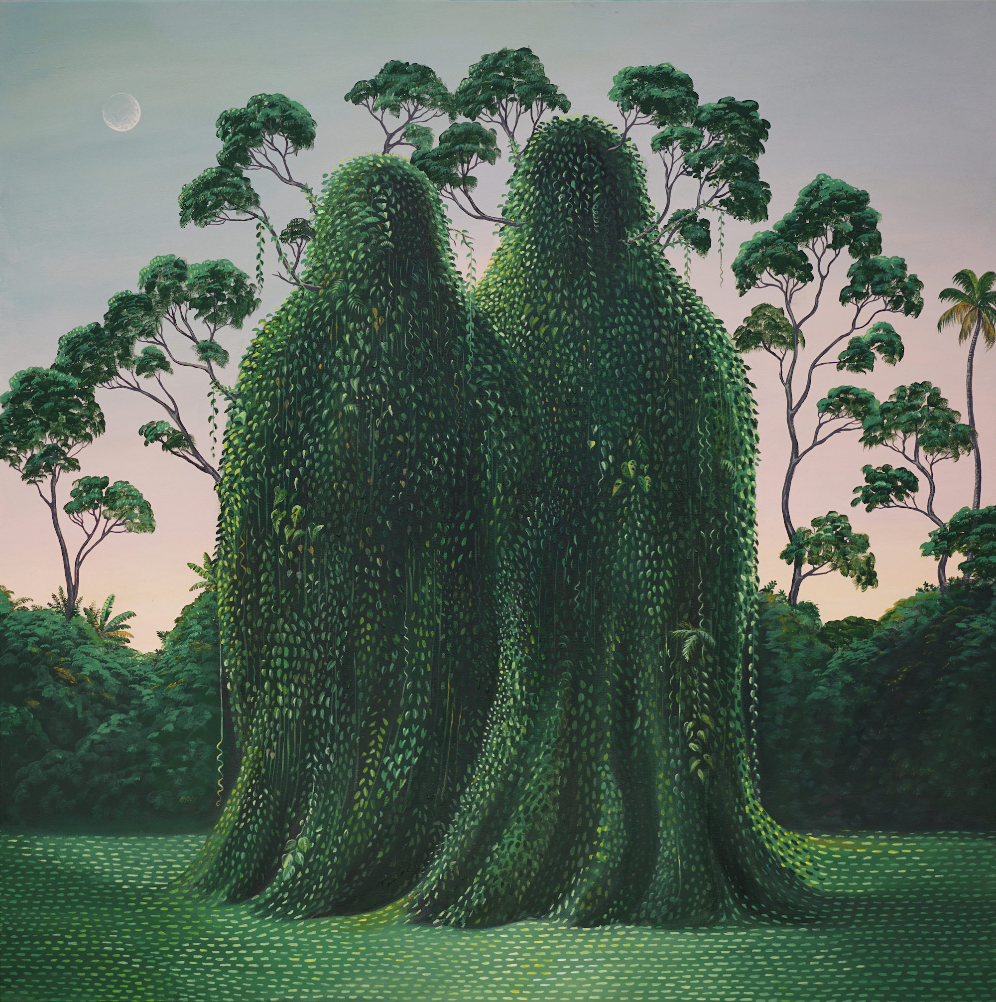 On the banks of the Martha Brae River in Jamaica, artist Shyama Golden noticed greenery that appeared like lovers embracing. She “started to see these anthropomorphic vine-covered trees everywhere, taking on the forms of various archetypes.” The scenes inspired a series of paintings titled With or Without Us that merges facets of landscape and portrait painting into verdant works expressing nature as a social entity.