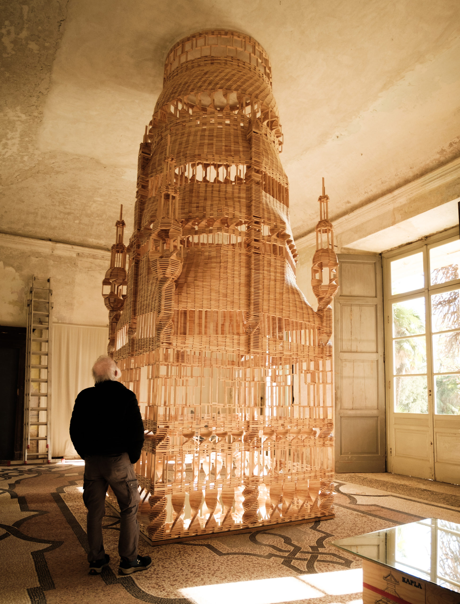 One of Salvoldi’s installations can take between three weeks and four months to complete, and rather than opening a show with a completed work, viewers are invited to observe as he adds piece after piece over time. “I believe it isn’t just a performance, rather a kind of a window on an artistic process,” he says. “That’s why I like to define it as a living, mobile room or atelier that people can visit and see the installation growing day after day, week after week.” When a show closes and the work must be disassembled, visitors are invited to deconstruct the installation by throwing additional planks at it until it crumbles, or the artist will devise a domino-like path of KAPLA that strikes at the foundations.
