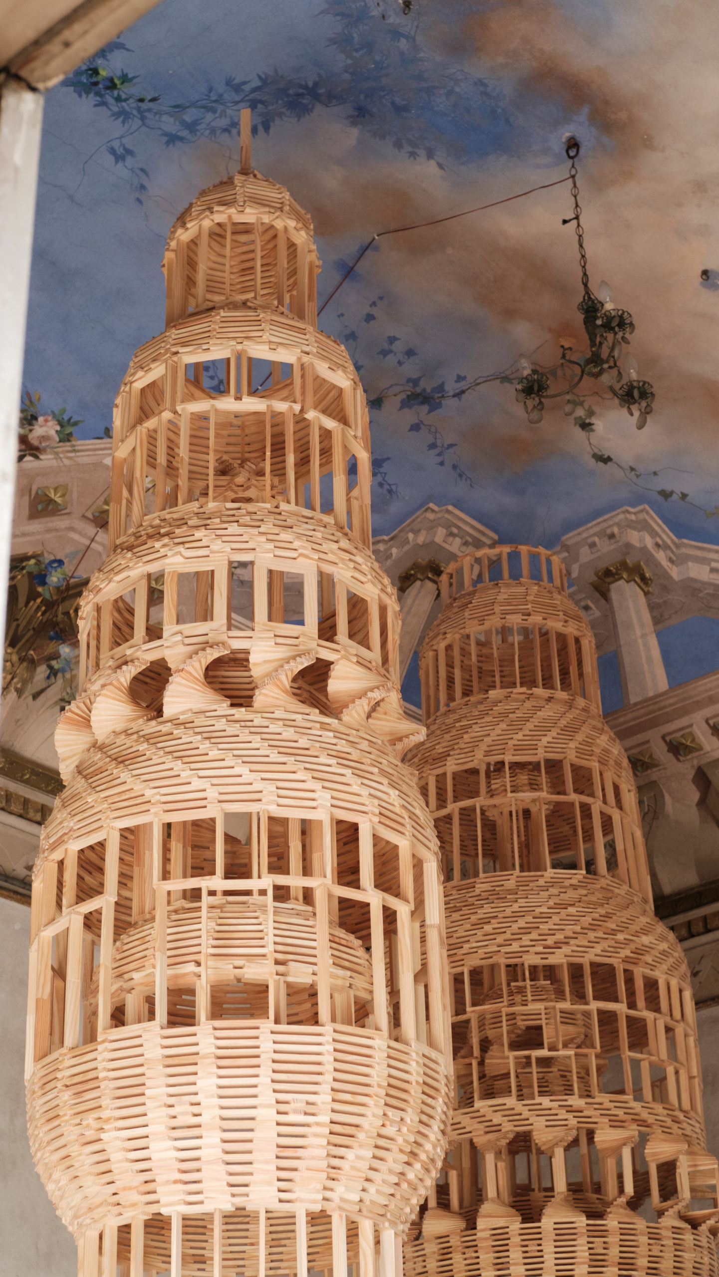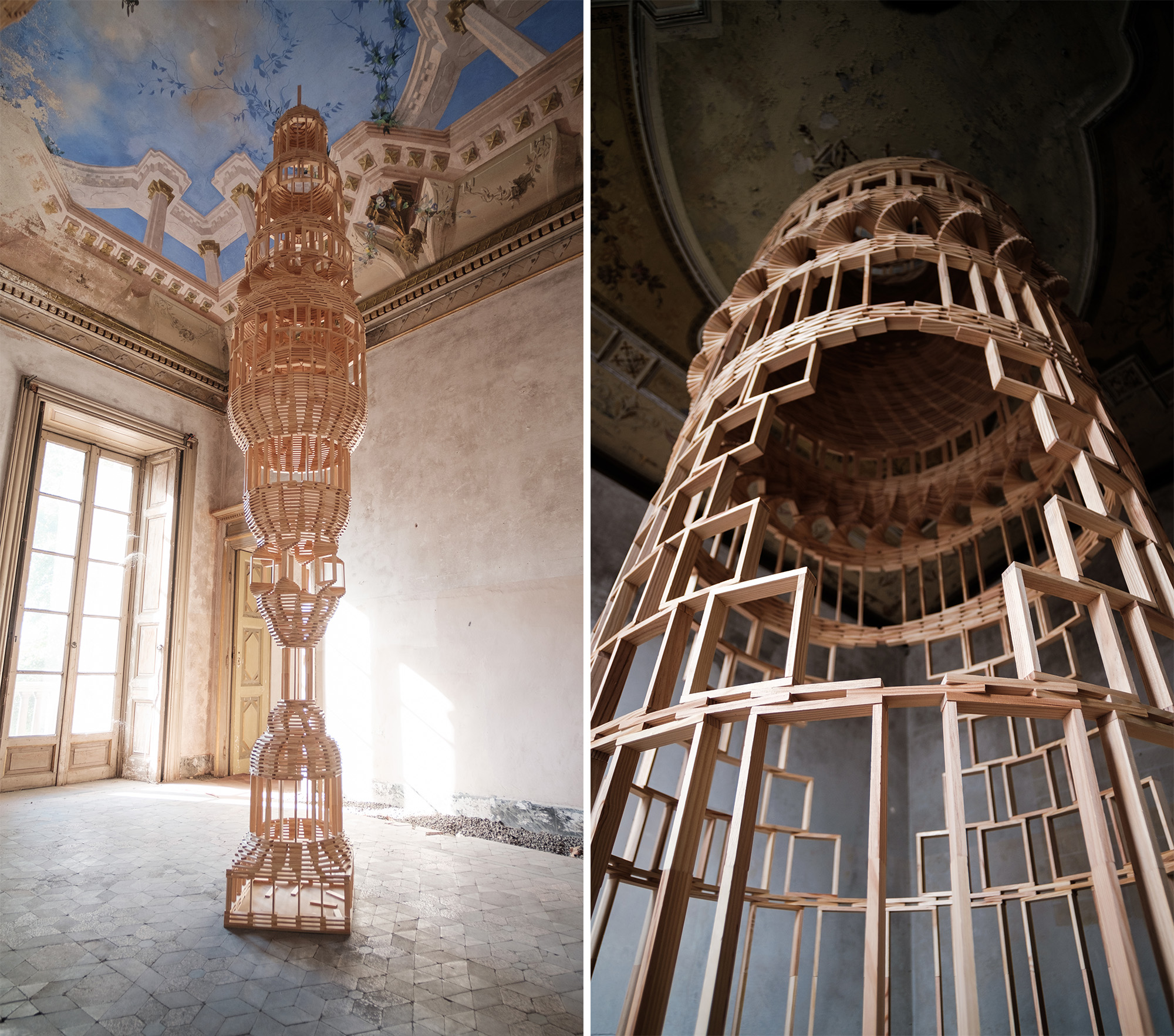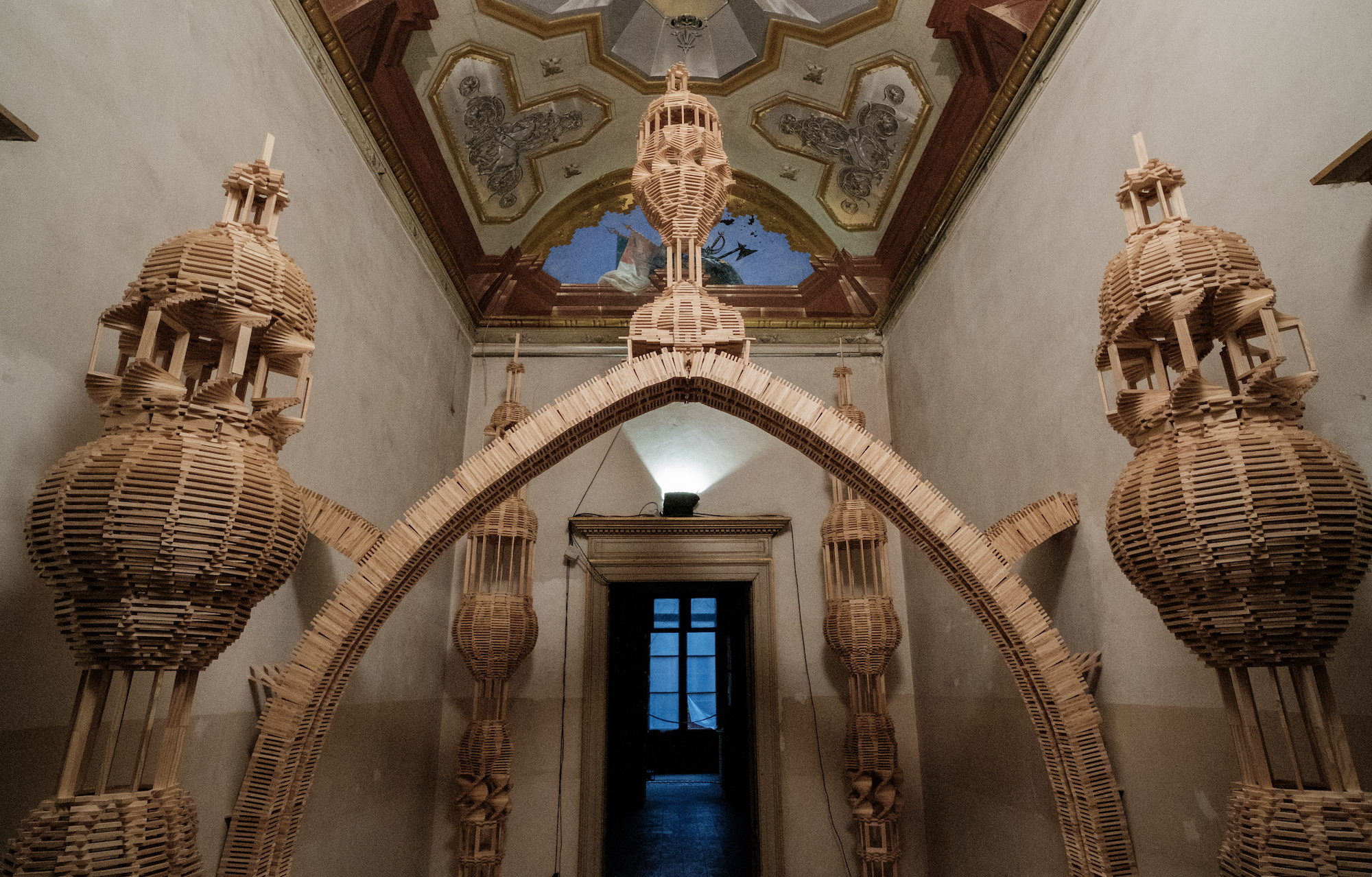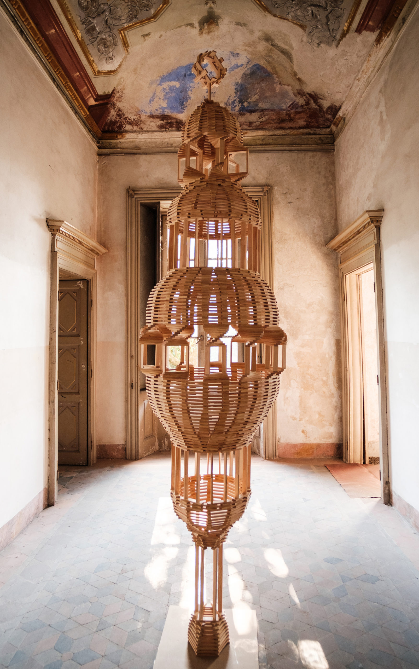 At the base of Salvoldi’s towering, temporary installations is a single component: KAPLA planks. Devised by a Dutch antique dealer in the late 1960s, KAPLA are an alternative to chunkier blocks that make it easier to build long or horizontal features like lintels and roofs. Initially, Salvoldi started with a set of 1,000 of the wooden construction bricks, and as he amassed thousands more, his constructions became increasingly voluminous. Spiraling columns, delicate towers, and airy apertures emerge gradually from a foundation on the floor, and the structures are often illuminated from inside and reveal dramatic effects in cavernous spaces. Each piece responds to its environment, drawing the eye upward to unique settings like the historic, neoclassical Casa Bossi. “The only limit is your imagination and, of course, gravity,” he says.