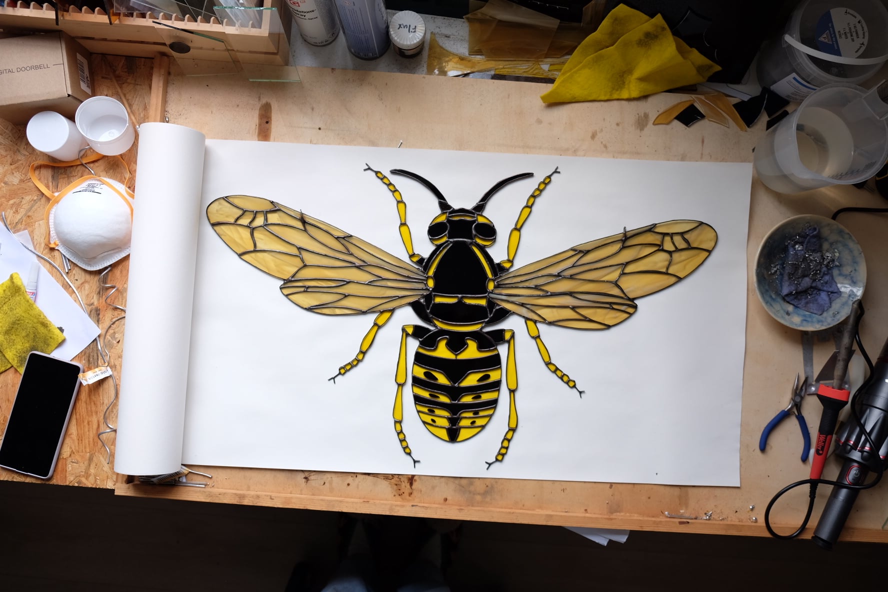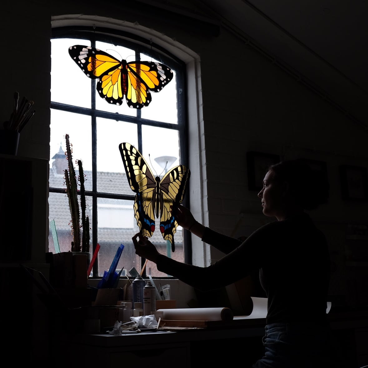 From her home studio in the Netherlands, artist Melanie solders vivid stained glass renditions of monarchs, peacock butterflies, and Spanish moon moths. She first scours etymological sources for information on colors, vein placements, and antennae, then sketches a pattern for tracing and cutting the fragile material and pieces together the delicate specimens. Like their real-life counterparts, the creatures are delicate and lively, although these cast vibrant reflected light around the spaces they inhabit. Follow the artist’s growing swarm of bees and butterflies on Instagram.
