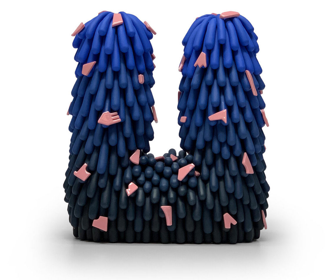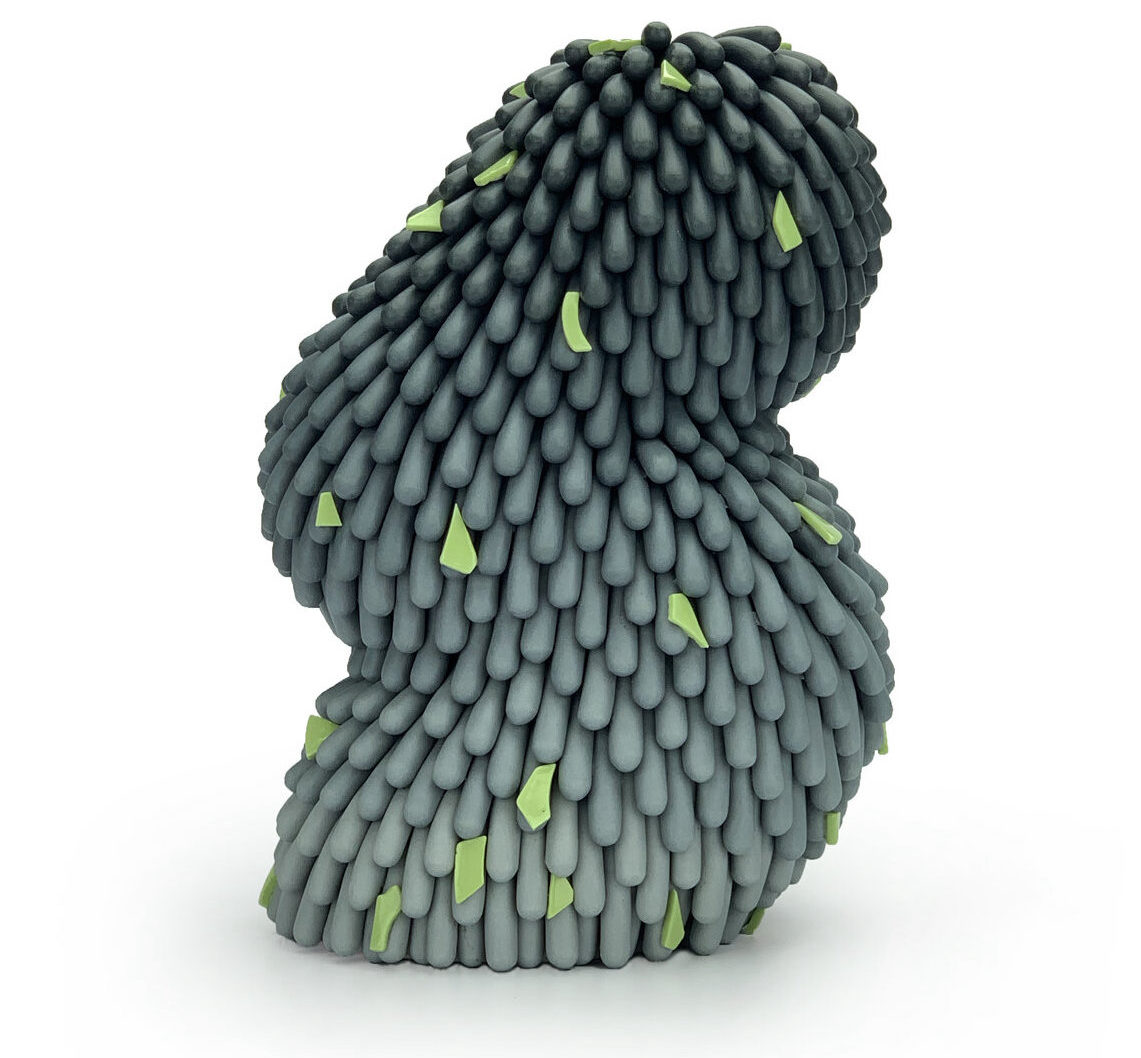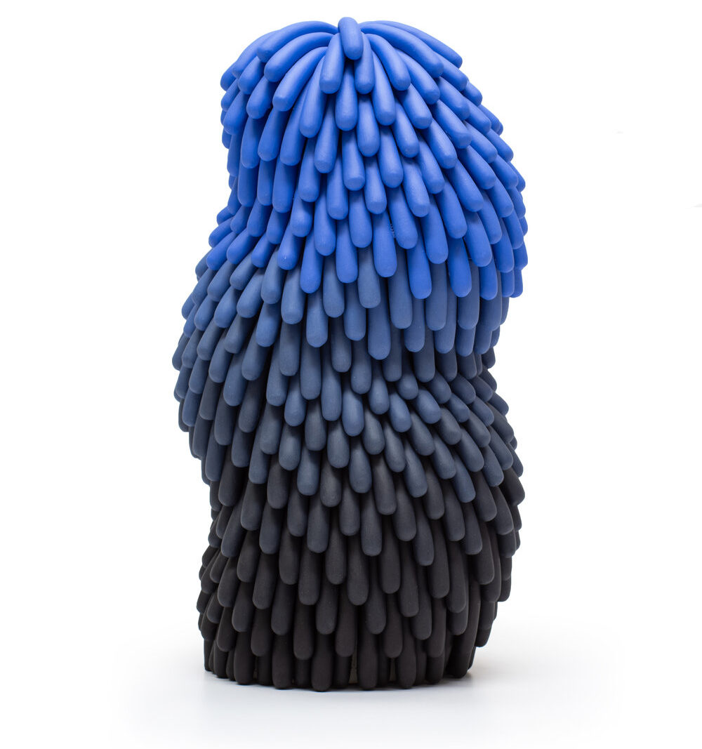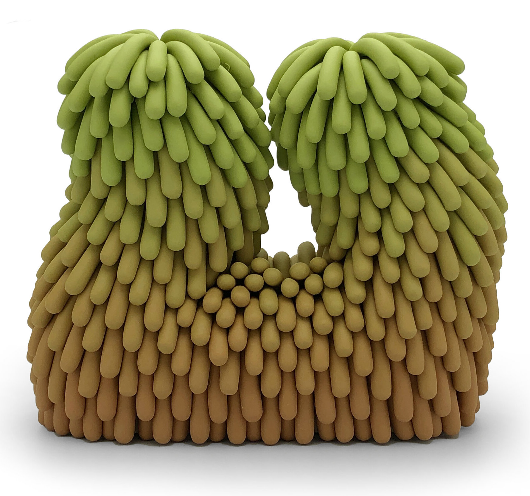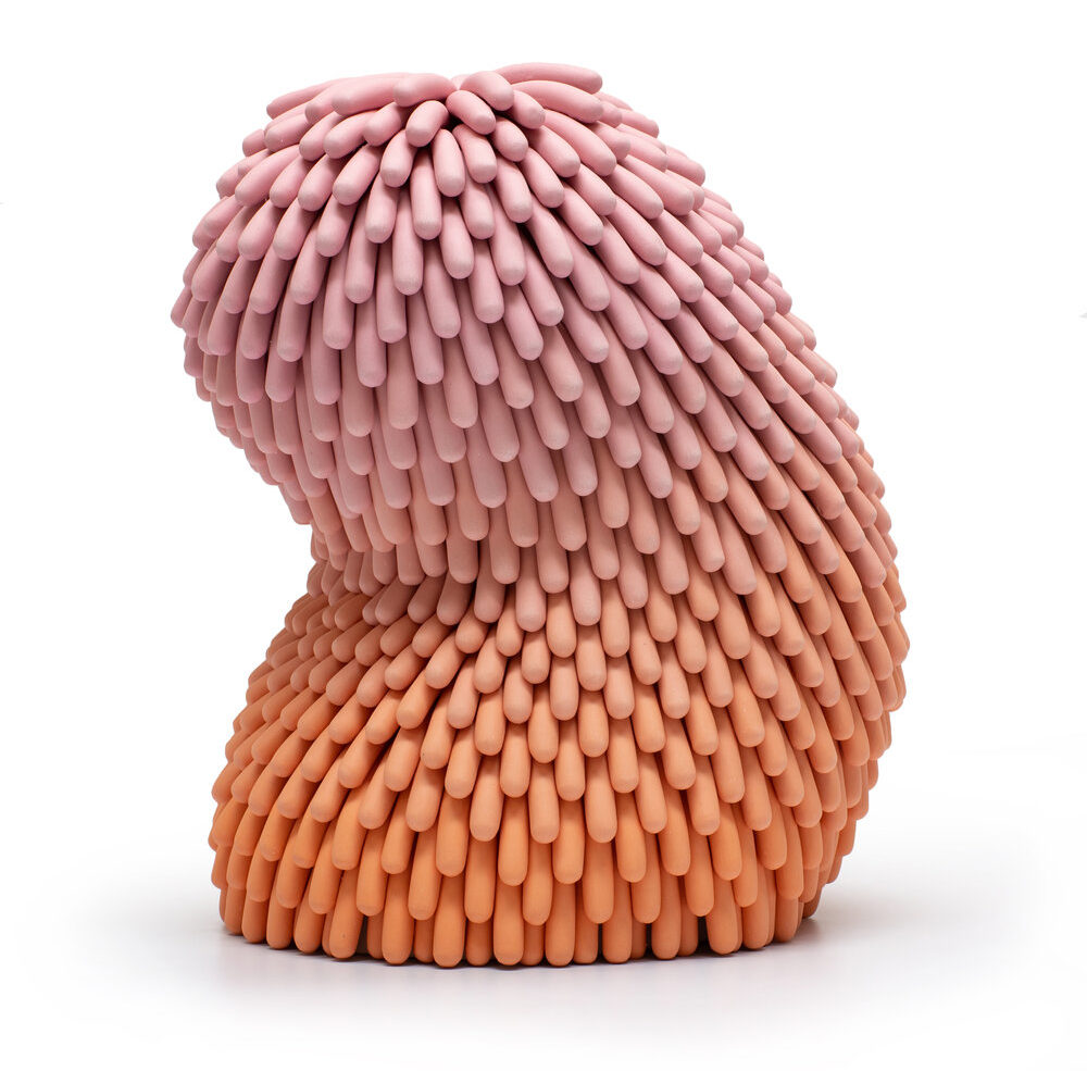 Bending and swishing as if poised to wiggle right out of the room, Linda Nguyen Lopez’s playful ceramic sculptures just want to do a little cleaning up. In the ongoing series Dust Furries, satisfying color gradients complement the supple textures of the works, which have a knack for getting odds and ends, like a dust bunny under the bed, stuck to their “fur.” “The detritus ranges from rocks to fingernails to peas,” Lopez tells Colossal. “All the things you would find on the floor or in corners.”