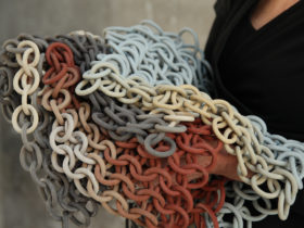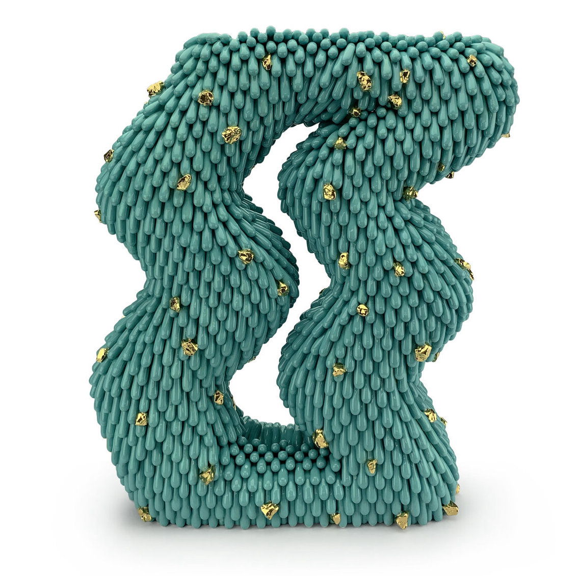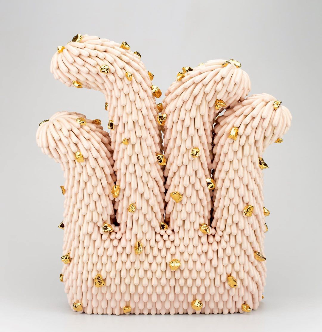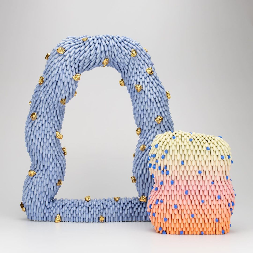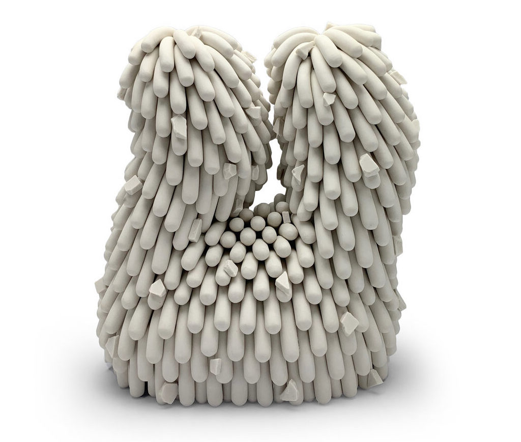 Bending and swishing as if poised to wiggle right out of the room, Linda Nguyen Lopez’s playful ceramic sculptures just want to do a little cleaning up. In the ongoing series Dust Furries, satisfying color gradients complement the supple textures of the works, which have a knack for getting odds and ends, like a dust bunny under the bed, stuck to their “fur.” “The detritus ranges from rocks to fingernails to peas,” Lopez tells Colossal. “All the things you would find on the floor or in corners.”