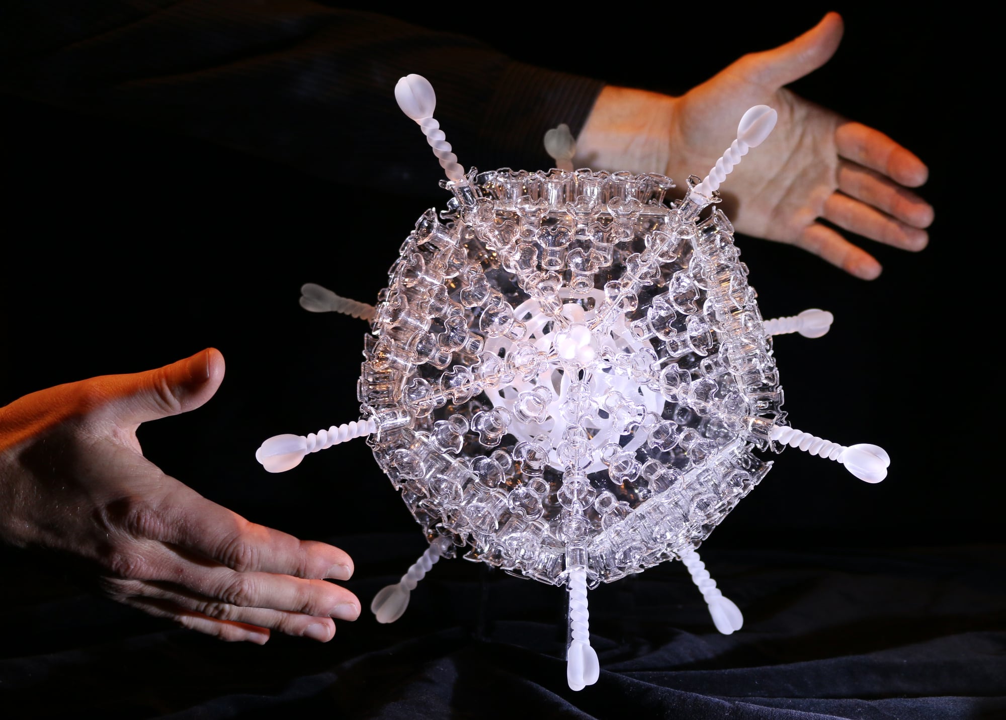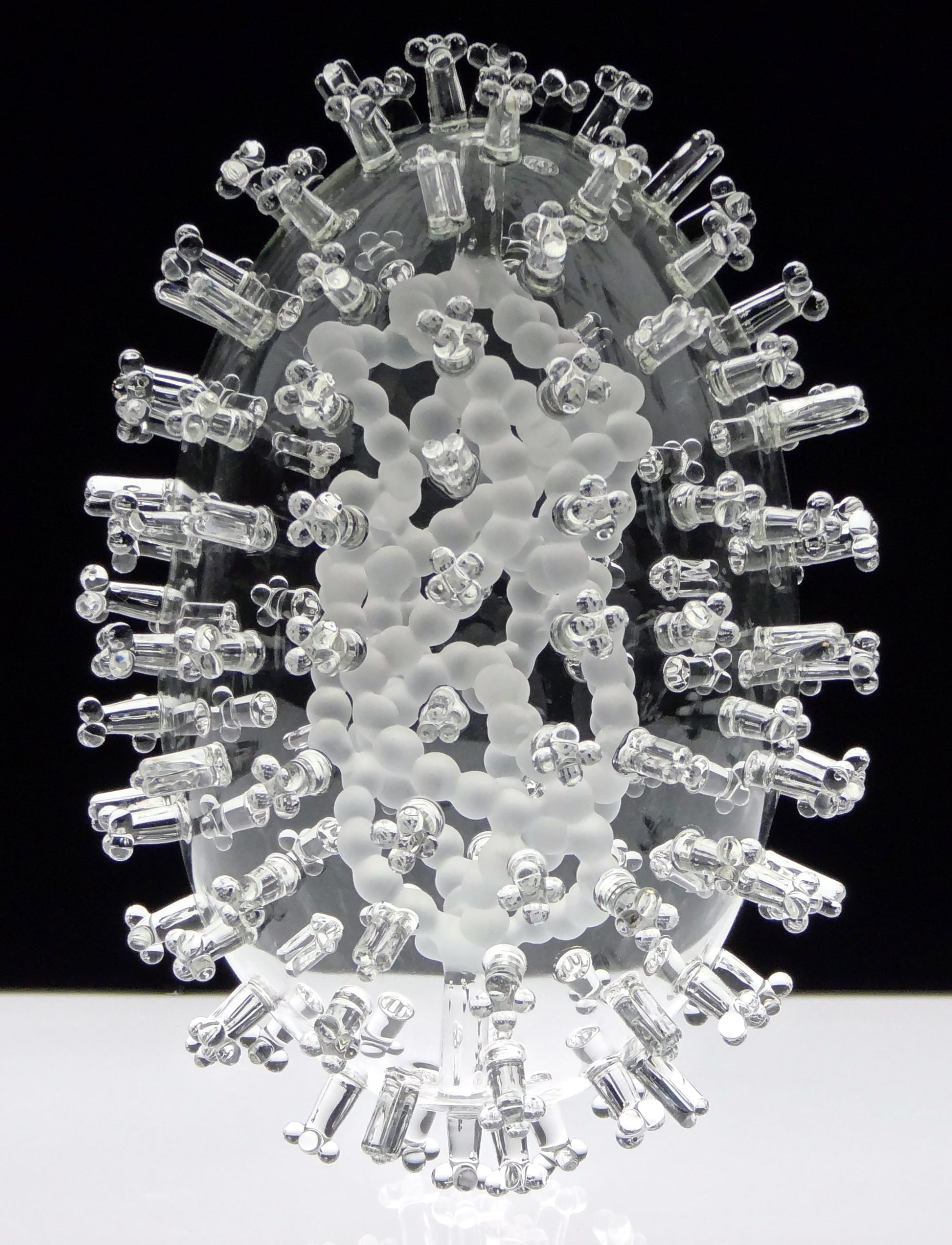 Bristol-based artist Luke Jerram (previously) continues to add delicate specimens to his Glass Microbiology collection. The ongoing project is a collaboration with scientists at the University of Bristol, who aid Jerram in scaling three-dimensional renderings of avian flu, papillomavirus, the AstraZeneca COVID-19 vaccine, and other tiny organisms into sculptures approximately one million times their actual size. Transparent and impeccably detailed, the models are designed to showcase the structures of each microbe without distorting the viewer’s perception with non-existent colors, which are often used to distinguish various parts in illustrated renderings.