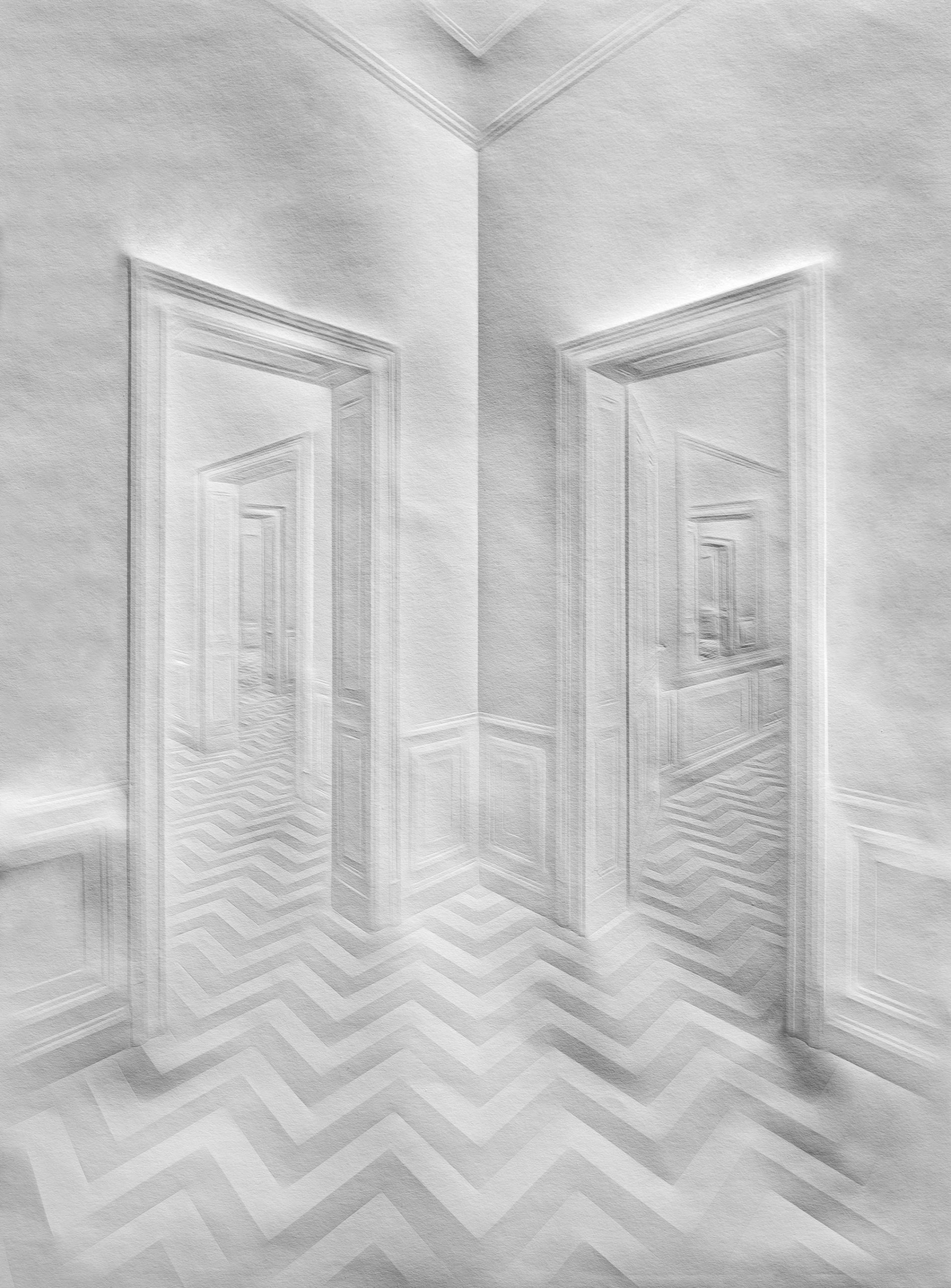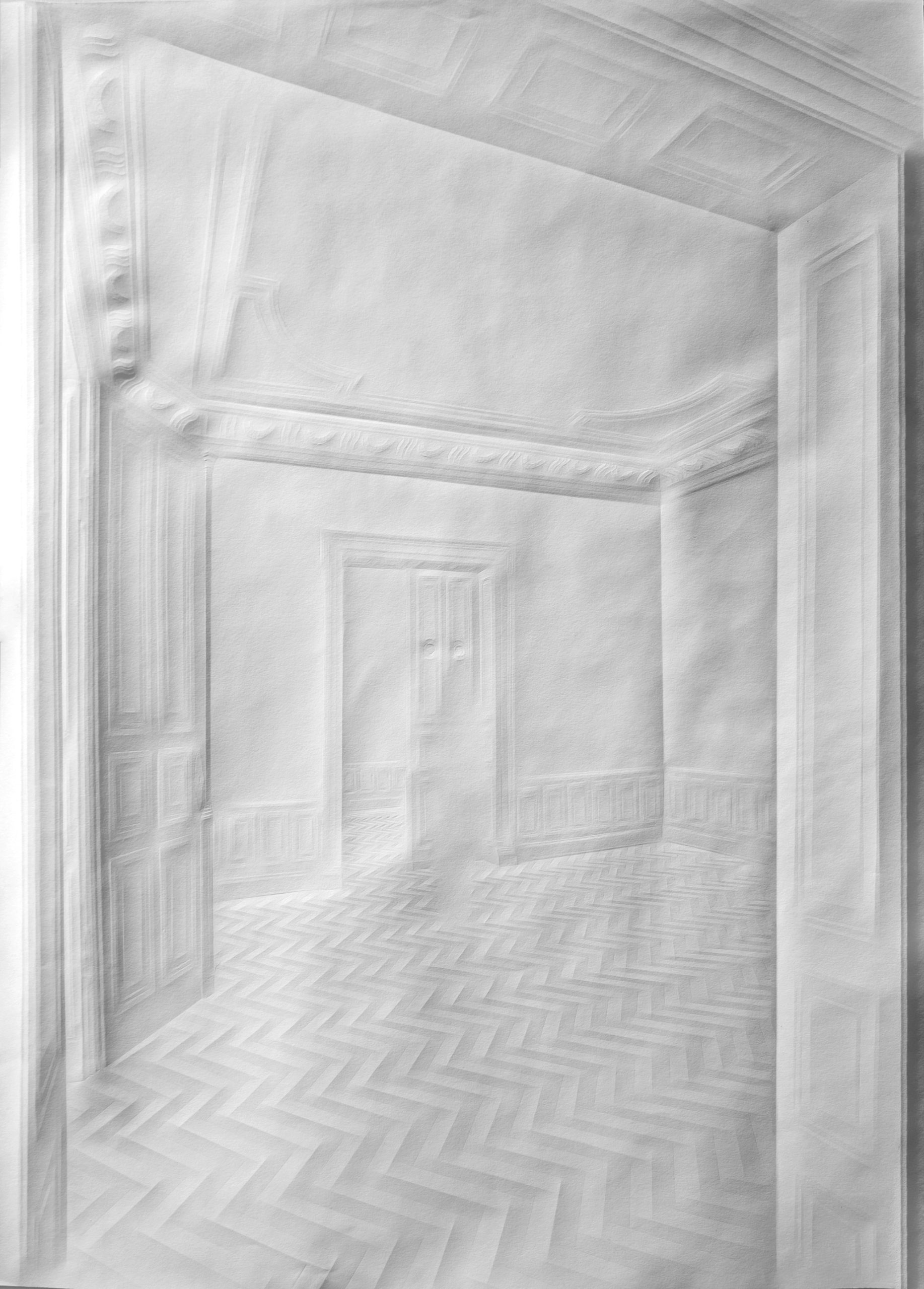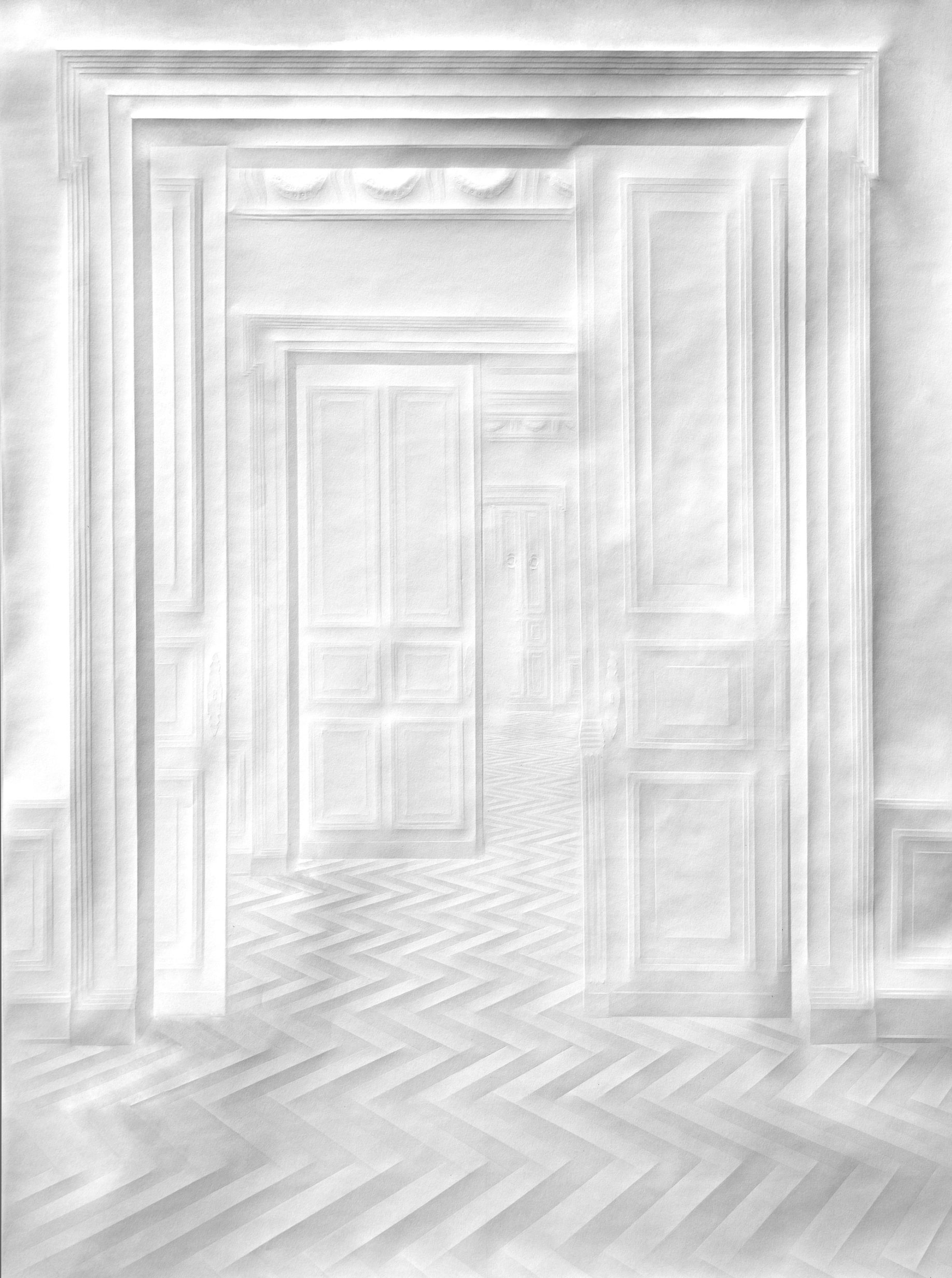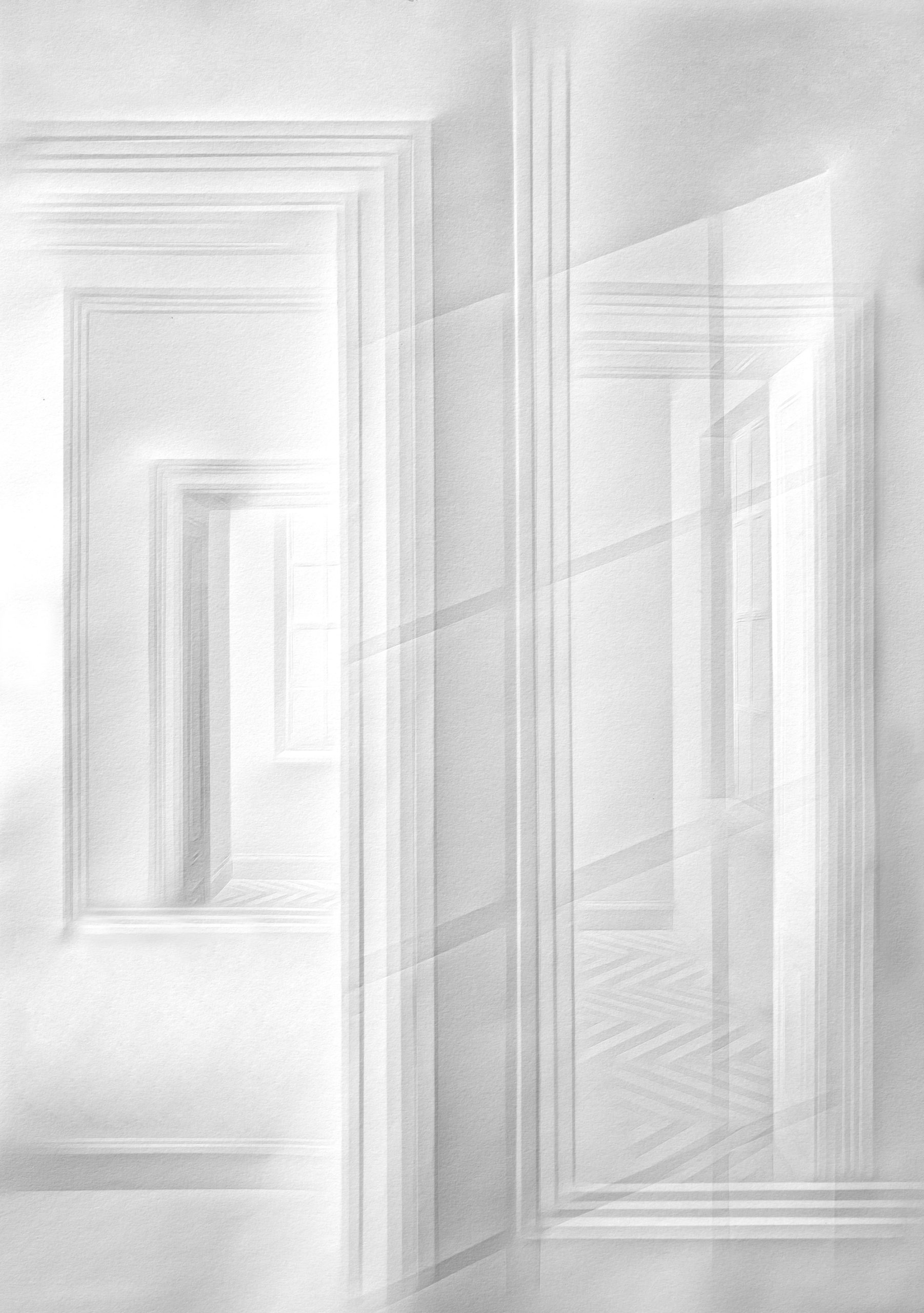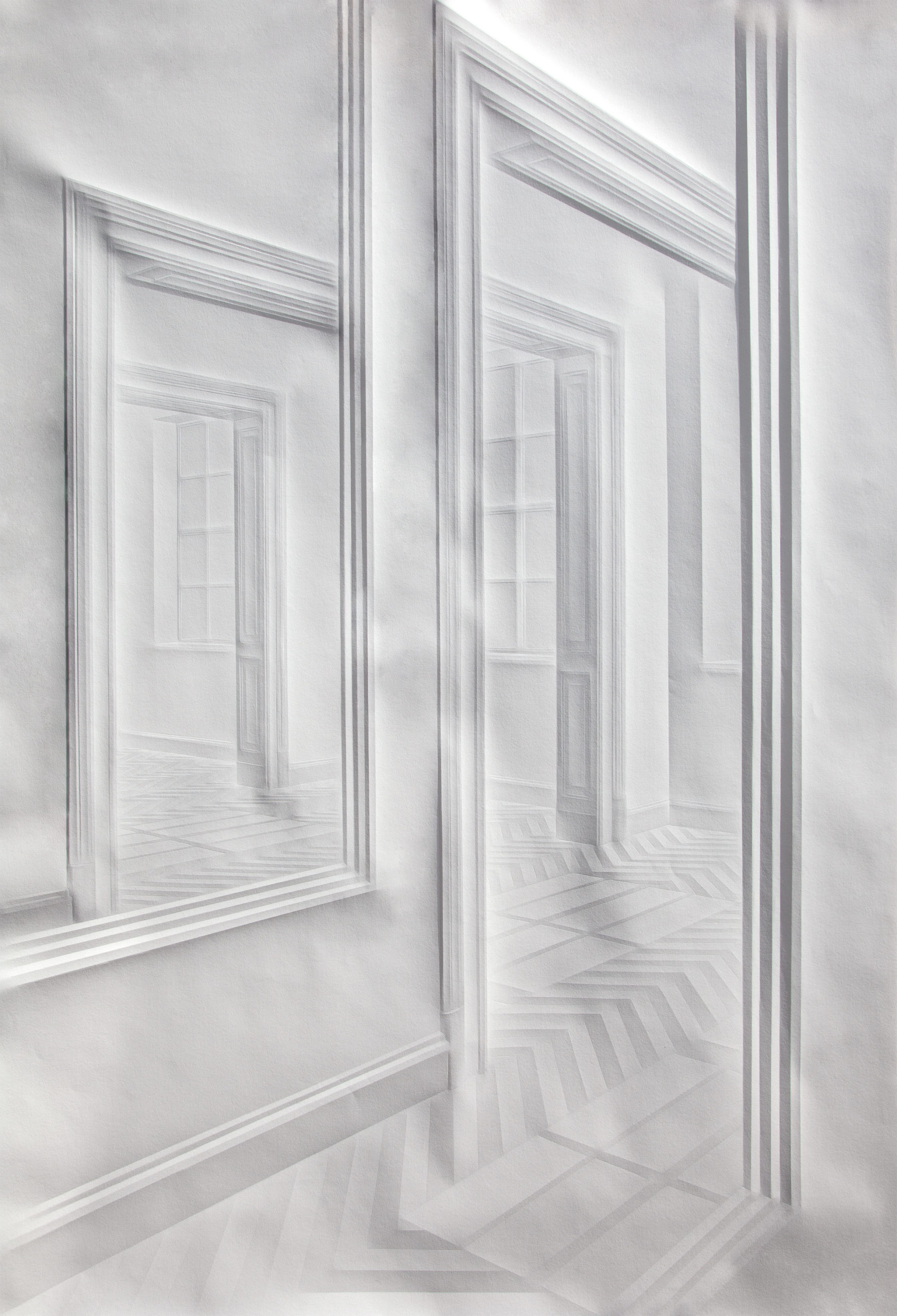 In Simon Schubert’s intricate folded compositions, bars of sunlight dash across door frames, ornate cornicing, and parquet floors in a complex interplay of geometric forms. Relying exclusively on the way light rakes across the surface of paper, the Cologne-based artist meticulously folds single sheets to precisely render the angles and perspectives of architectural interiors.