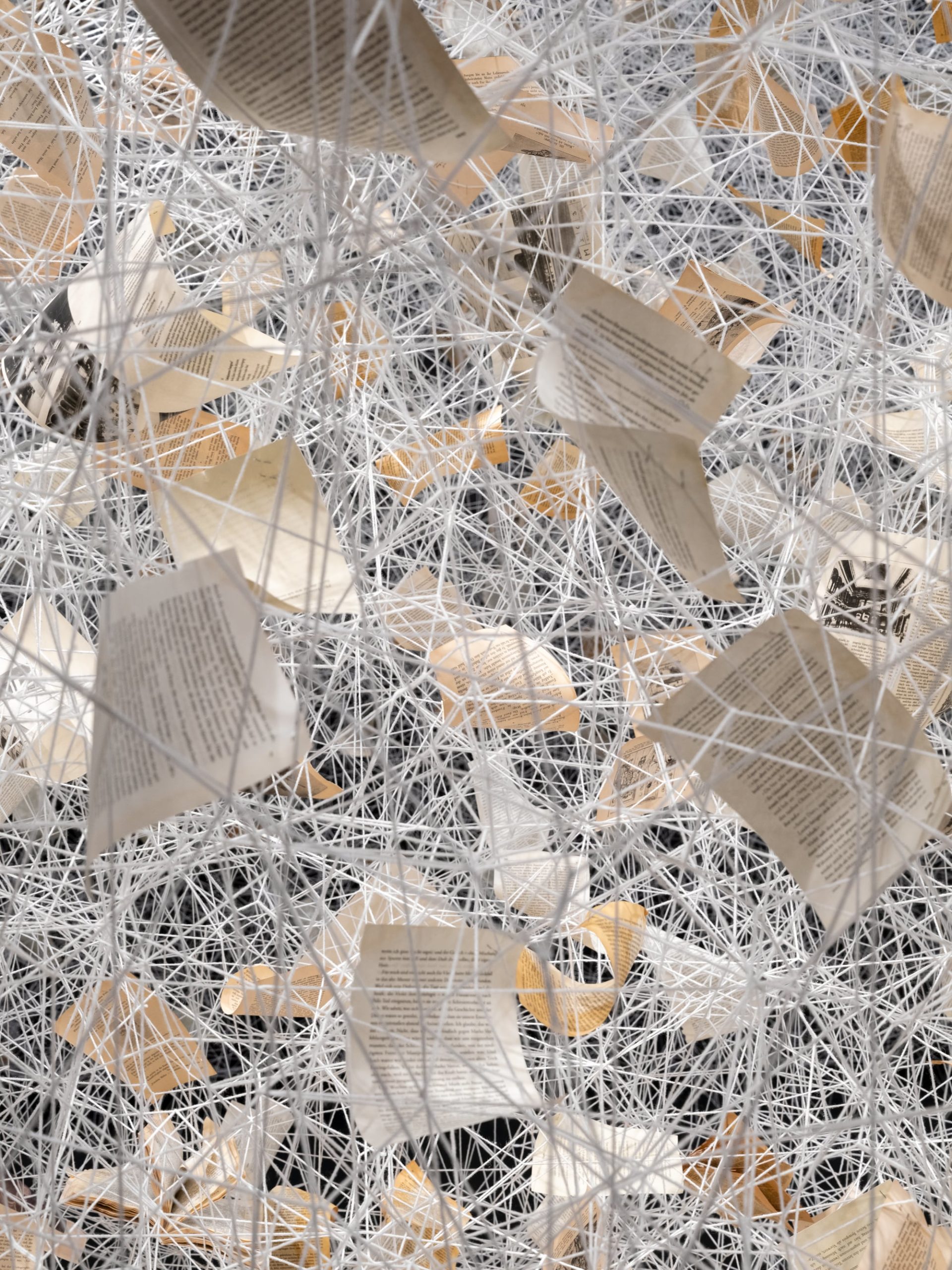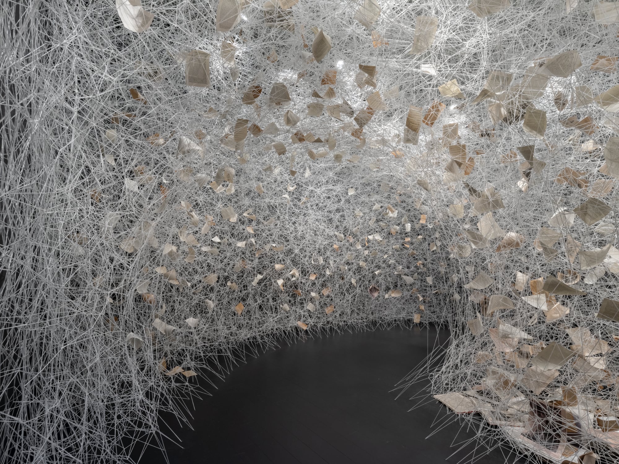 In Signs of Life, a dense installation of knotted and wound string fills much of Galerie Templon’s New York space. The work of Japanese artist Chiharu Shiota (previously), the solo show transforms the gallery into a monochromatic labyrinth of intricate mesh that ascends from floor to ceiling. Shiota considers the multivalent meaning of the web, from the structure of neural networks within the human brain to the digital realm today’s world relies on.