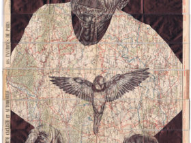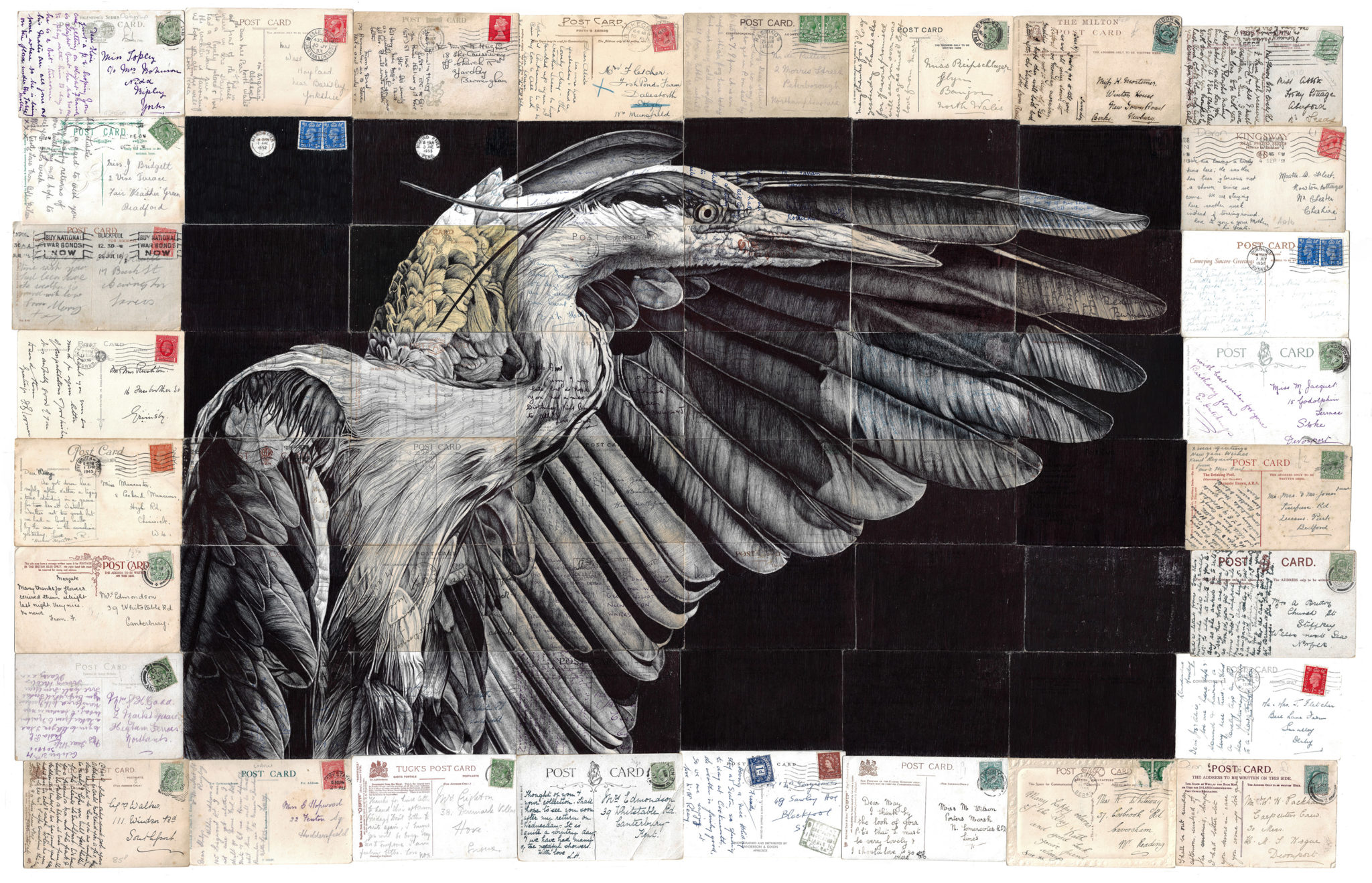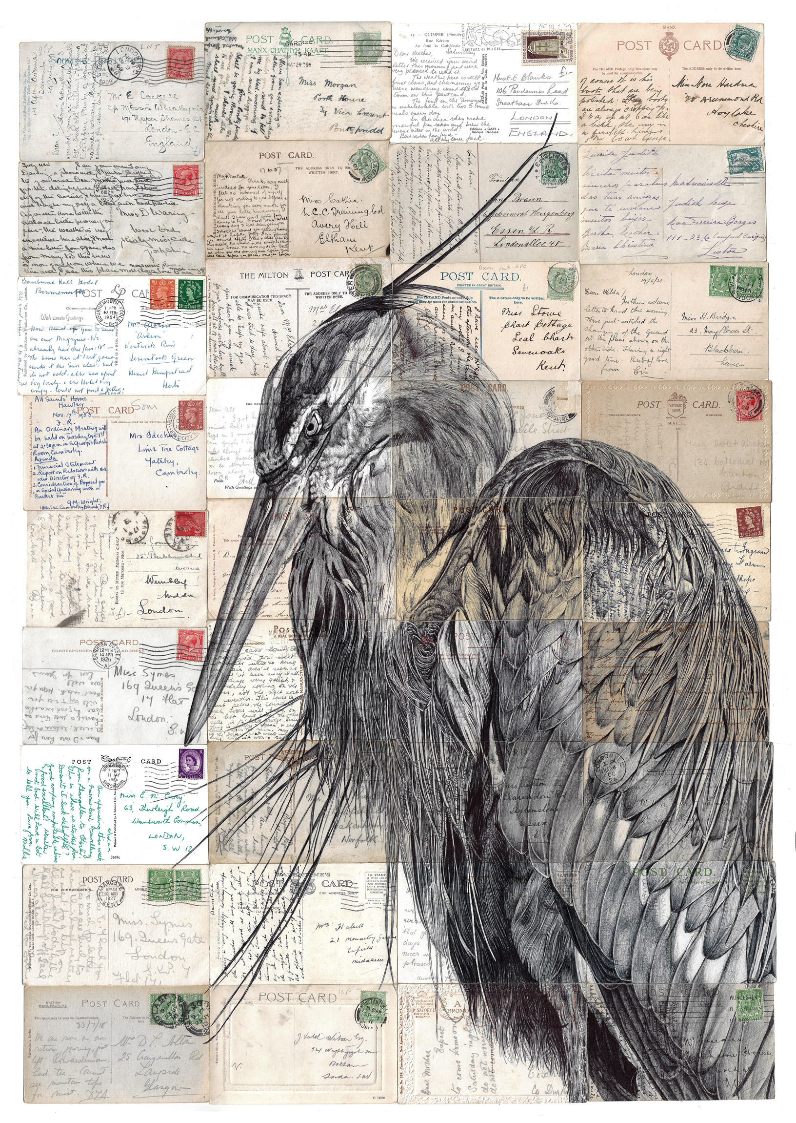 From playing cards and posters to envelopes and postcards scrawled with notes, the untraditional canvases holding Mark Powell’s artworks are tapestries of memories and experiences past. The Brighton-based artist (previously) sutures scraps of vintage ephemera and draws in ballpoint pen, rendering intimate portraits, birds, and scenes brimming with emotion in realistic detail. Some of his most recent works include monochromatic etchings that capture a heron’s fine, wispy feathers and a diptych of hands, two softly grasping a tulip and another wrapped taught in a rope.
