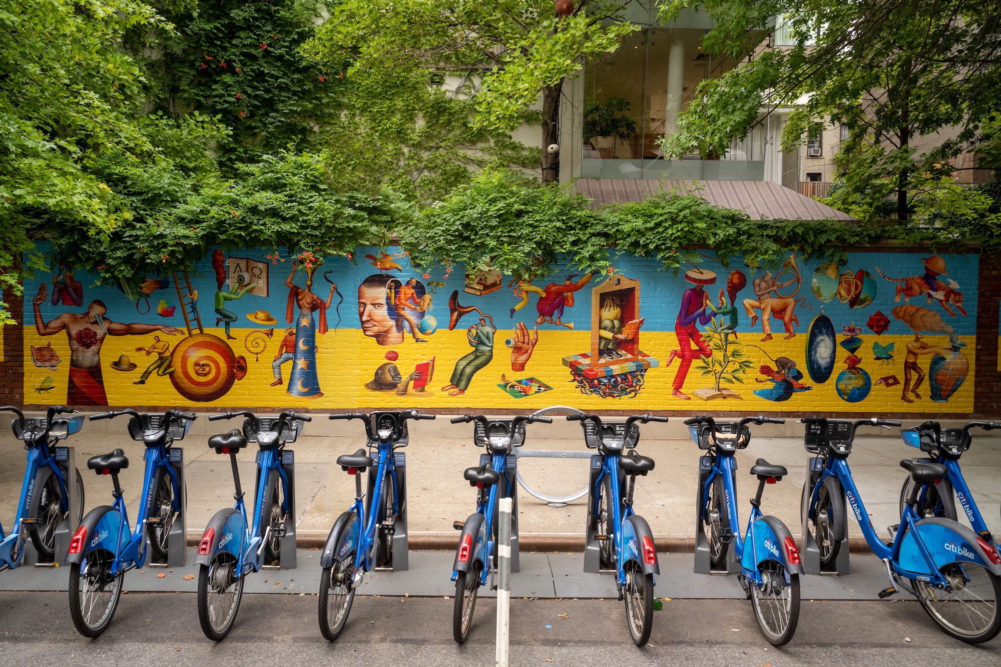 Based in Kyiv, WAONE travels around the world to participate in festivals and complete large-scale, collaborative commissions that highlight the complex relationship between humans, the environment, and the world we’ve made. A new mural in New York City’s Ukrainian Village gathers dozens of the artist’s colorful personalities and esoteric symbols together in one 48-foot-long composition. Backed by the colors of the Ukrainian flag, “From Legend to Discovery” marks the one-year anniversary of Russia’s war and highlights Ukrainians’ resiliency, courage, and their hope for victory.