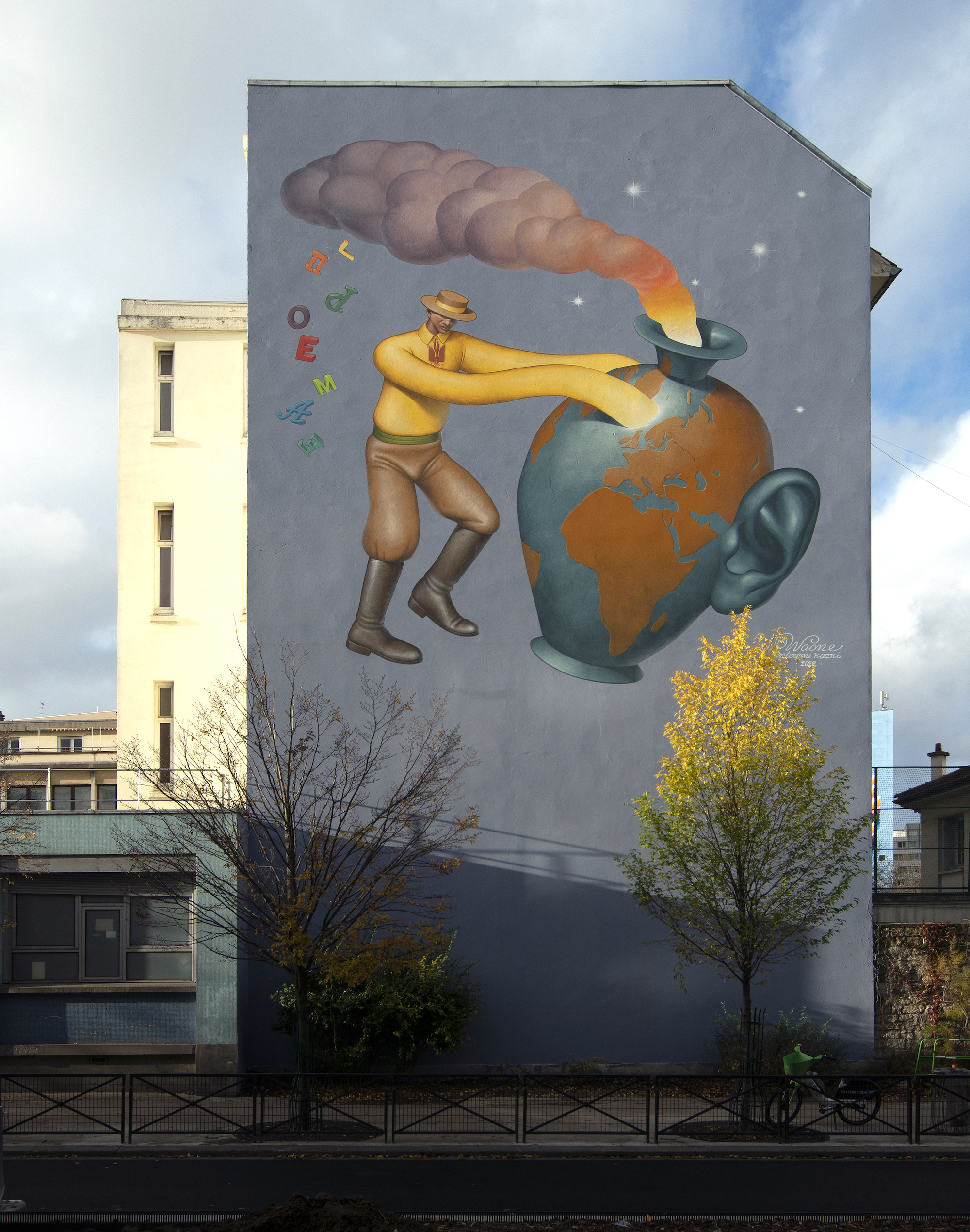 Enigmatic characters sprout blossoms from their torsos, wear instruments for hats, or hitch a ride on a tiger’s back in the surreal murals of Ukrainian artist Vladimir Manzhos, a.k.a. WAONE. Drawing inspiration from religious iconography, history, and botany, his mysterious narratives often touch on themes of ecological apocalypse, cosmology, and duality. Uncanny interactions between people and an array of objects like plants, books, and anthropomorphized objects portray fantastical creatures or seismic events.