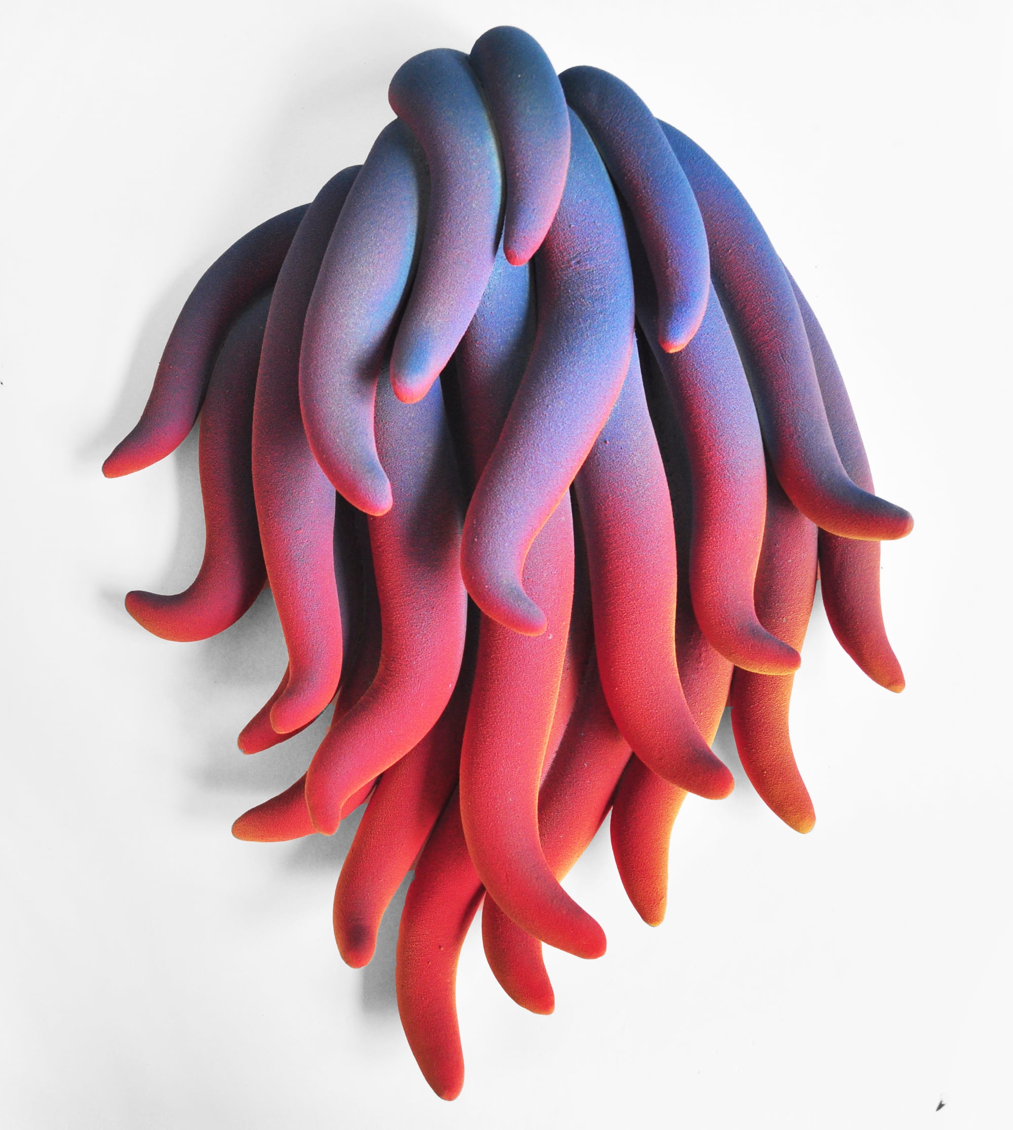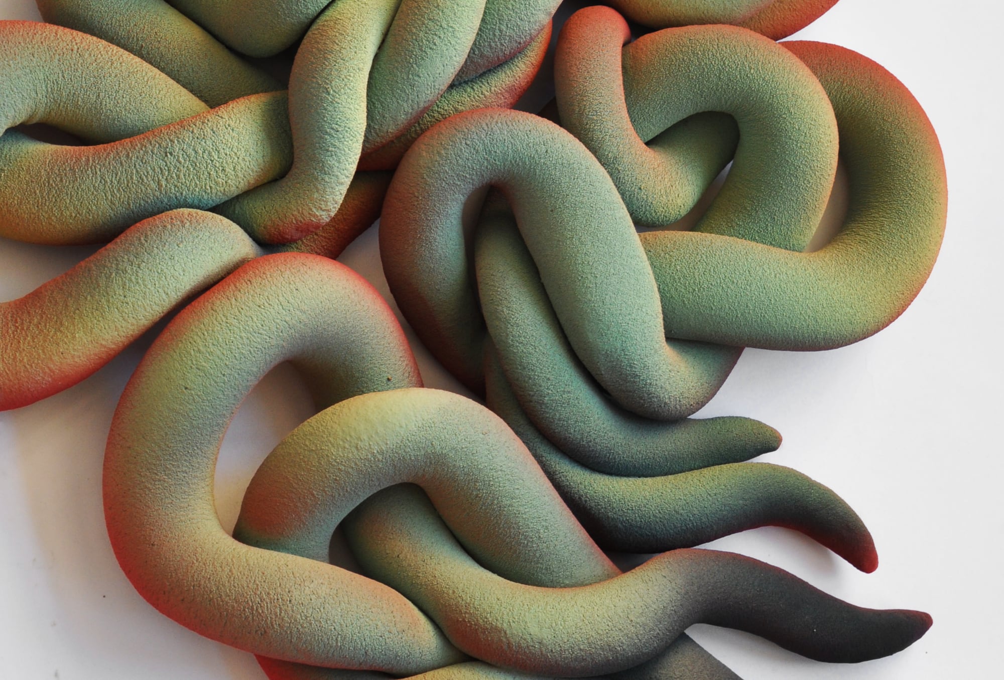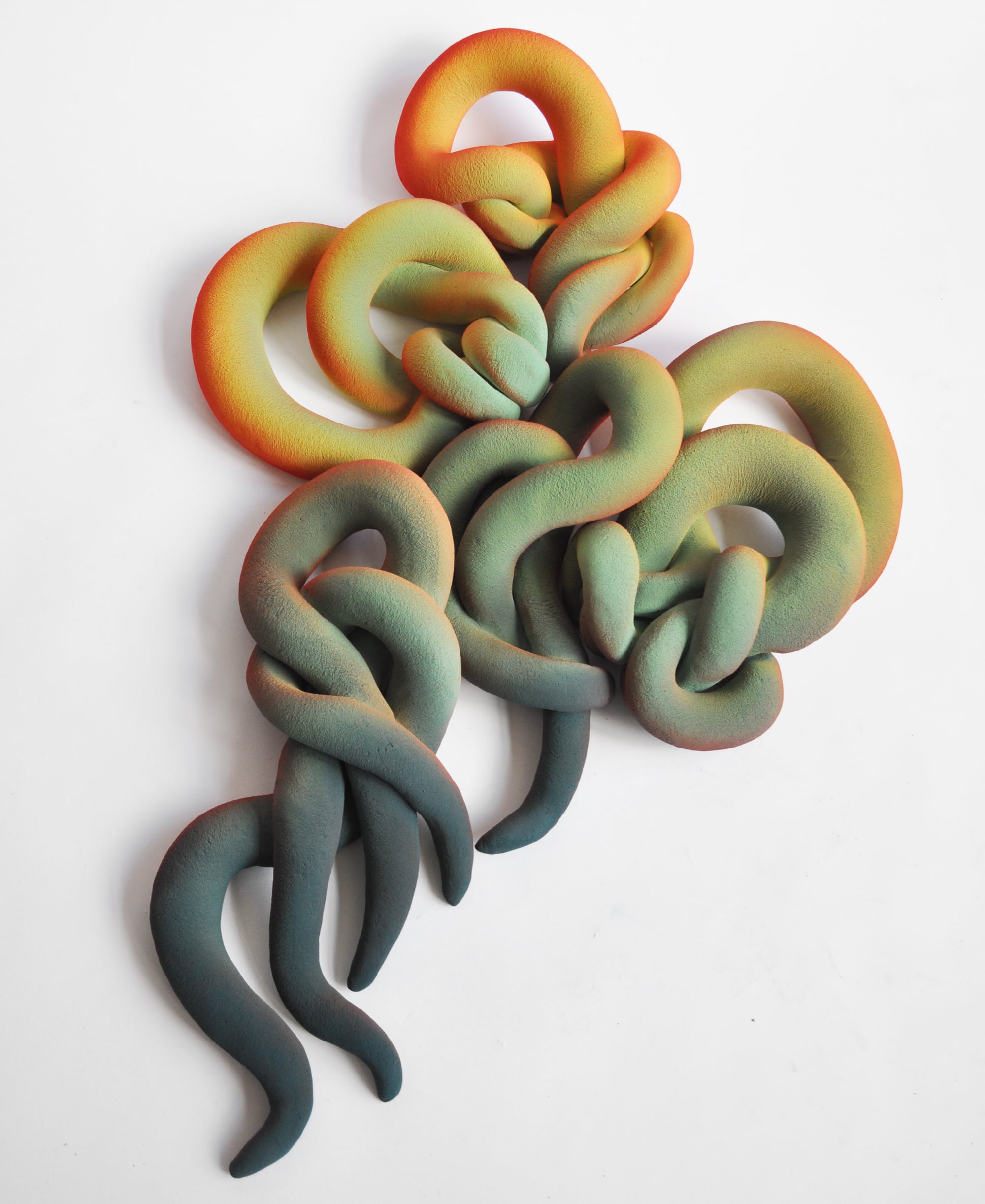 Although fixed in glazed and fired ceramic, Claire Lindner’s voluptuous sculptures are primed for movement as they appear to crawl along walls or sprout upward like the leaves of a plant. Mimicking the spongy texture of living specimens like fungi, sea moss, and roots, the works embody several dualities from hard and soft to stasis and growth. The lively pieces also reference the relationship between biological processes and human intervention, as the artist (previously) sculpts organic forms and covers them with unnaturally bold gradients.