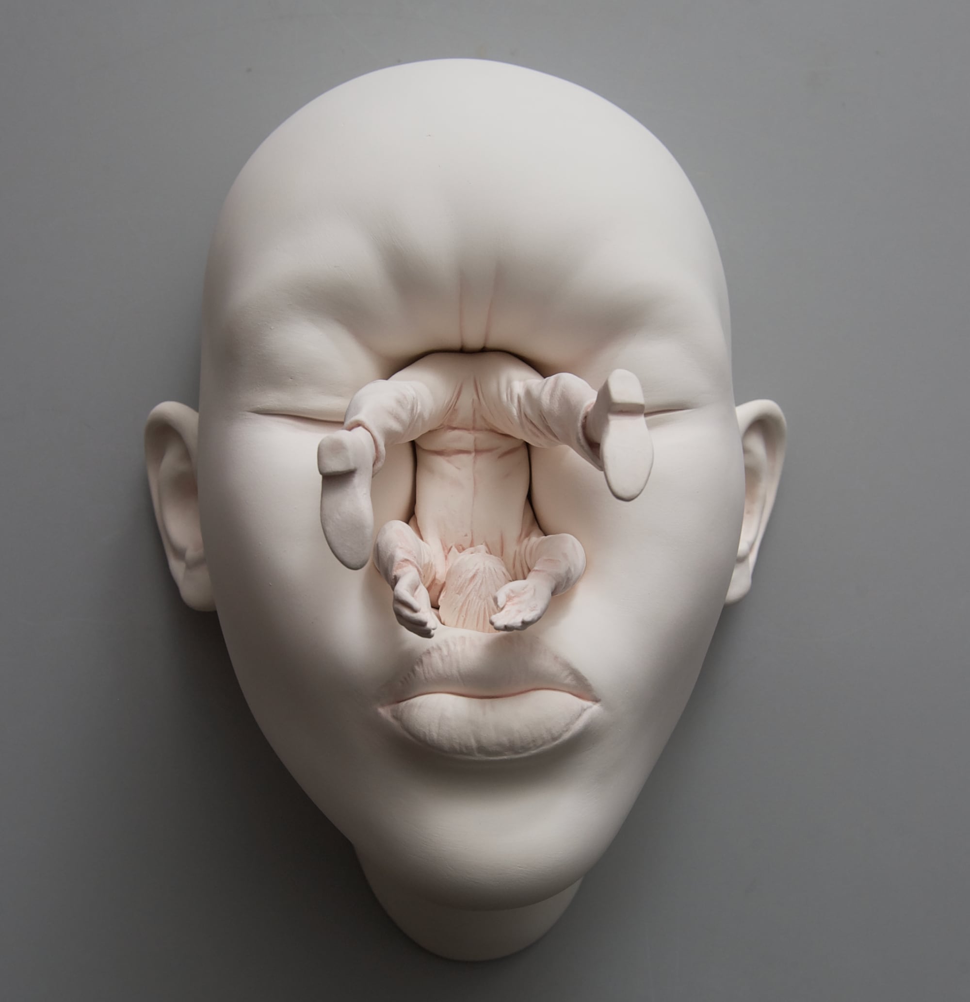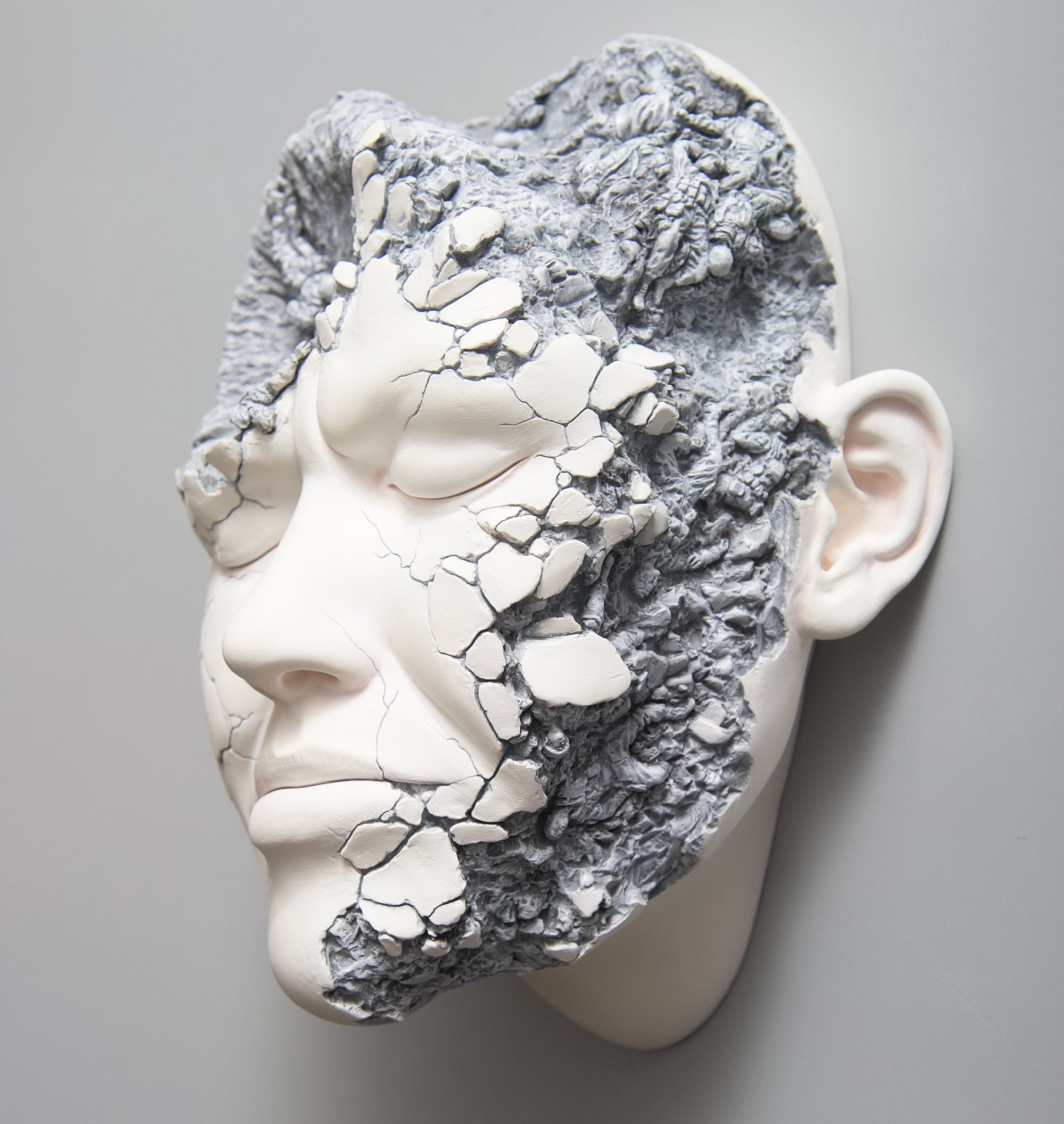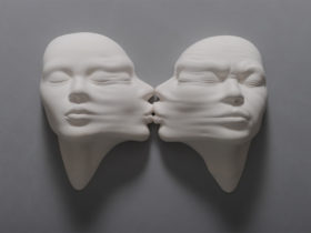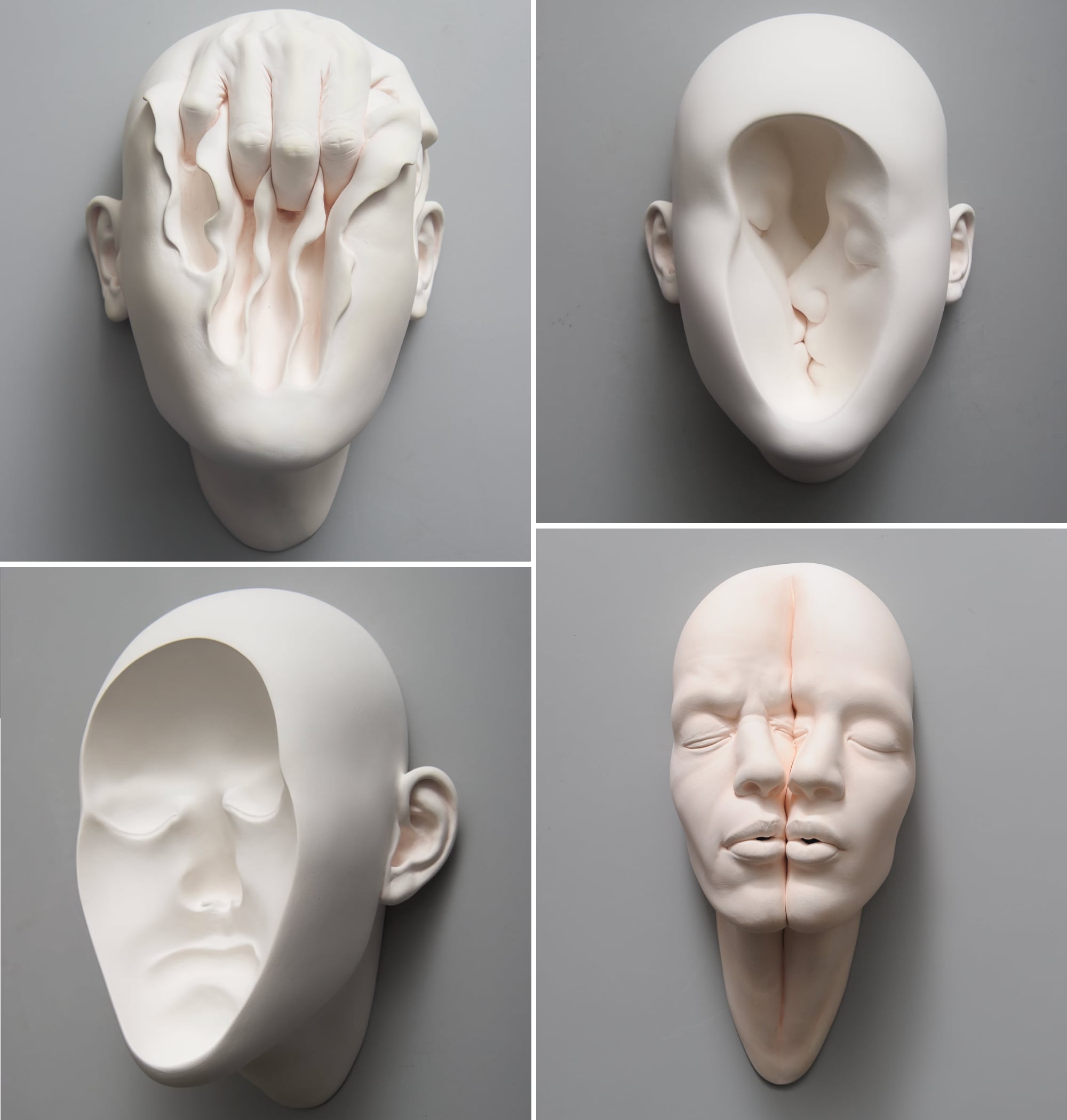 The artist’s Lucid Dream series frequently presents facial features as cushions with “Comfort Zone” and “Impressed” both featuring slumbering figures squashing the nose and forehead. Other works in the collection are more unsettling and use rubble, duplicates, and aggressive hands to warp the forms. The sculptures reflect Tsang’s own pursuit of spiritual growth and recognize the need to “stop the inner war and face everything that happens with peace.”