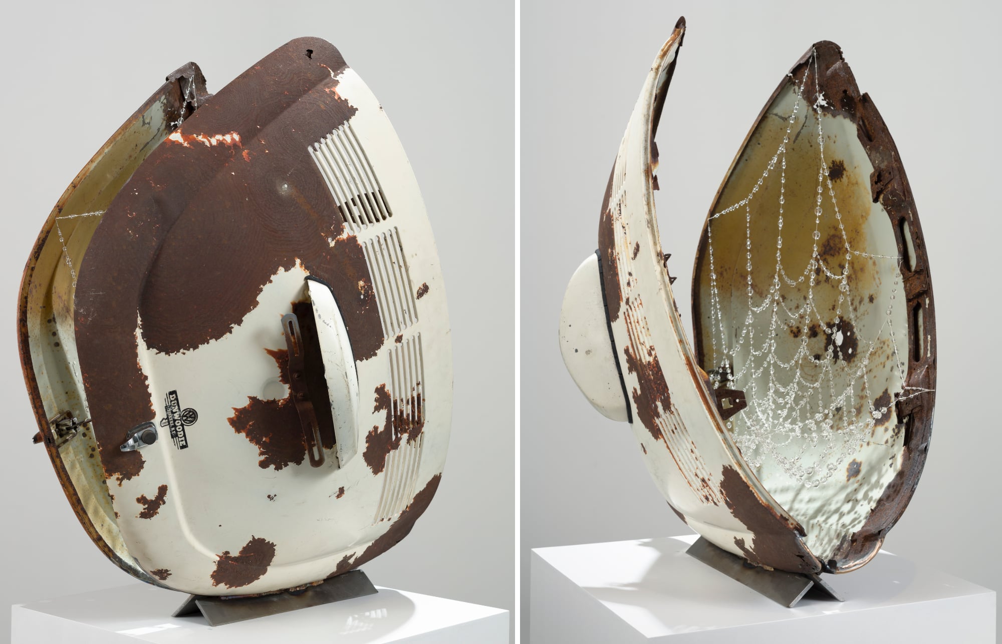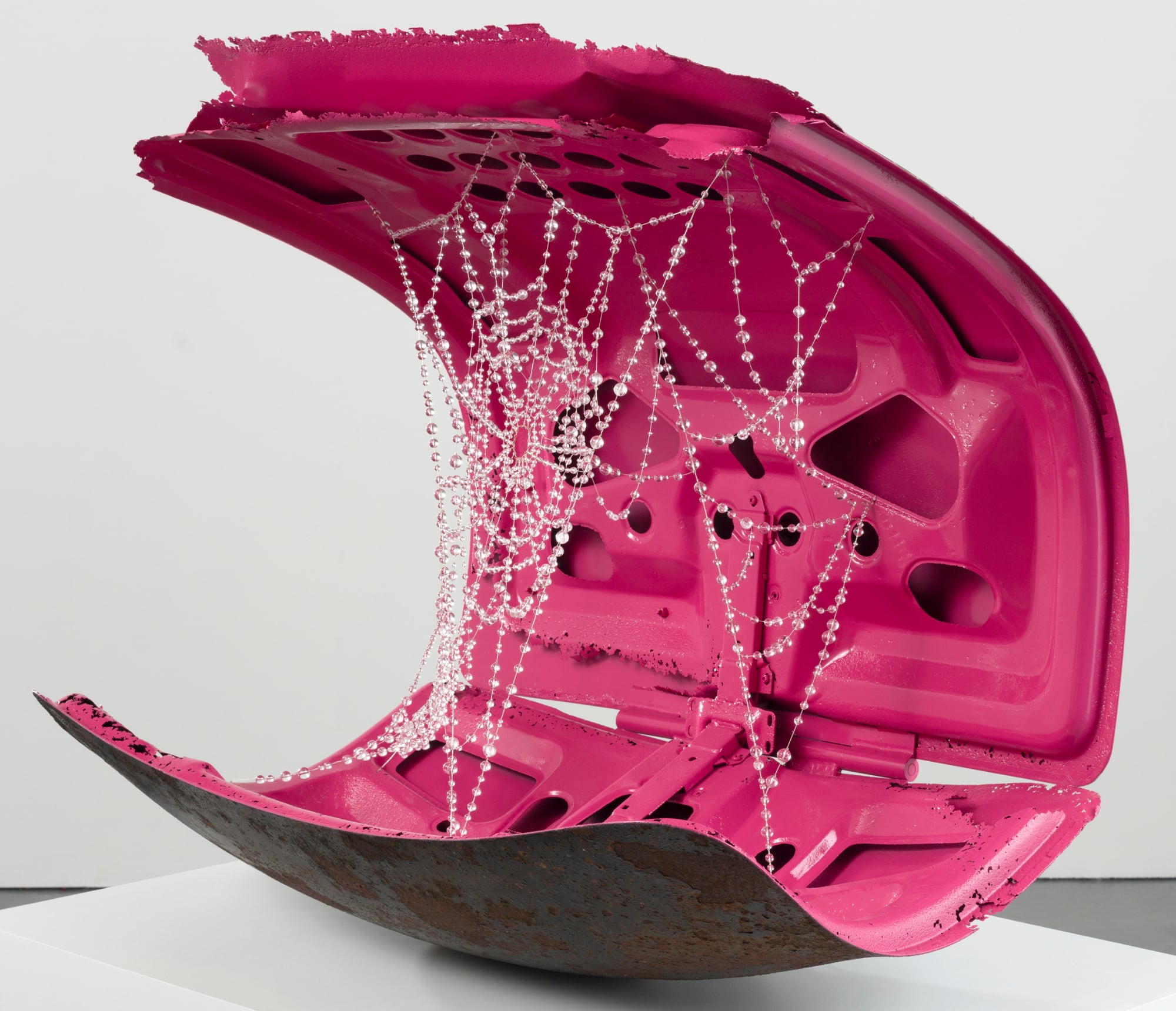 “Generator VIII” (2023), quartz crystal, silver-plated stainless steel cable, silver crimps, steel, automotive paint, Dodge trunks, 38 x 32 x 41.5 inches
