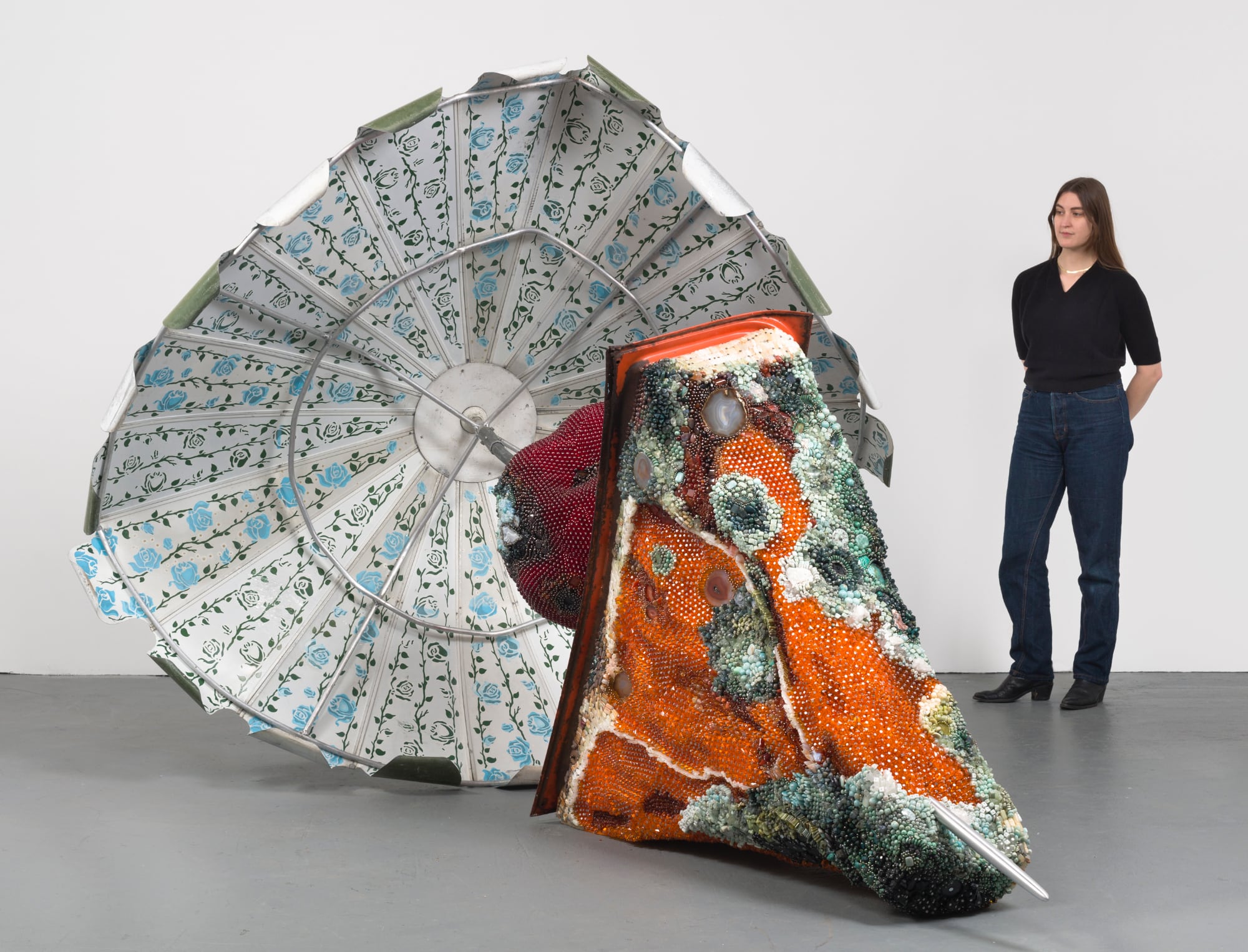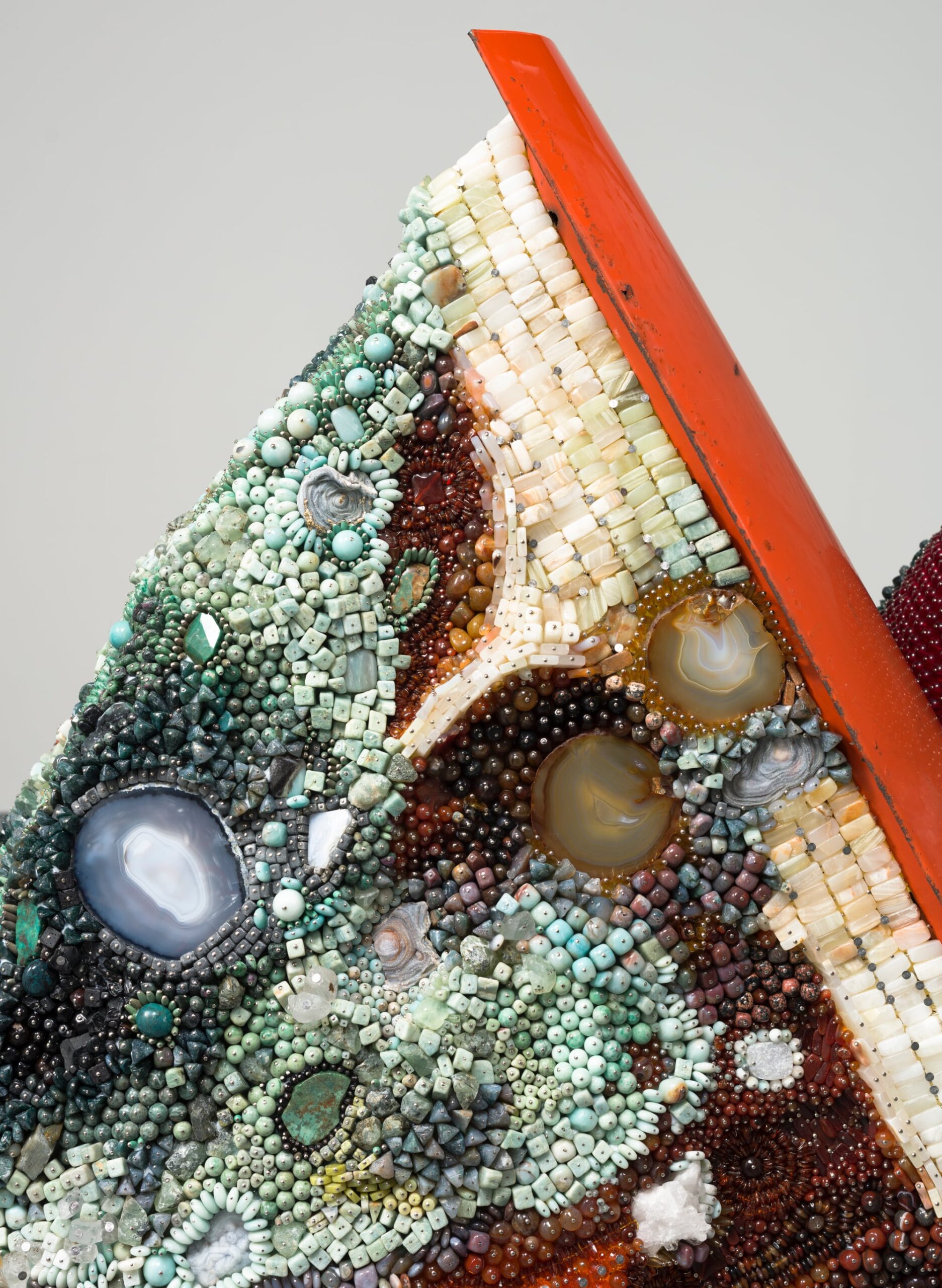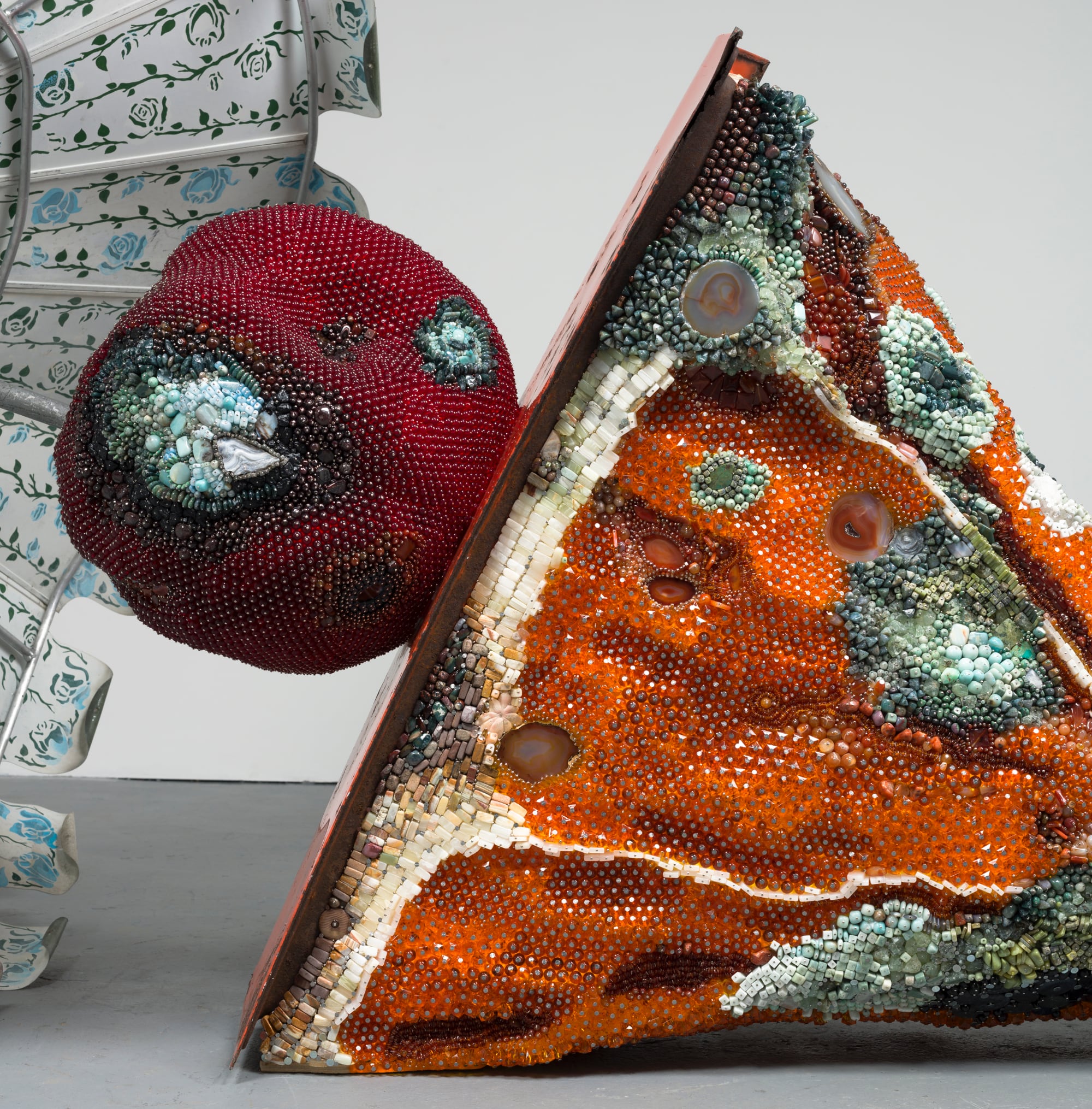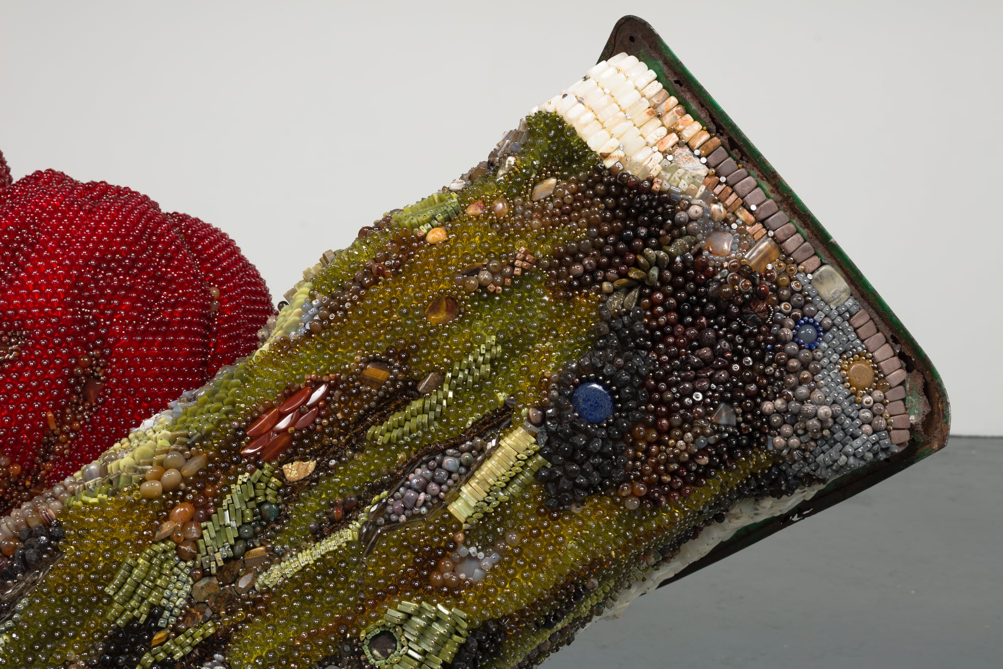 Skewered fruits, beach umbrellas, and automotive parts exemplify this relationship between the beautiful and the grotesque through the artist’s signature gemstone treatment. Cobwebs of glimmering quartz crystal tether one side of a rusted Dodge trunk to the other, while precious materials like agate, lapis lazuli, and turquoise become the rotting patches of otherwise supple fare. Each of the sculptures references seaside objects and nostalgic coastal travel, whether through fruit garnishes as in “Deluxe” or the clam-shell folded Volkswagen trunks in “Generator VII.”