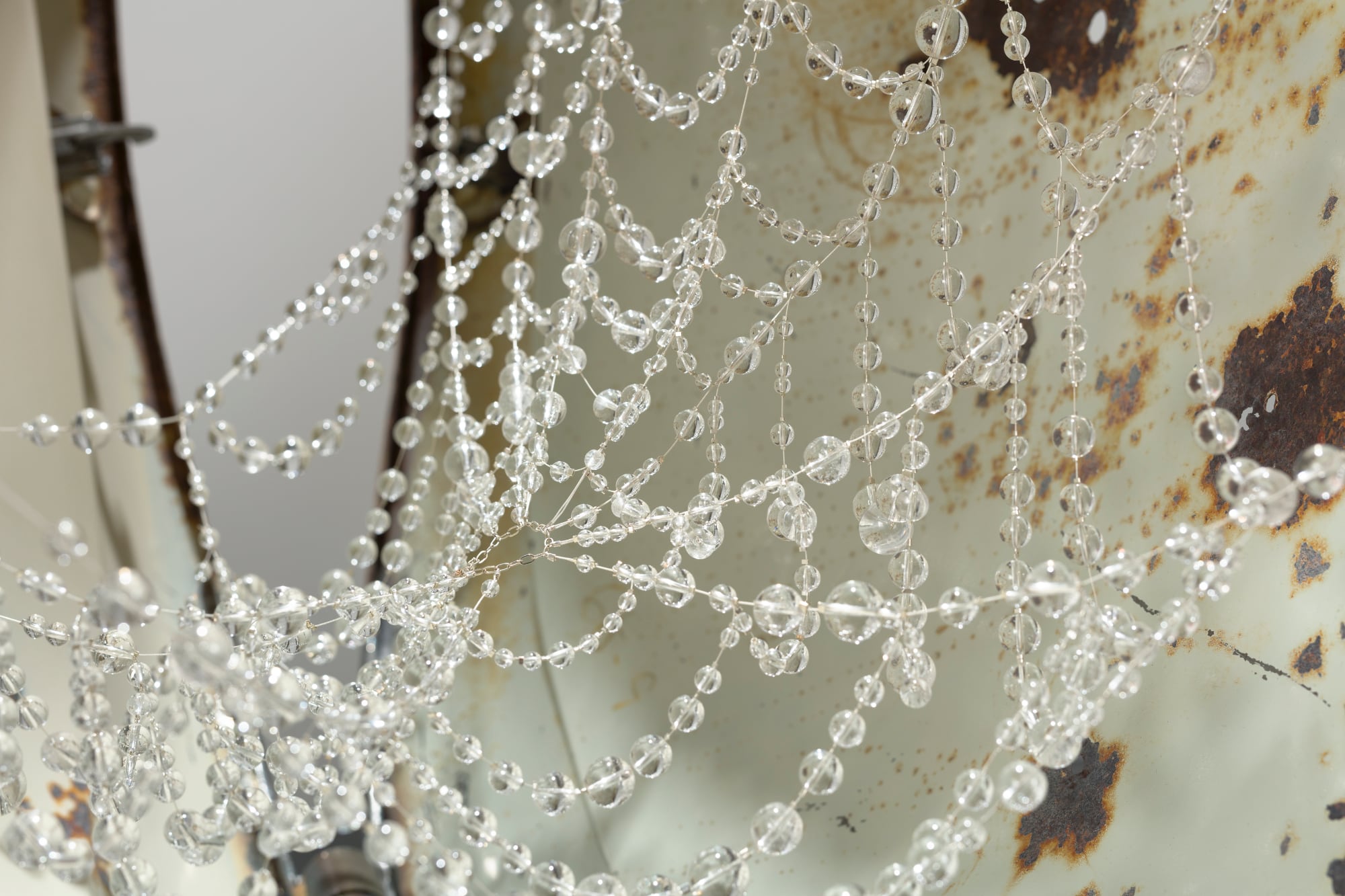 Detail of “Generator VII” (2023), quartz crystal, silver-plated stainless steel cable, silver crimps, steel, Volkswagen trunks, 38 x 33 x 32 inches