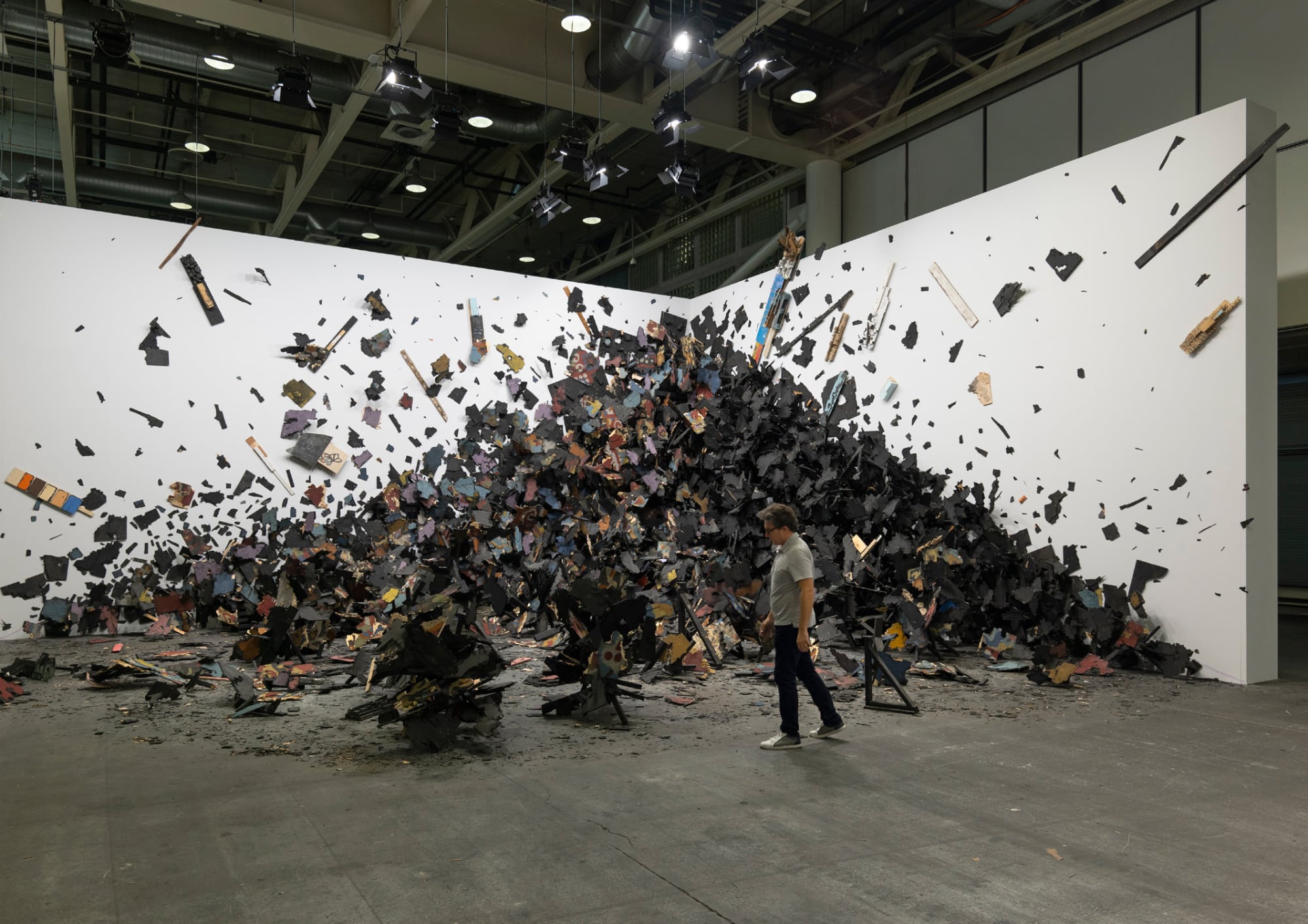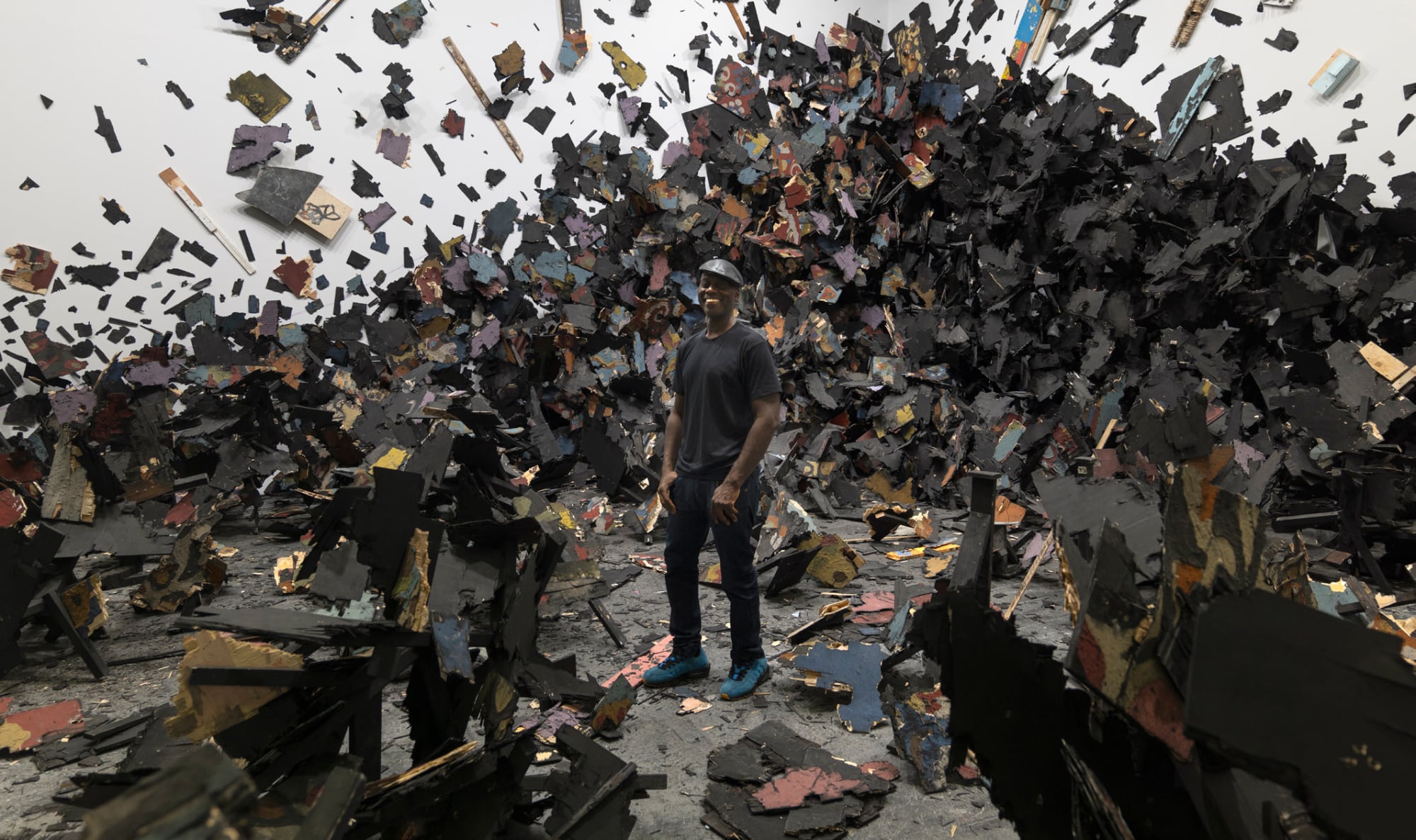 The artist Leonardo Drew, with “Number 341” (2022), Art Basel: Unlimited, Switzerland. Image © the artist and Jon Cancro, courtesy of Goodman Gallery, Galerie Lelong & Co., and Anthony Meier Fine Arts