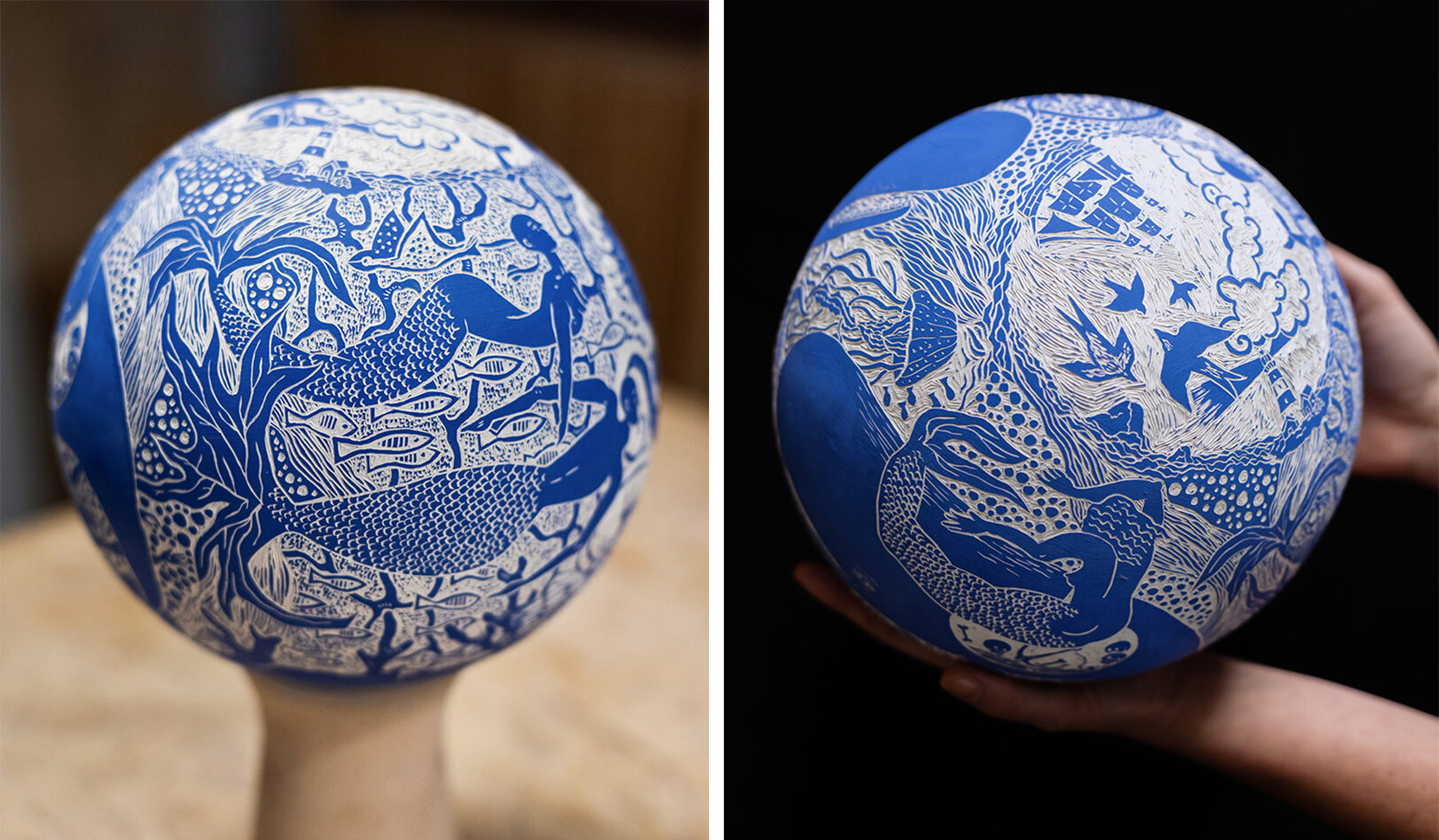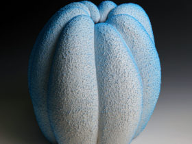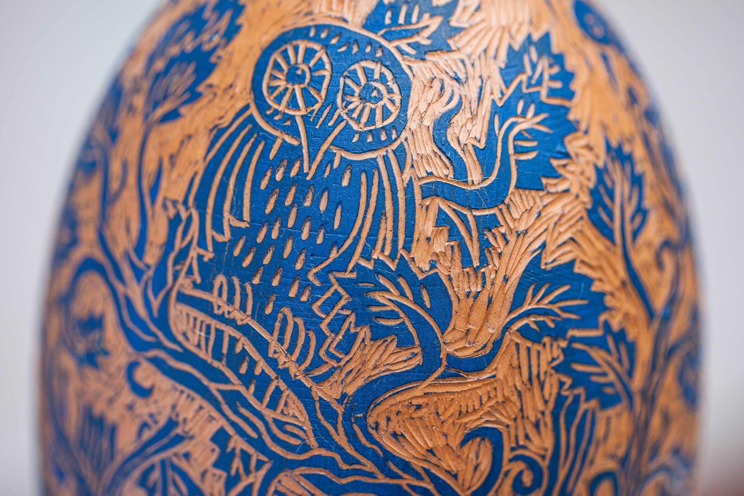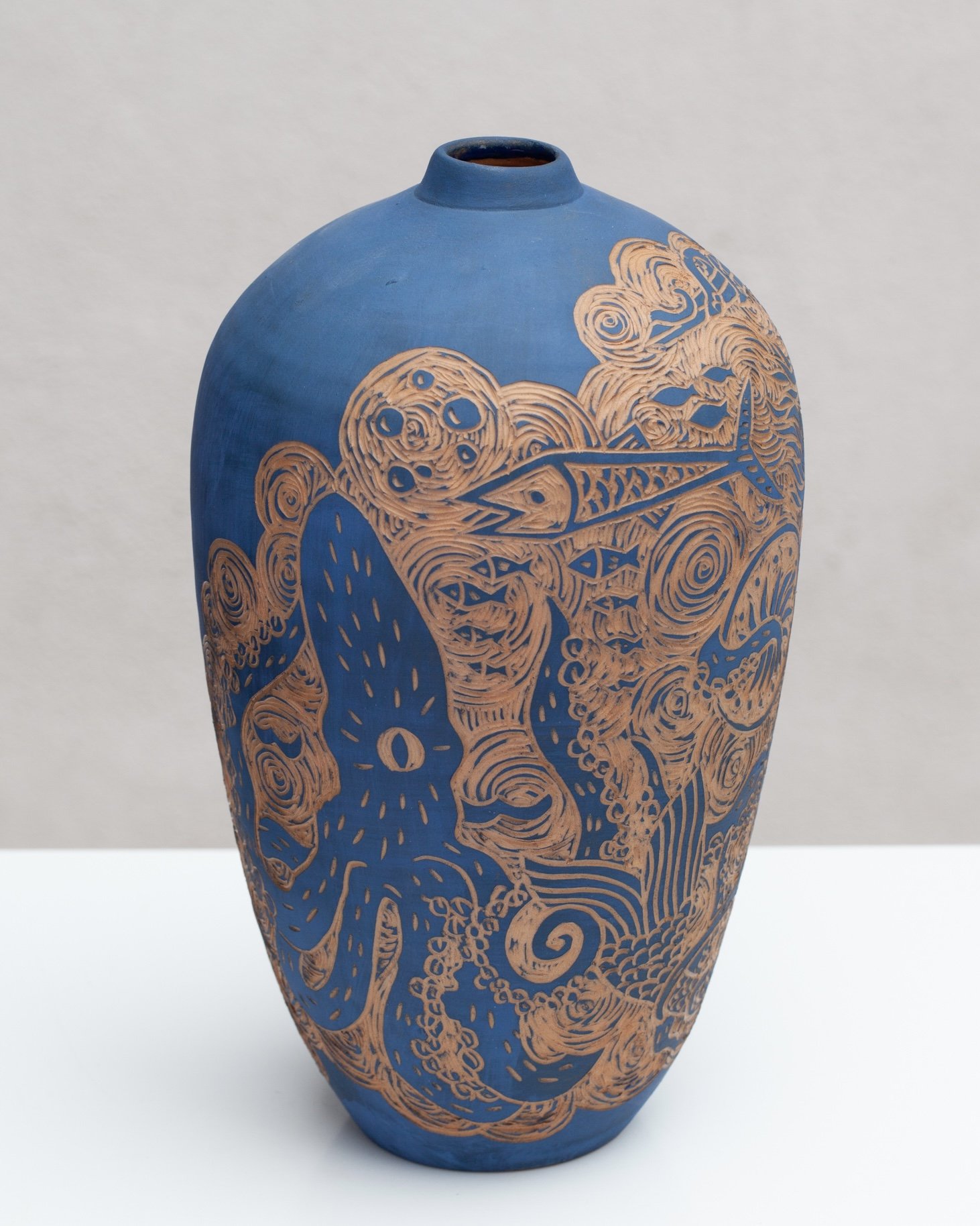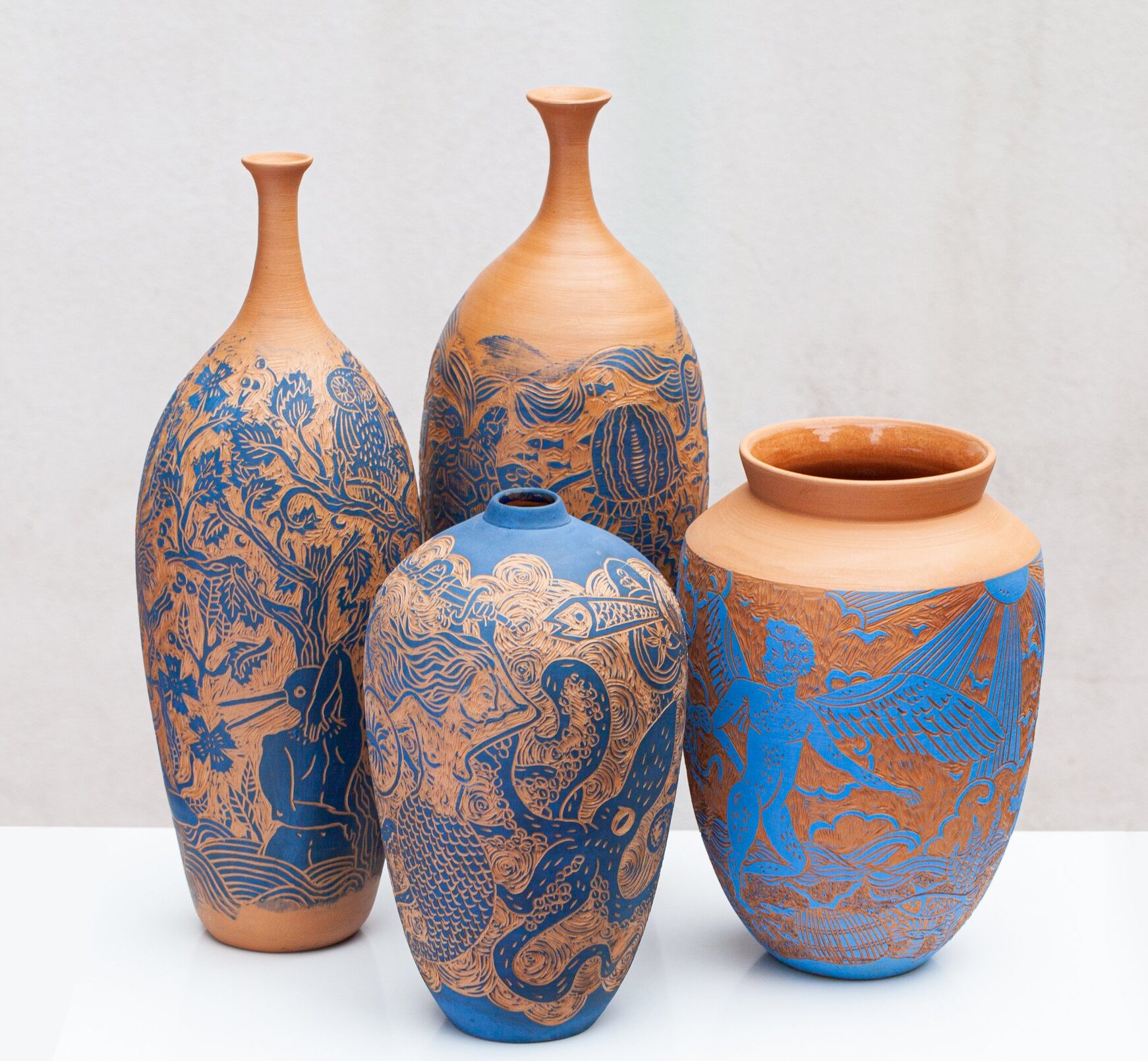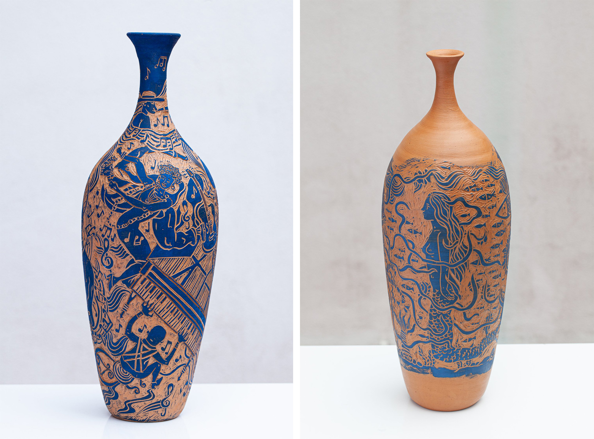Employing a traditional Italian pottery decoration technique called sgraffito, meaning “scratched,” Holt carefully incises shallow cuts out of the smooth surface of a glazed pot, revealing the outlines of figures, animals, plants, and landscapes. In her series Terracotta Blues, the characters exist within an undefined story that circle around tall earthenware vases, creating “dreamlike scenes and imaginary characters that leave room for interpretation.”