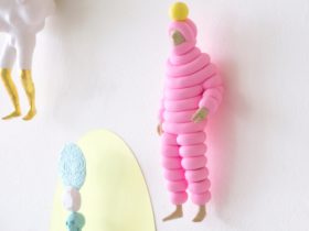 Bound with colorful cushions and twine, draped in chains of spheres, or sprouting a single leaf from their head, the characters that originate in Frode Bolhuis’s Almere studio embody the Dutch artist’s playful imagination and desire for experimentation. Part of an ongoing sculpture project, the expressive cast is currently comprised of 117 miniature figures made primarily of polymer clay with wood, fiber, and metal additions, each of which has a distinctive personality.