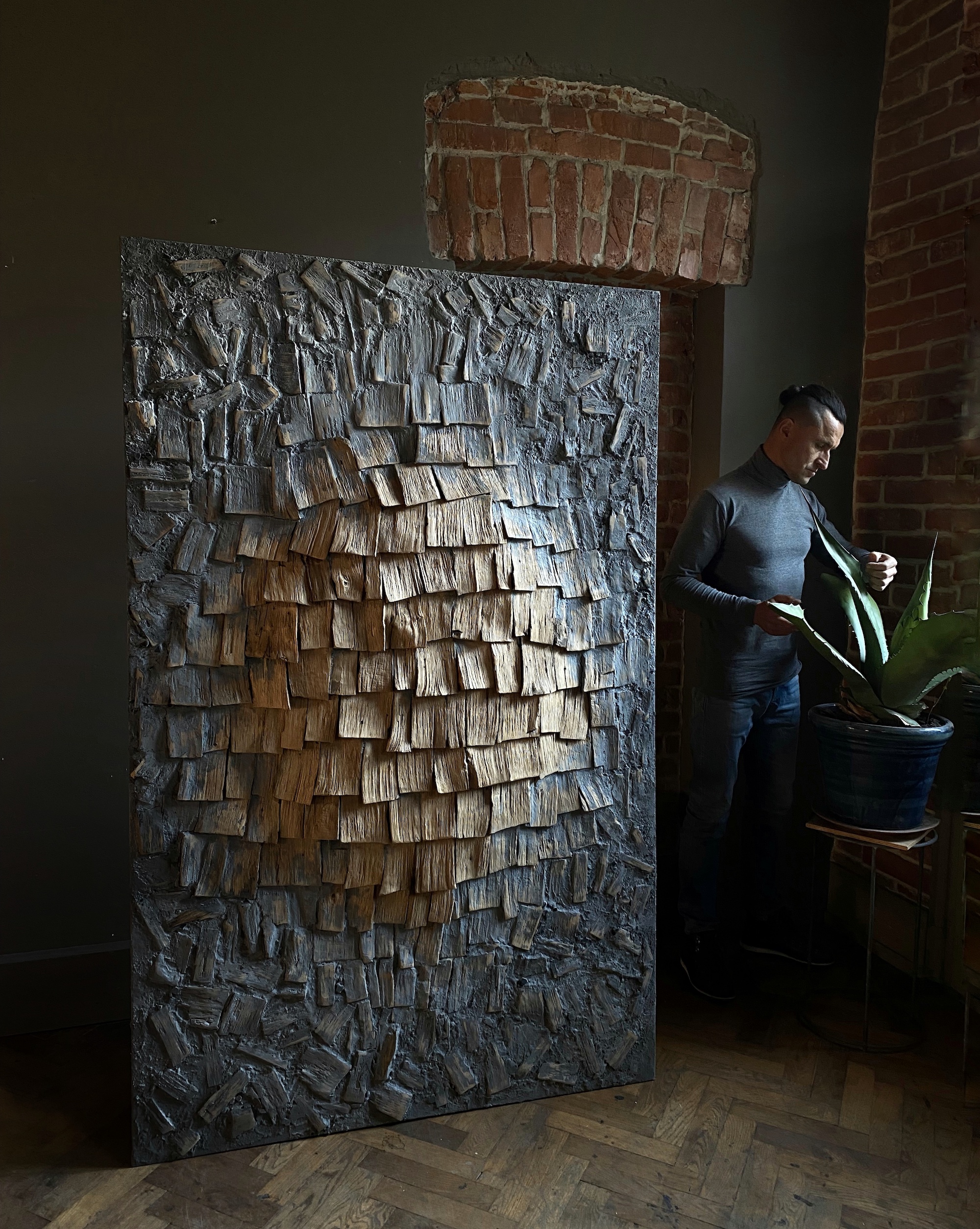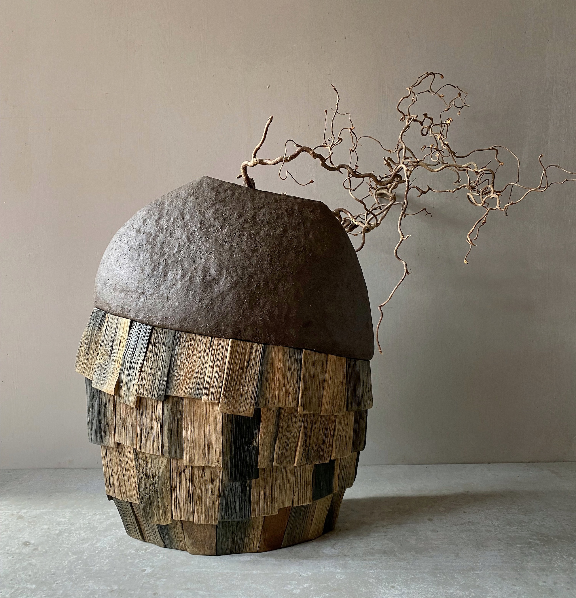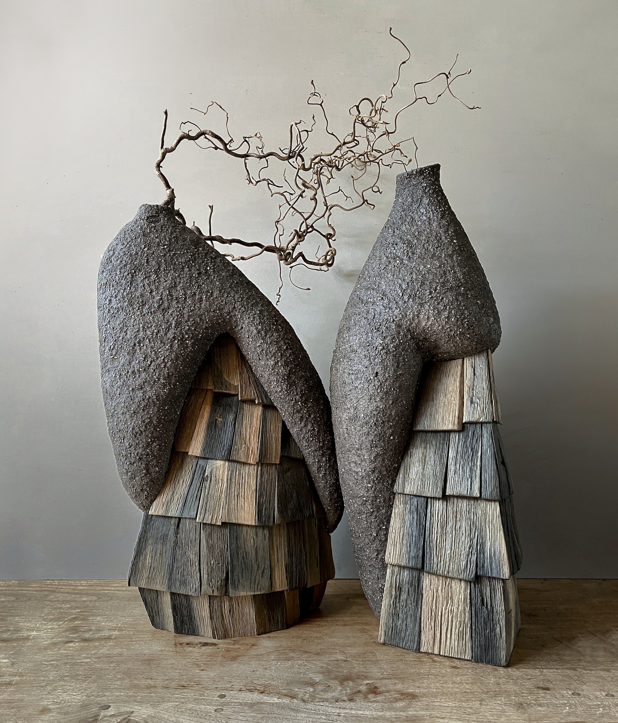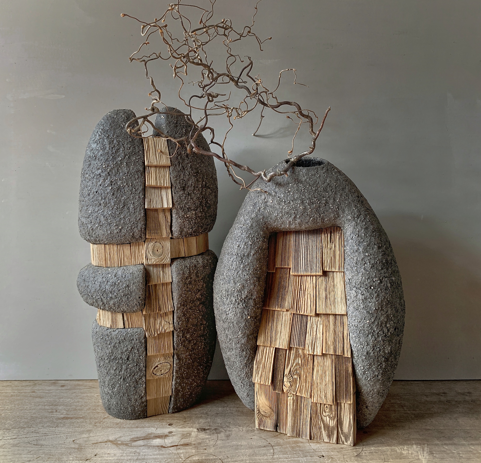 While many pieces are presented series—such as Gonta, which often features old oak shingles nestled into cushion-like clay forms—each piece is unique. “The inspiration for the vases comes from both ancient Carpathian architecture and modern bionic design,” reads a statement. “The use of old shingle roofs that have their own history adds a sense of nostalgia and a connection to the past.”