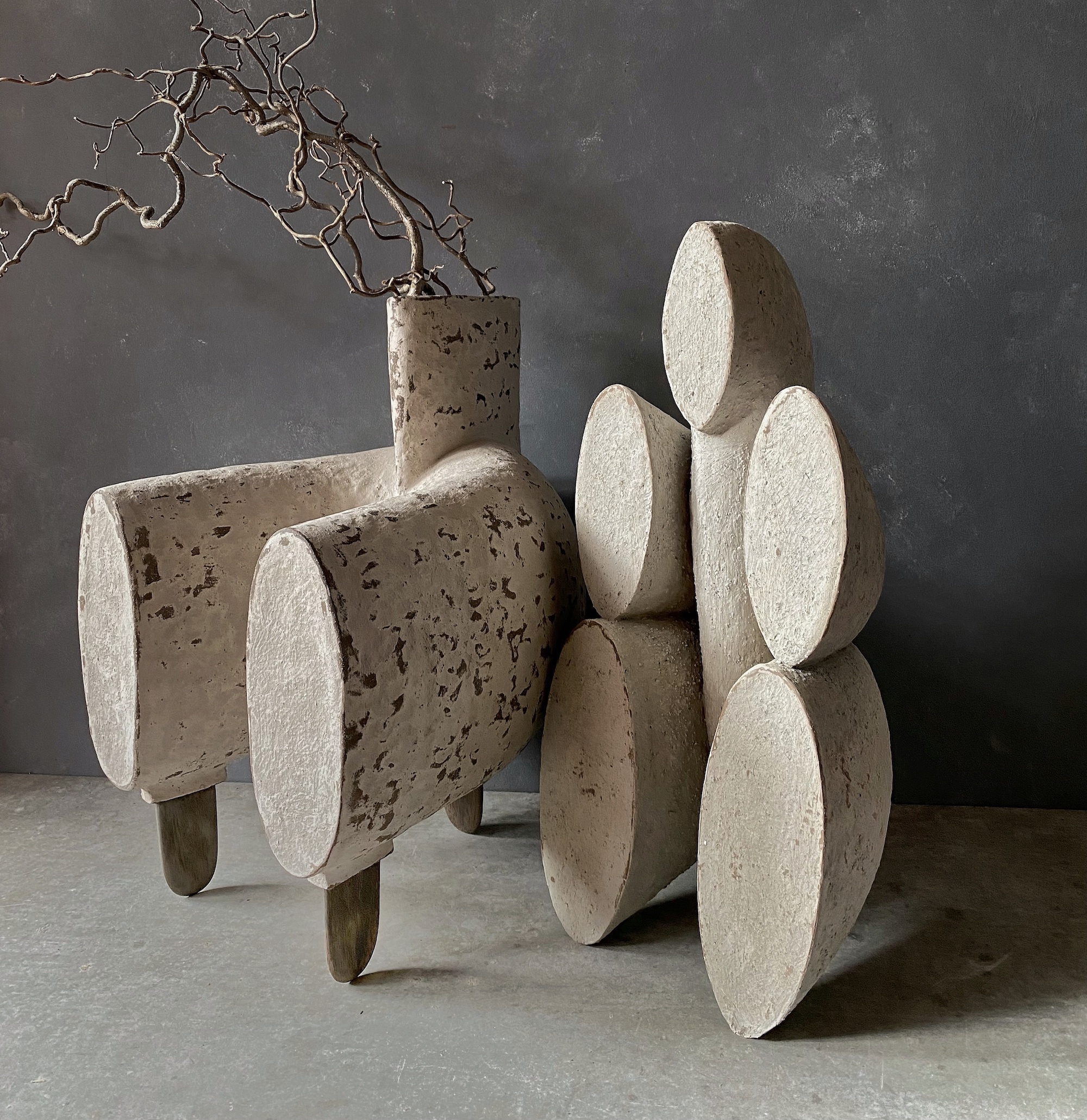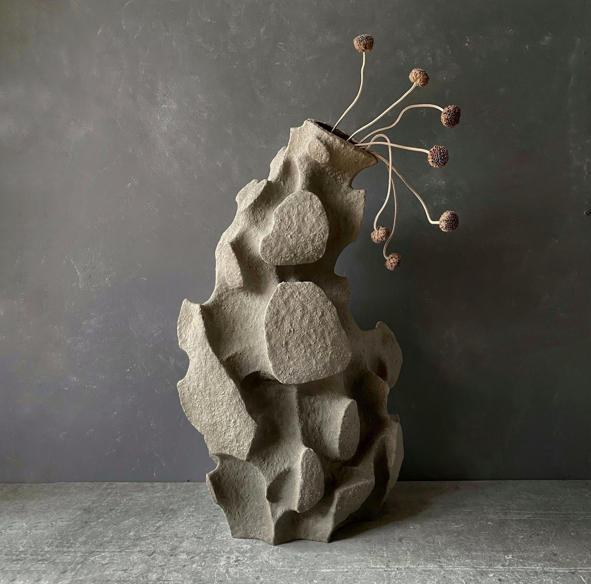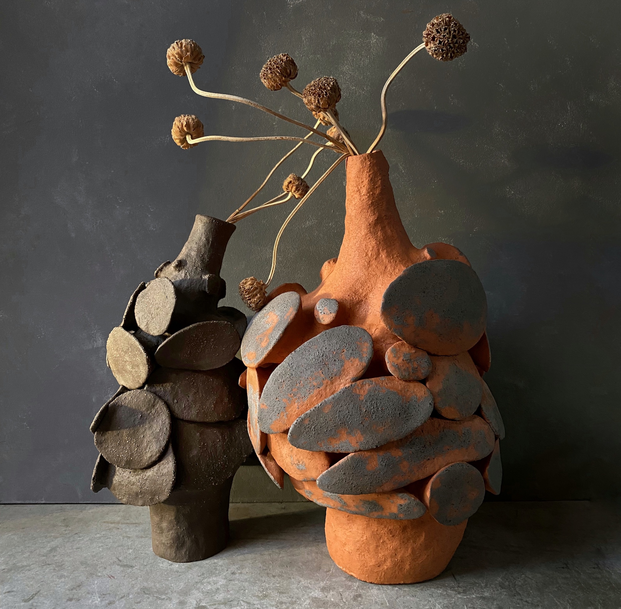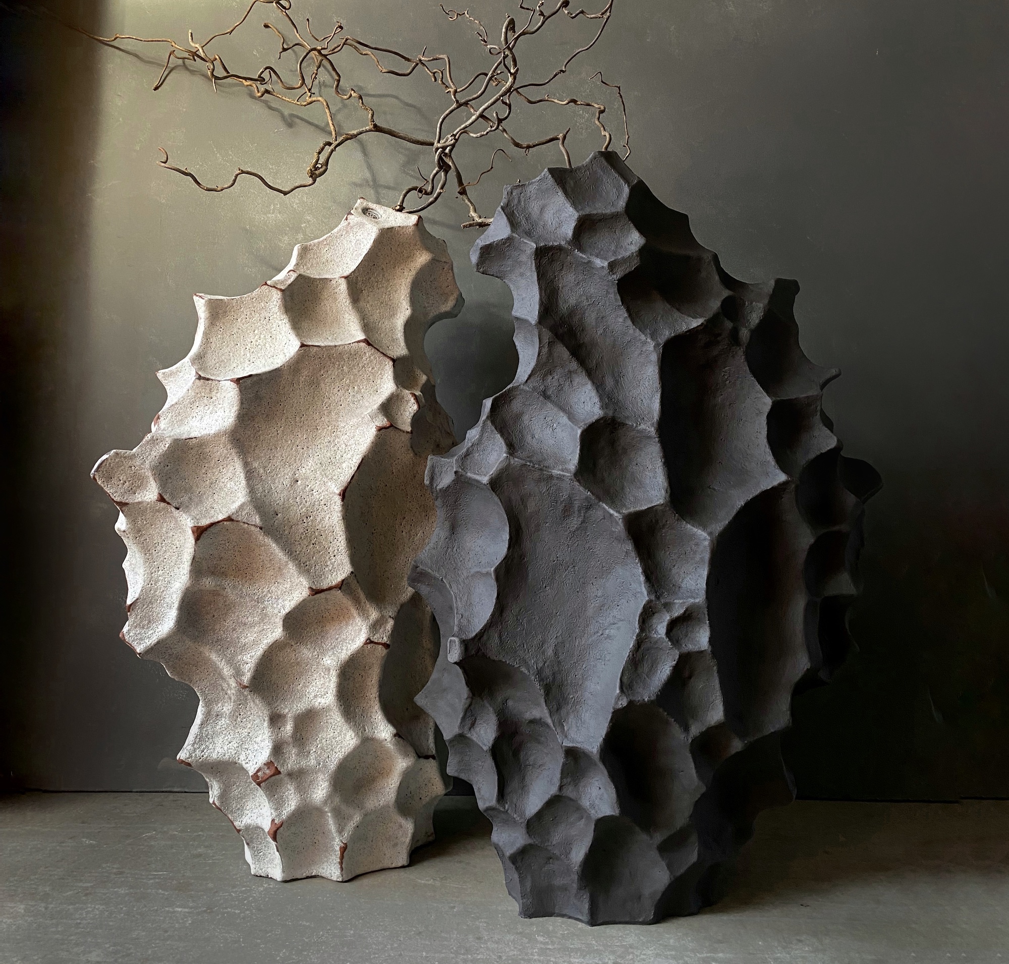 Harnessing the rich, organic textures of soil, stone, and timber, Ukrainian artists Andriy and Olesya Voznicki of Natura Ceramica create voluminous ceramic vessels and sculptures. Based in Amsterdam, the duo draw inspiration from natural phenomena like the changing seasons, patinas and aging, and elements like fire or earth. The pieces mirror the shapes and textures of boulders or lava rock, suggesting both beauty and resiliency and influenced by a concept called bionic design, which mimics characteristics and adaptations in nature.