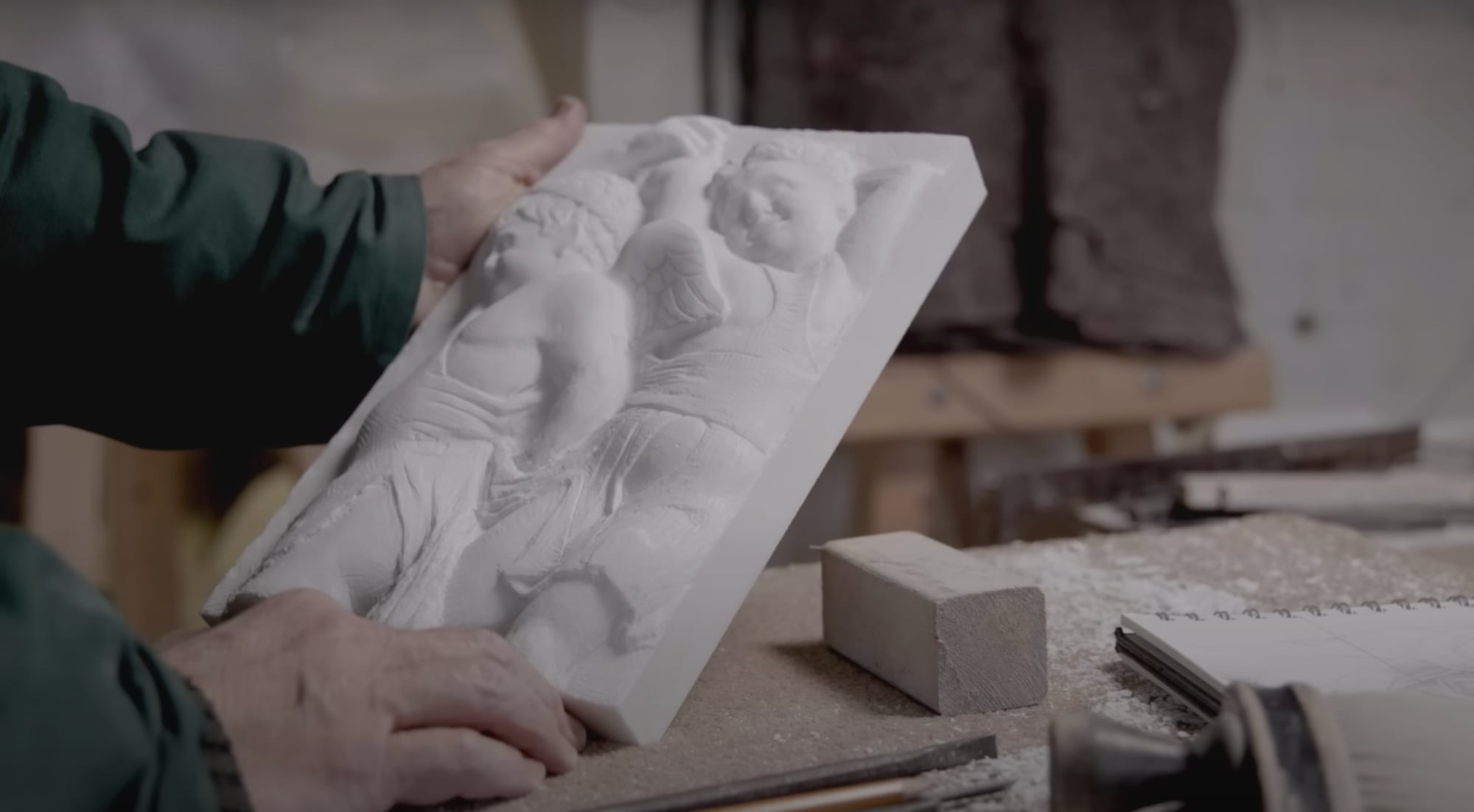 Referring to marble as “the emperor of all stones,” Smith draws a portion of the original work on a small block and explains the unique characteristics of the material as he carves. “It’s all about trapping shadows,” he says. “Carving is all about having deep cuts here and lighter here and the angle here and how the light plays on it. And certainly in relief because relief carving like this. It’s kind of halfway between sculpture and drawing.” While demonstrating how Donatello might have approached his work, Smith offers a compelling glimpse into how two artists’ techniques overlap and converge centuries apart.