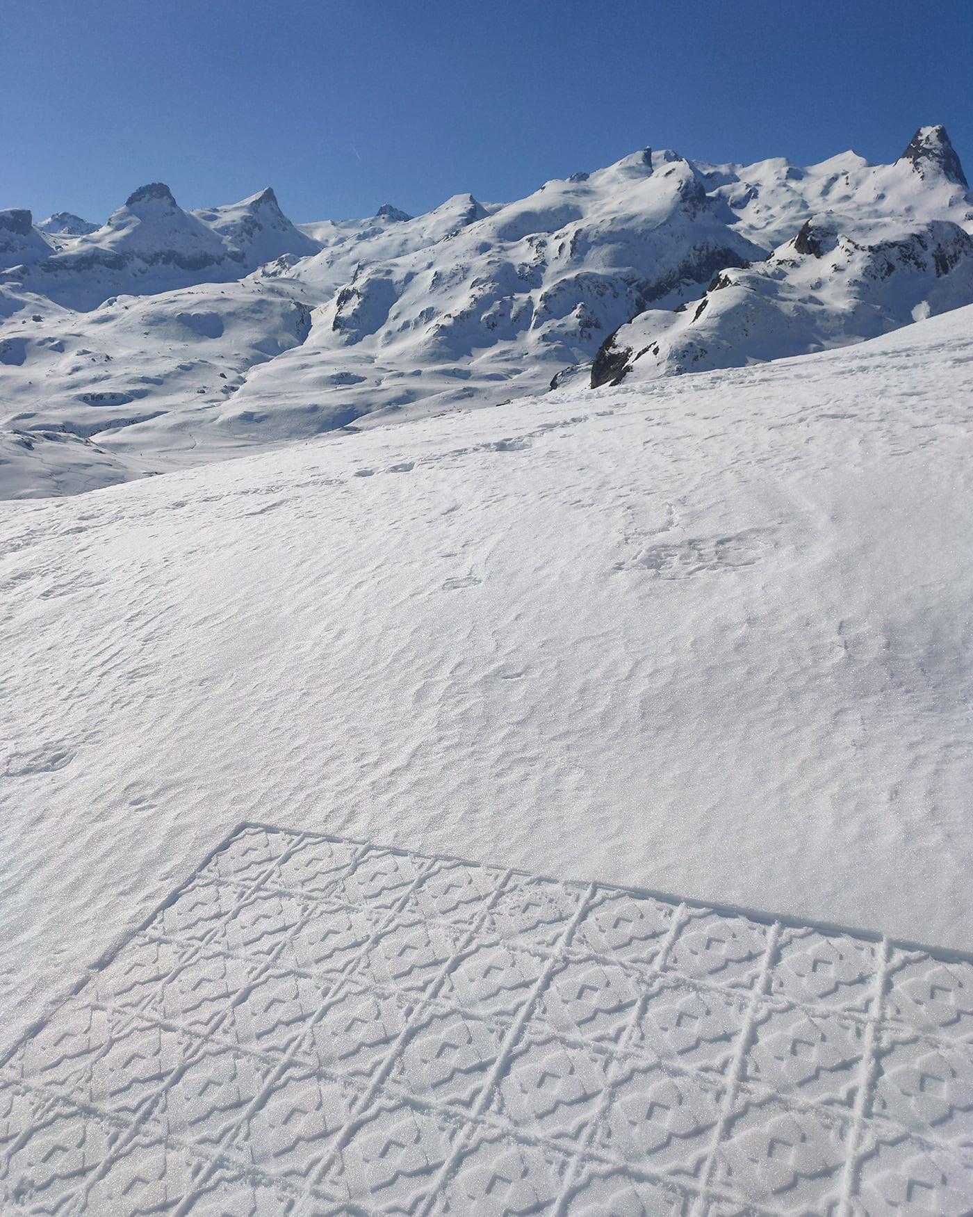 Catalan artist Javier de Riba (previously) once again collapses the boundaries between public and private, this time by adding a cozy intervention to a frigid environment. “Canal Roya” imprints a swath of fresh snow with the artist’s signature ornate motifs to mimic a rug-like covering on the frozen landscape.