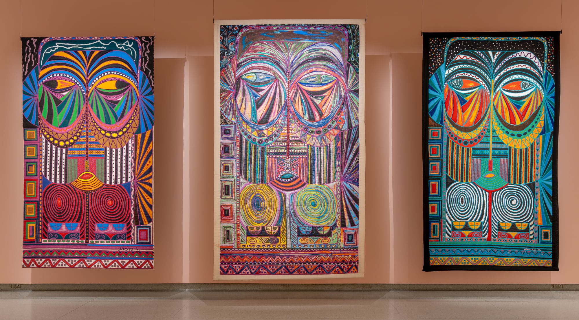 Along the gallery’s pink walls at the Walker, hand-stitched meandering lines run across canvas hanging more than two meters high. Though it was not Abad’s intention for her art to be seen from both sides, viewers are able to experience her work in a more intimate way by observing the artist’s hand, evident from the delicate stitching on each backside. Part of her signature trapunto painting technique, these sewn sections of canvas puff up with padding as geometric patterns house vibrant areas of color. Calling to Africa’s masks and abstract carving, Tibet’s Thangka tapestries, and Italy’s trapunto techniques, Abad’s series of masks are a conglomeration of community encounters as well as real stories of strength and strife inspired by those that she met along the way.