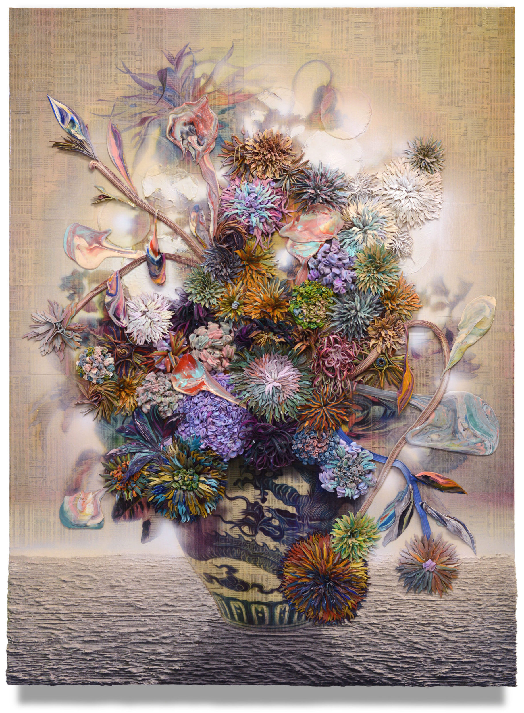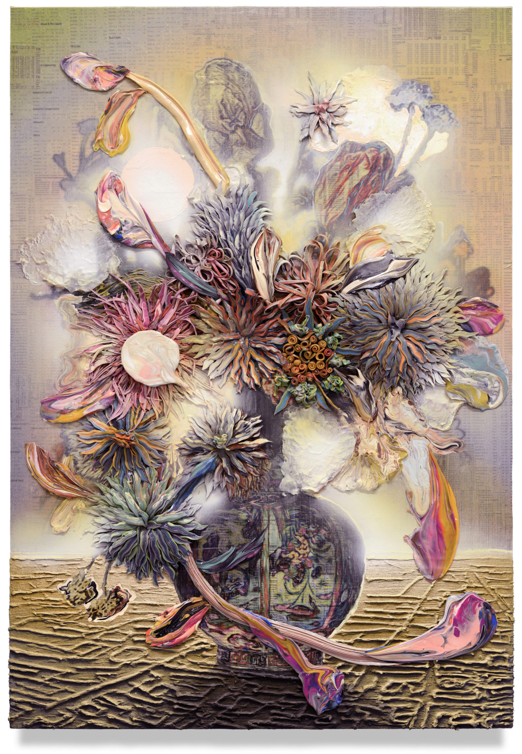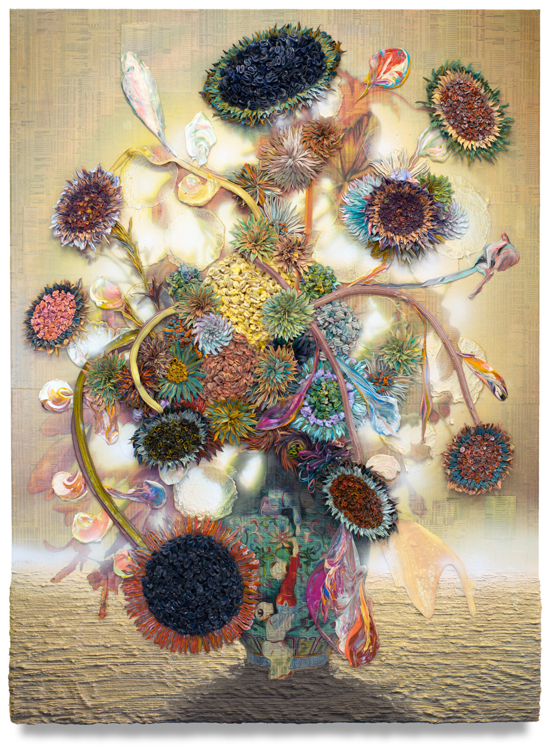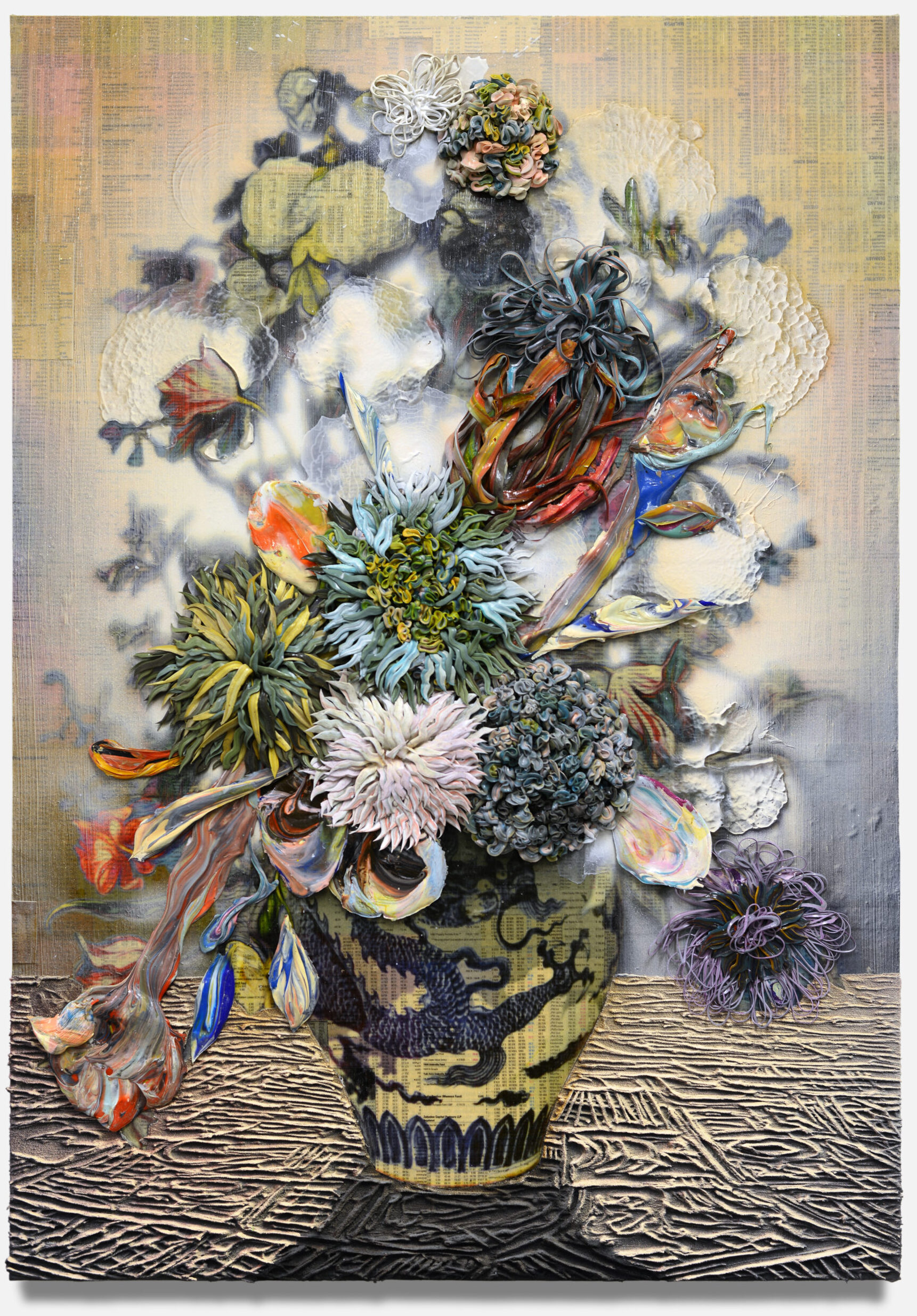 Combining inkjet printing methods, acrylic paint, and sand to create a variety of textures and three-dimensional features, Cheung’s flowers appear to delicately float across ethereal surfaces. He assembles each bloom by applying thick paint onto plastic that can be peeled off when dry and collaged onto the canvas. He is interested in what he calls the “Ozymandian eventuality” of grandeur and power to physically and metaphorically crumble over time, using sand to represent impermanence and the constantly shifting nature of the human condition.