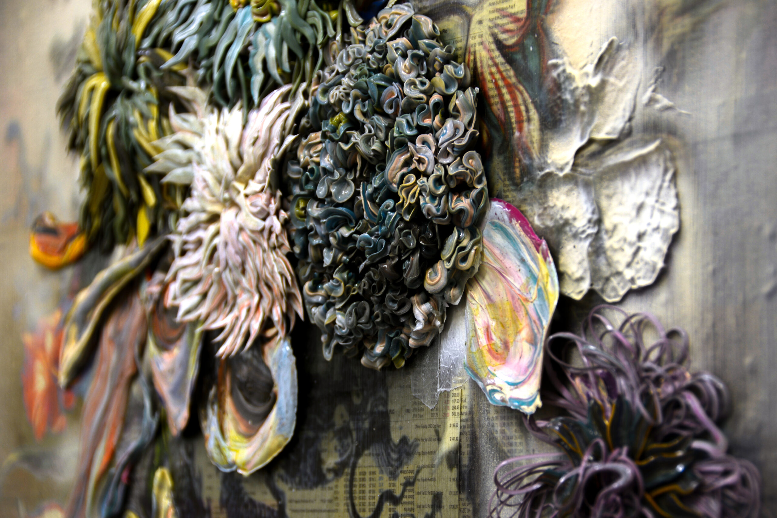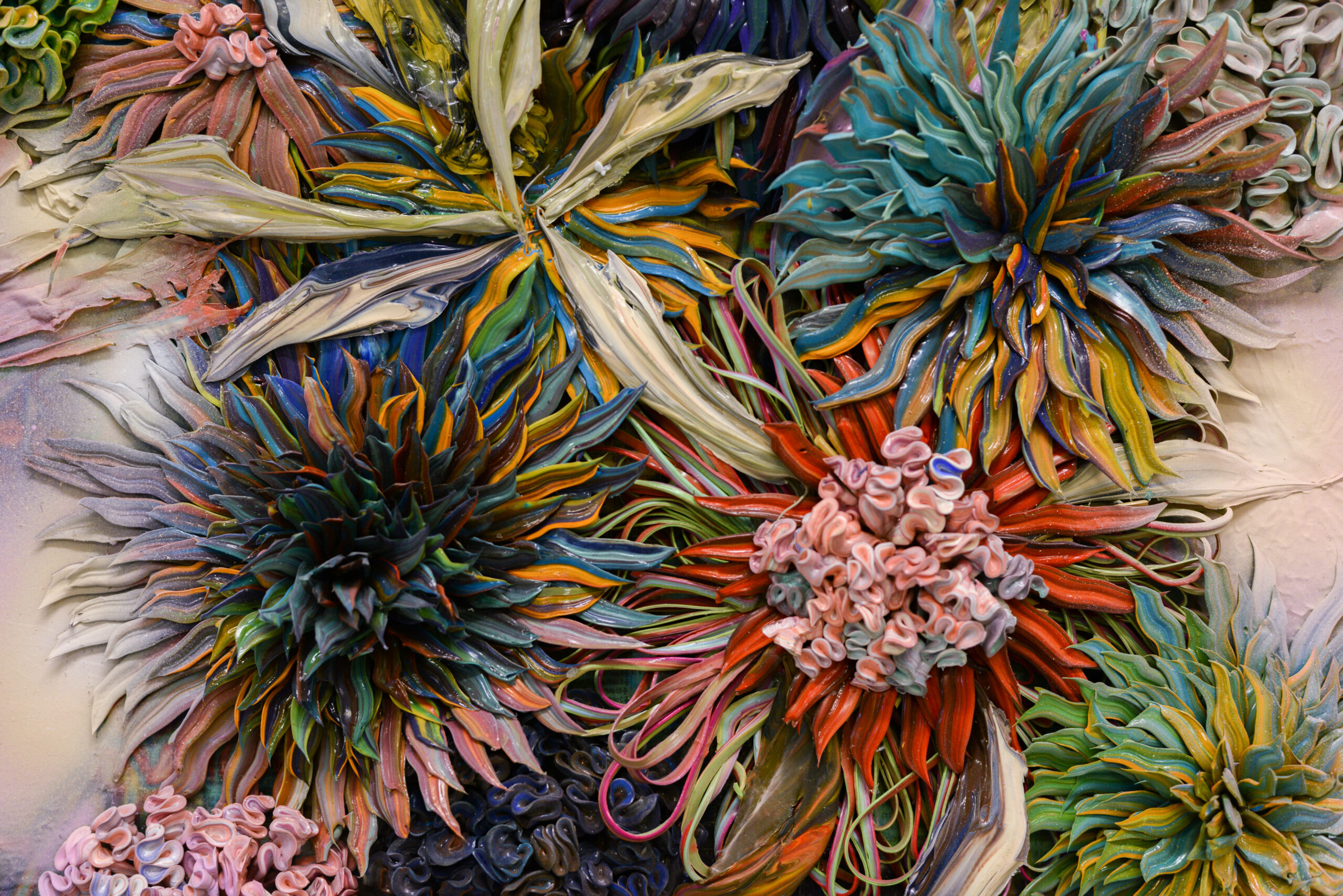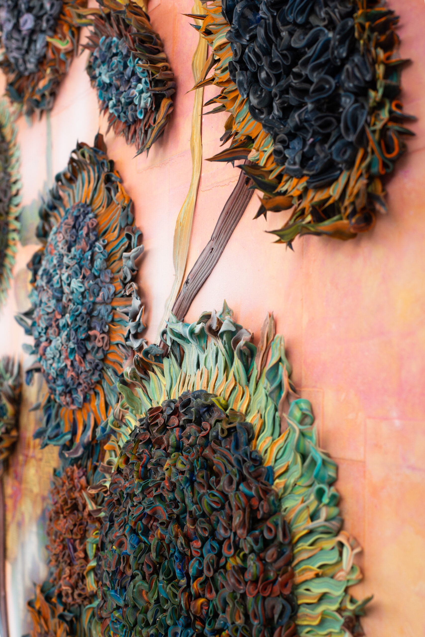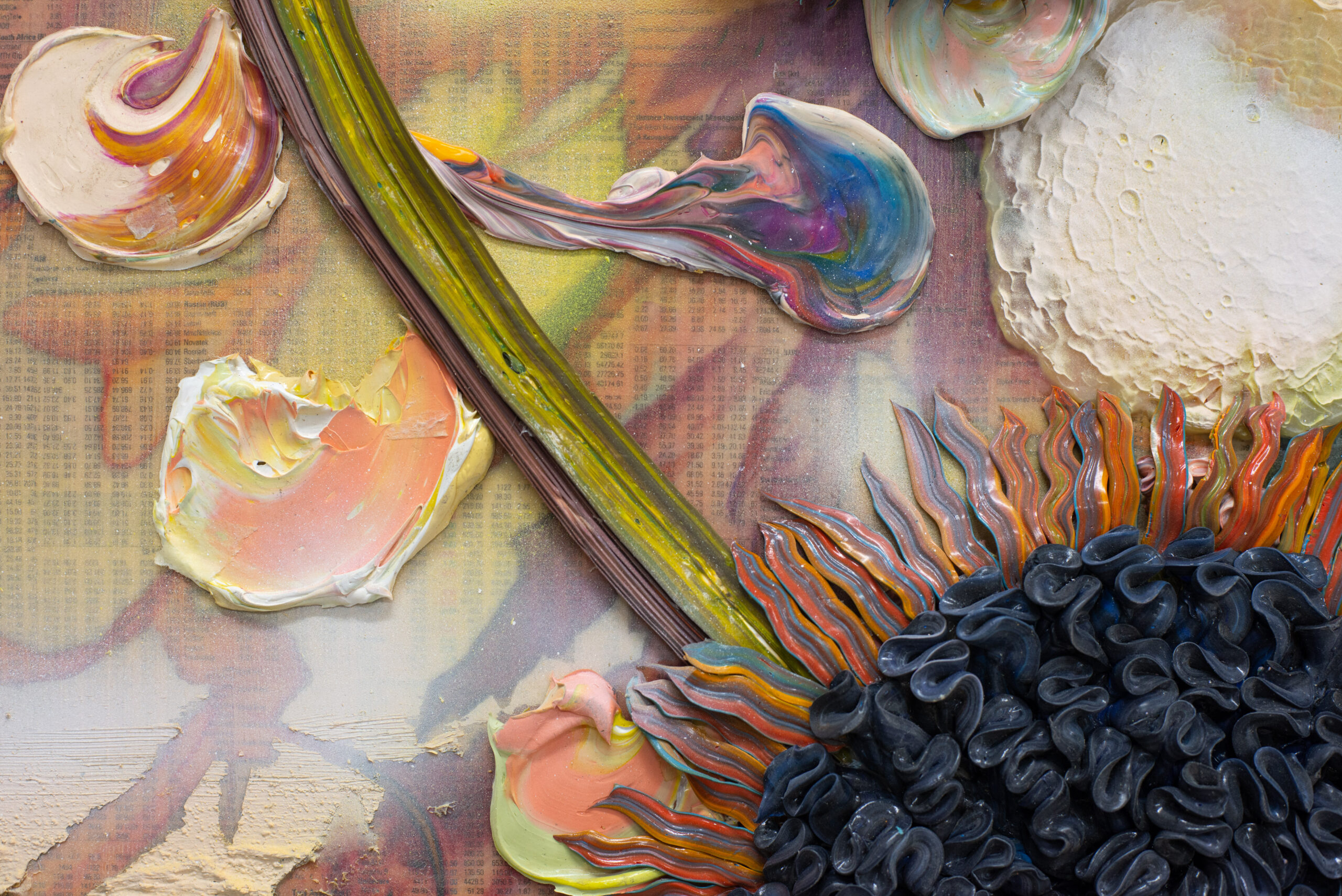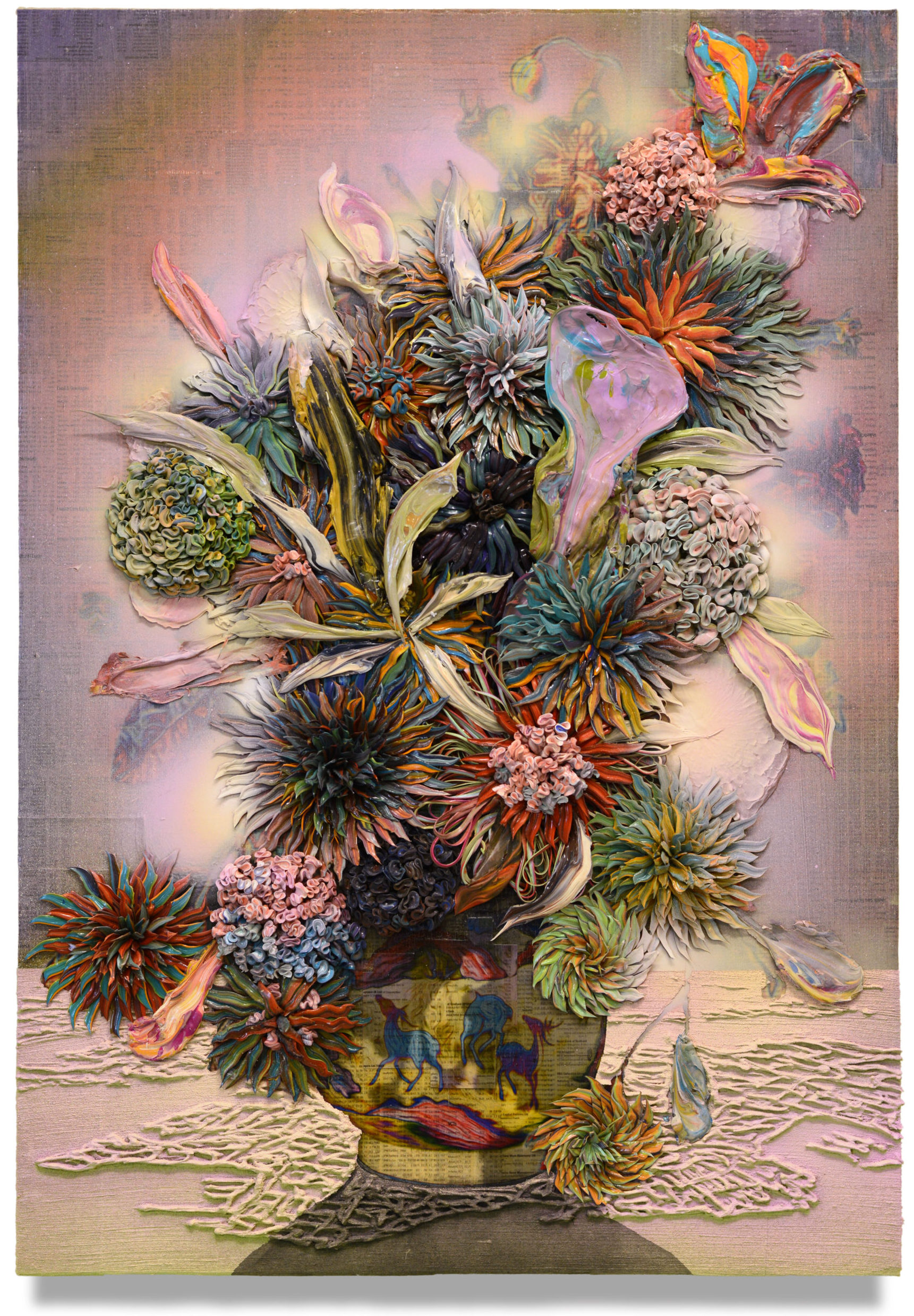 Combining inkjet printing methods, acrylic paint, and sand to create a variety of textures and three-dimensional features, Cheung’s flowers appear to delicately float across ethereal surfaces. He assembles each bloom by applying thick paint onto plastic that can be peeled off when dry and collaged onto the canvas. He is interested in what he calls the “Ozymandian eventuality” of grandeur and power to physically and metaphorically crumble over time, using sand to represent impermanence and the constantly shifting nature of the human condition.