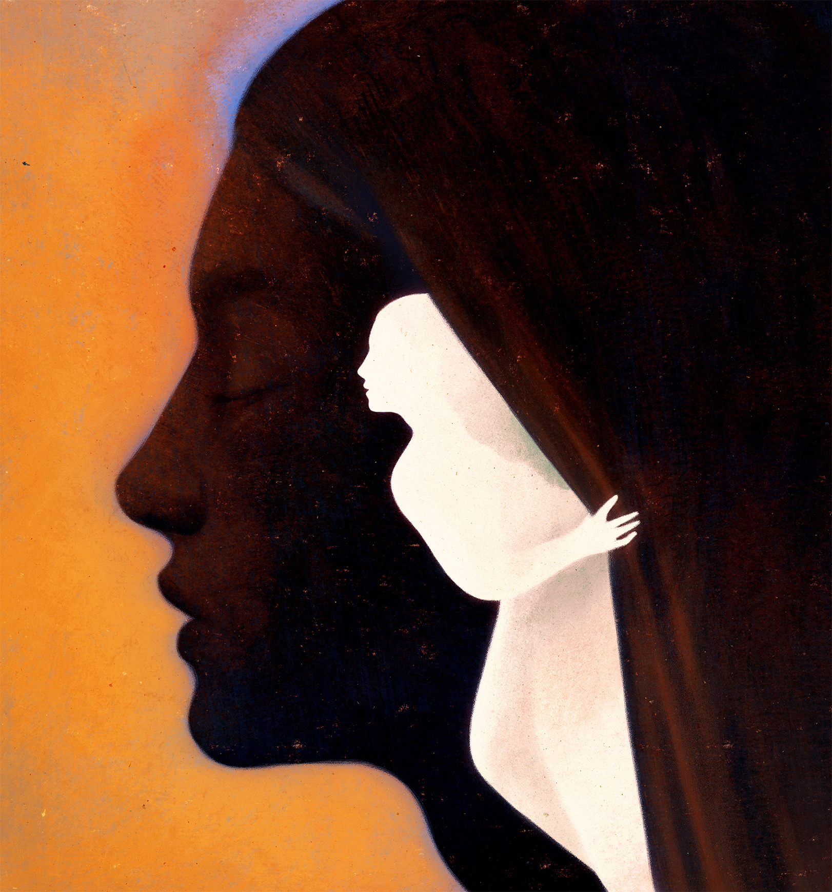 For Owen Gent, texture and shadow are essential narrative tools. The Bristol-based artist fosters a robust personal practice and works with commercial clients, authors, and various publications to create moody illustrations rich with metaphor. In one work evoking the emotional toll of cancer, trauma, and depression, a figurative silhouette draws back a woman’s hair to survey the surroundings while still protected by the strands. An unsettling piece takes a similarly introspective and psychological approach as black crows circle a subject, one on fire and another grasping at the person’s eye.