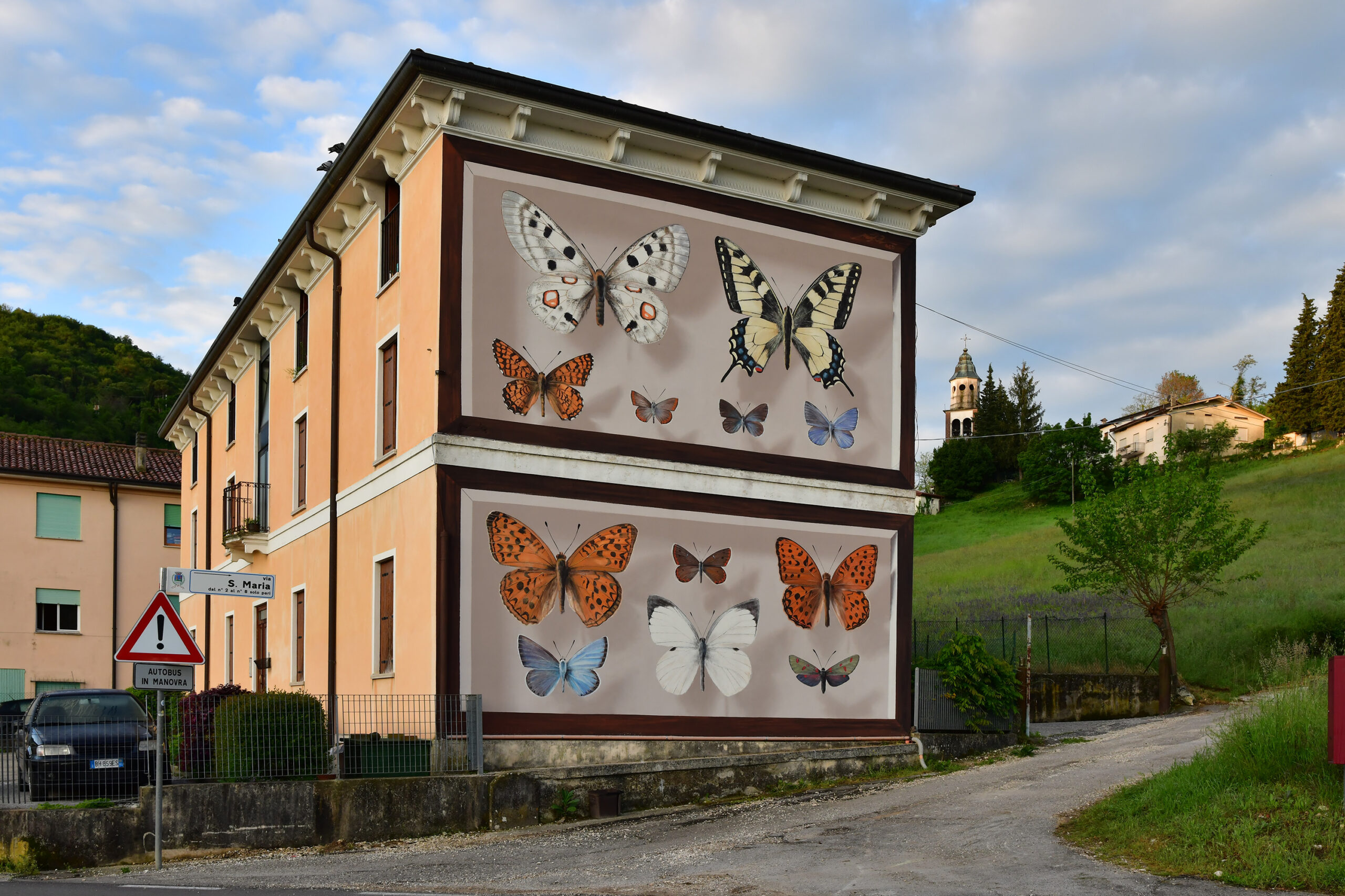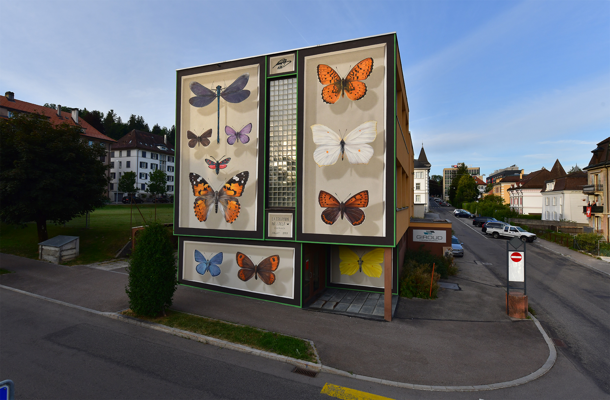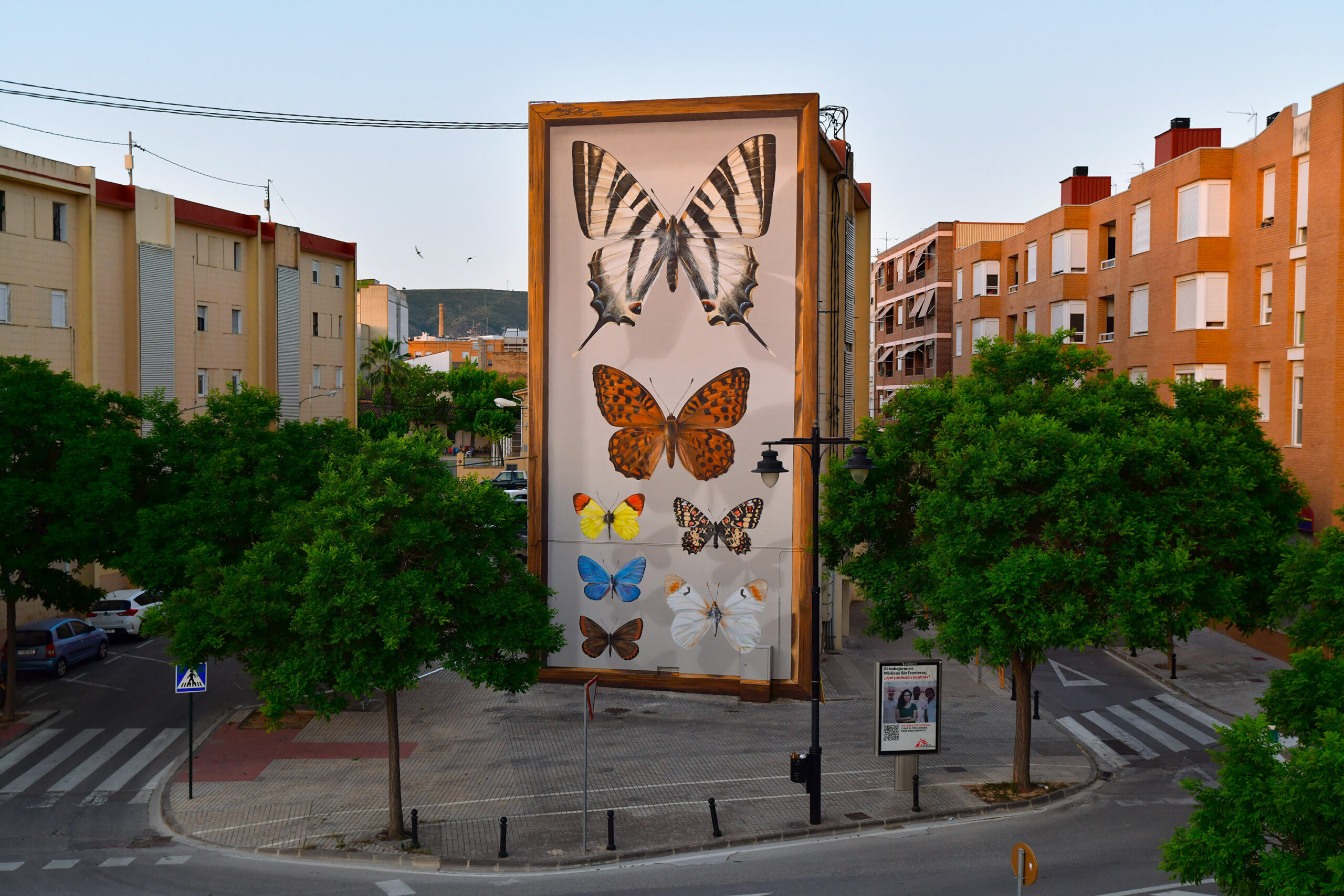 Seemingly floating atop vast brick exteriors and inside massive specimen boxes, enormous butterflies stretch their wings, casting a soft shadow on building facades. Now based on both sides of the Atlantic—Switzerland and Mexico City—French artist Mantra (previously) continues to lean into the passion, curiosity, and respect he harbors for nature. Pursuing his childhood dreams of becoming a naturalist, the artist’s signature take on exploring the Lepidoptera through freehand acrylic murals is monumental.