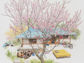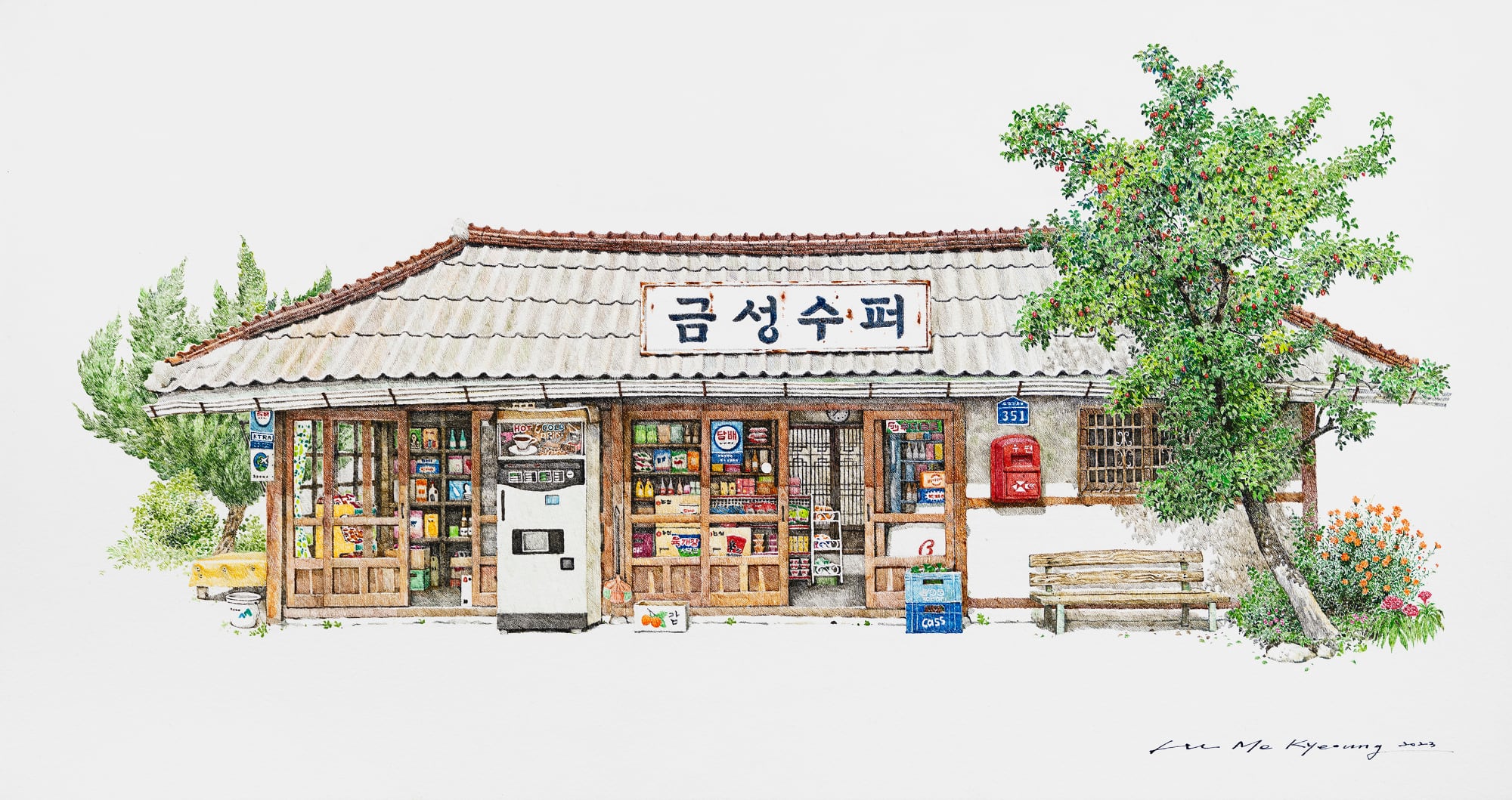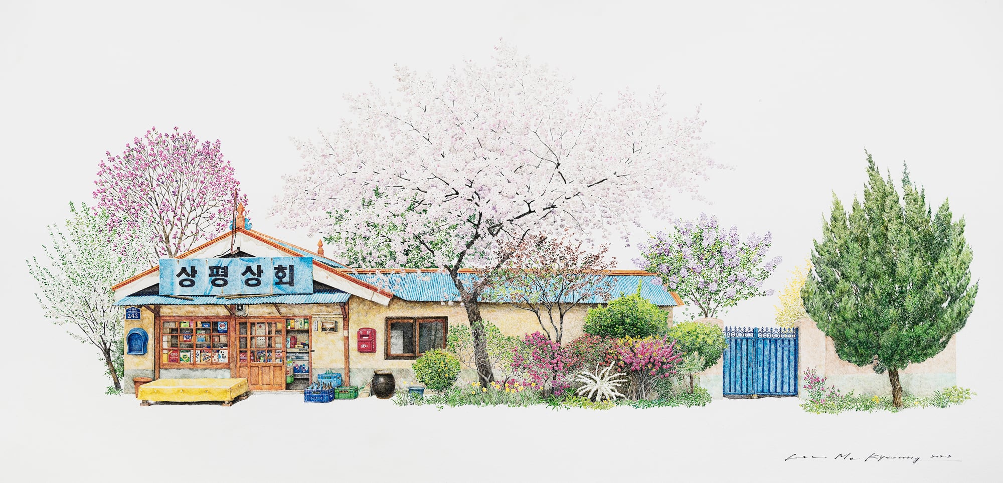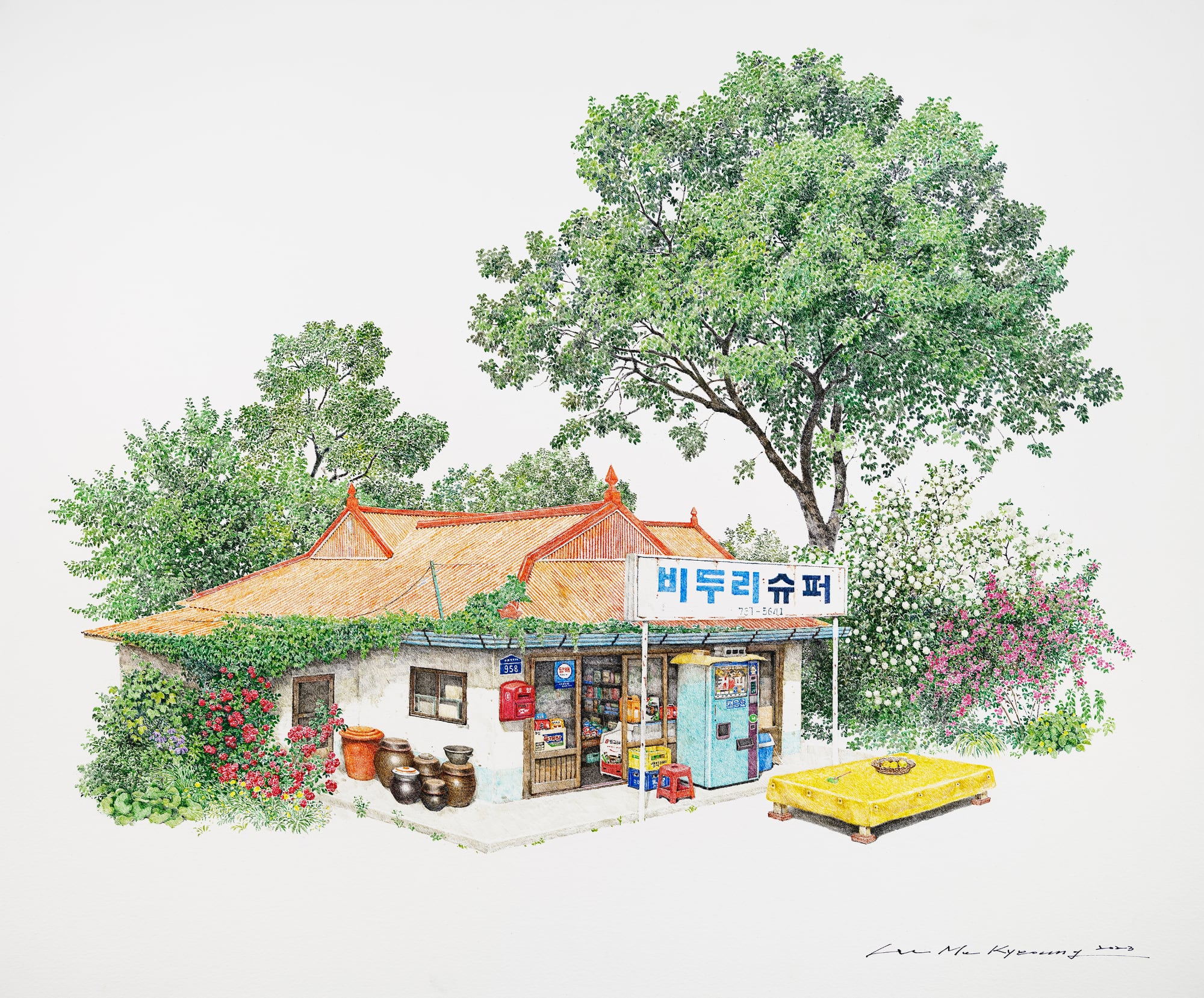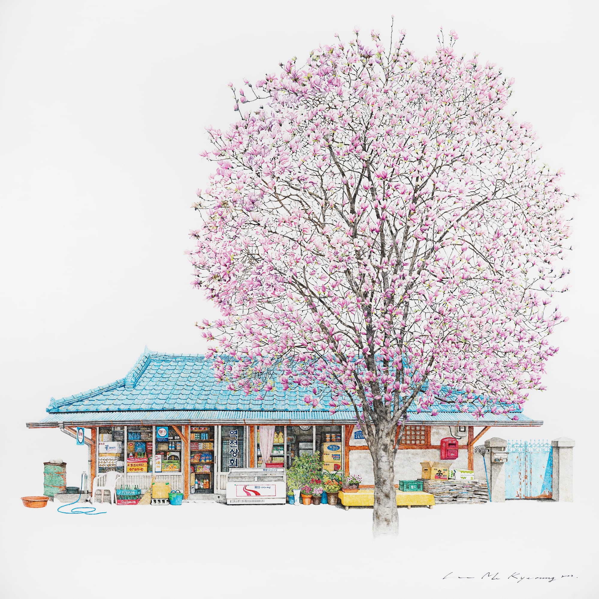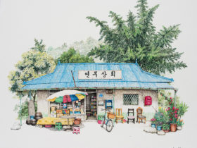 On view throughout July at Gallery Imazoo in Gangnam, Me Kyeoung’s latest works are an ode to these disappearing locales. Enveloped by lush cherry blossoms or persimmon trees, the shops are well-stocked with dense shelves, crates of goods, and advertisements pasted in the windows. Bicycles, benches, and the occasional folding chair stand outside the entrances. Delicately rendered in pen and acrylic, the paintings depict architectural and organizational variances that make each spot unique, while honoring the cultural ubiquities of these spaces.