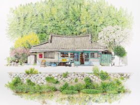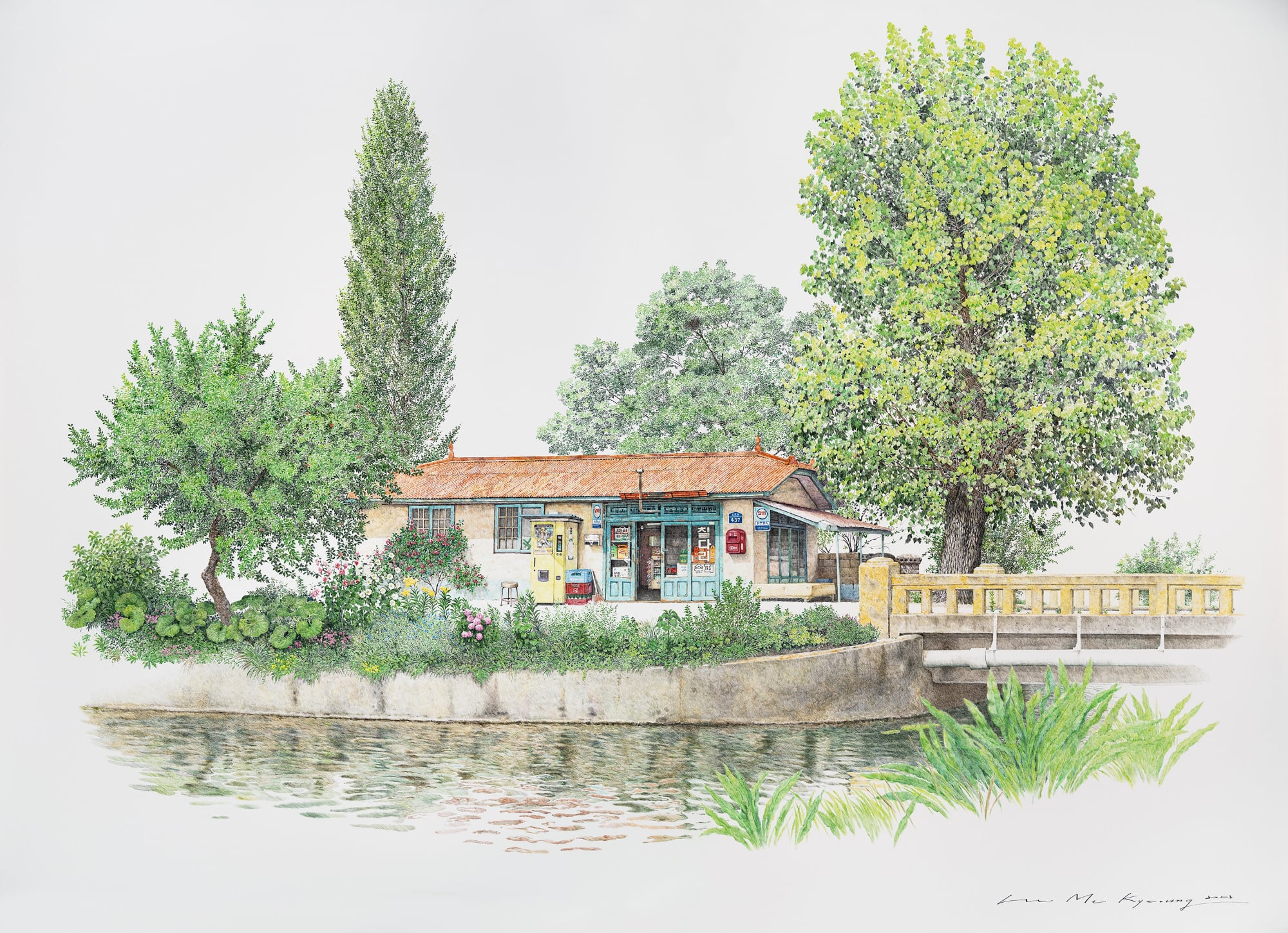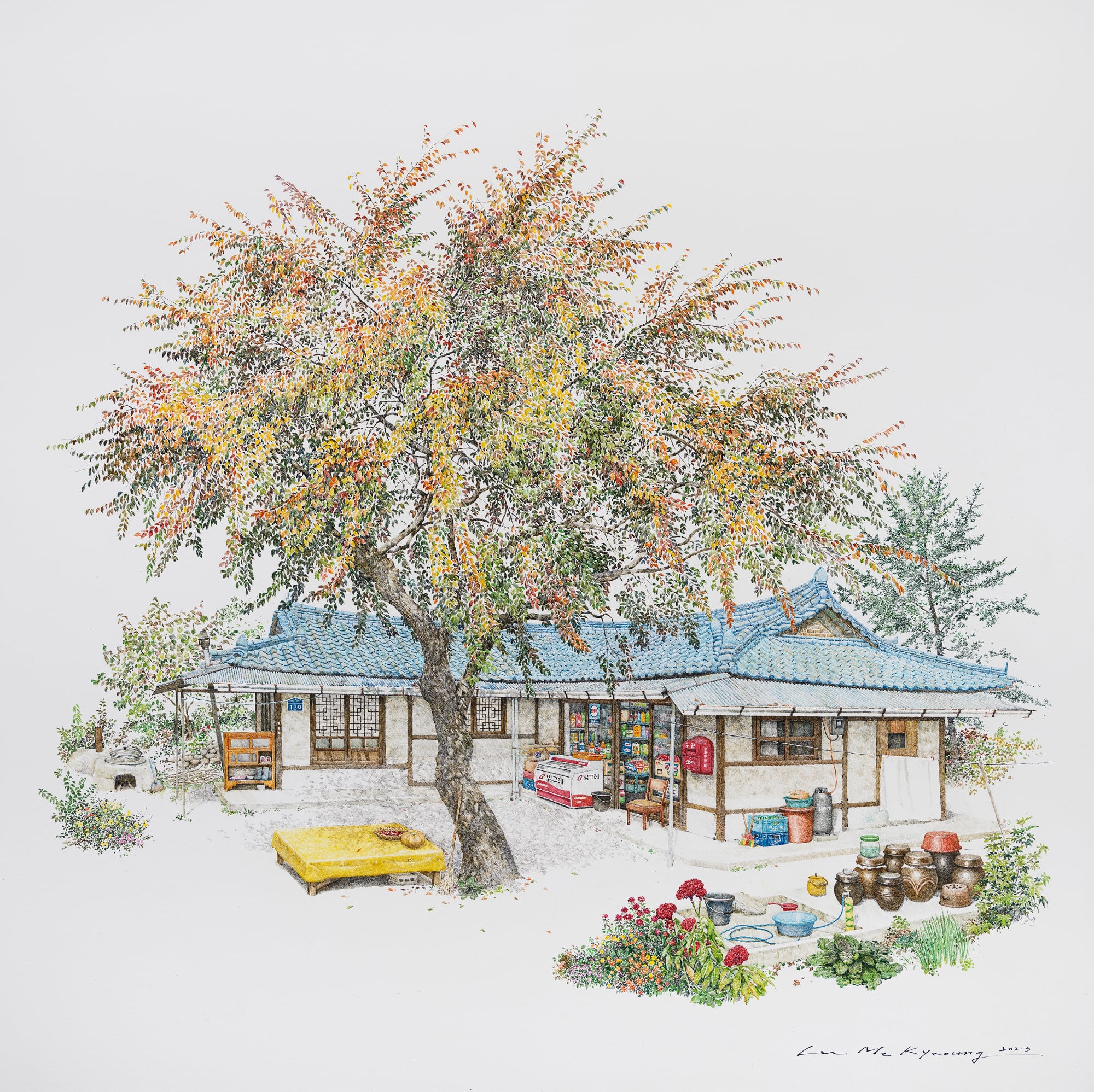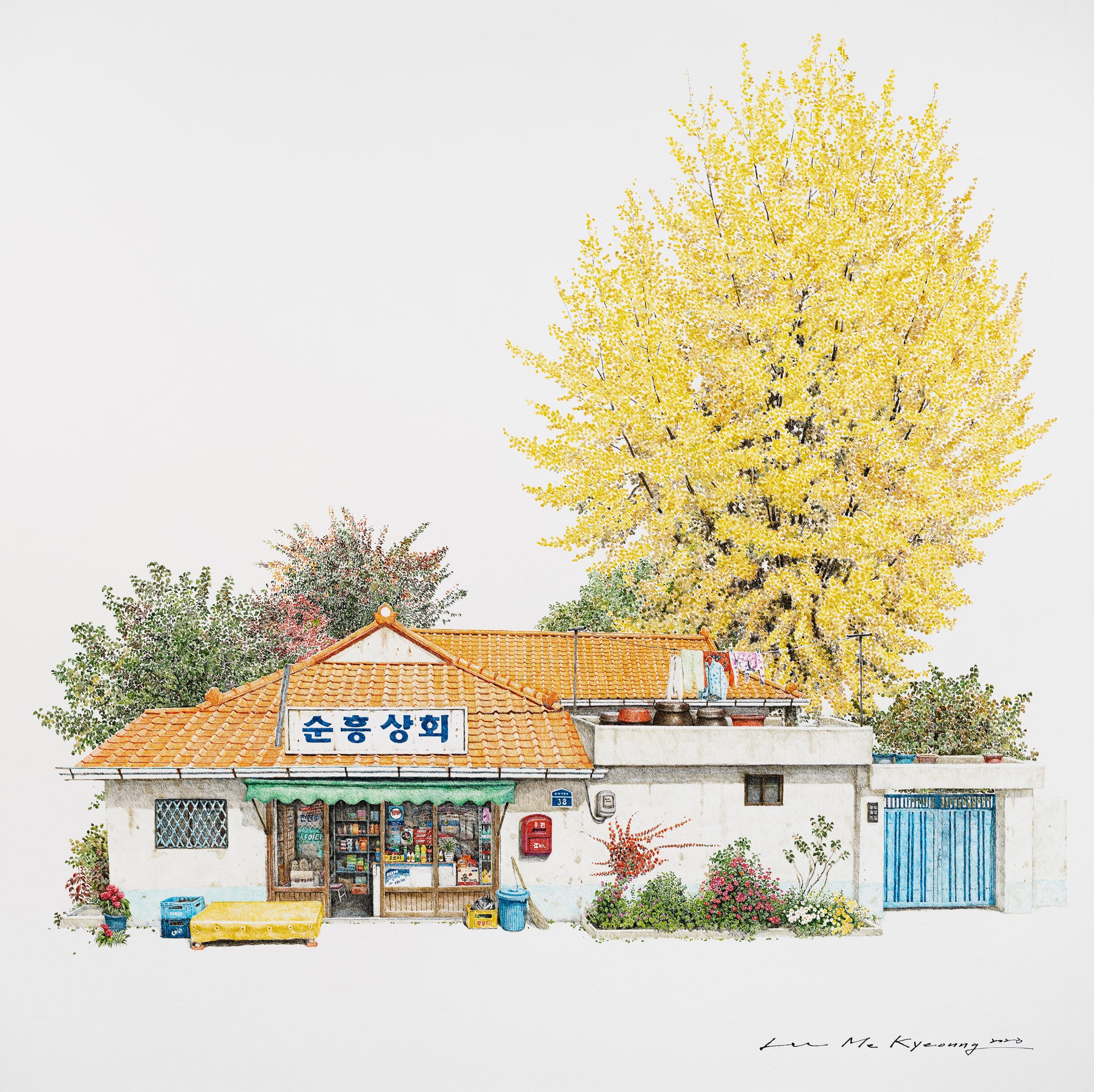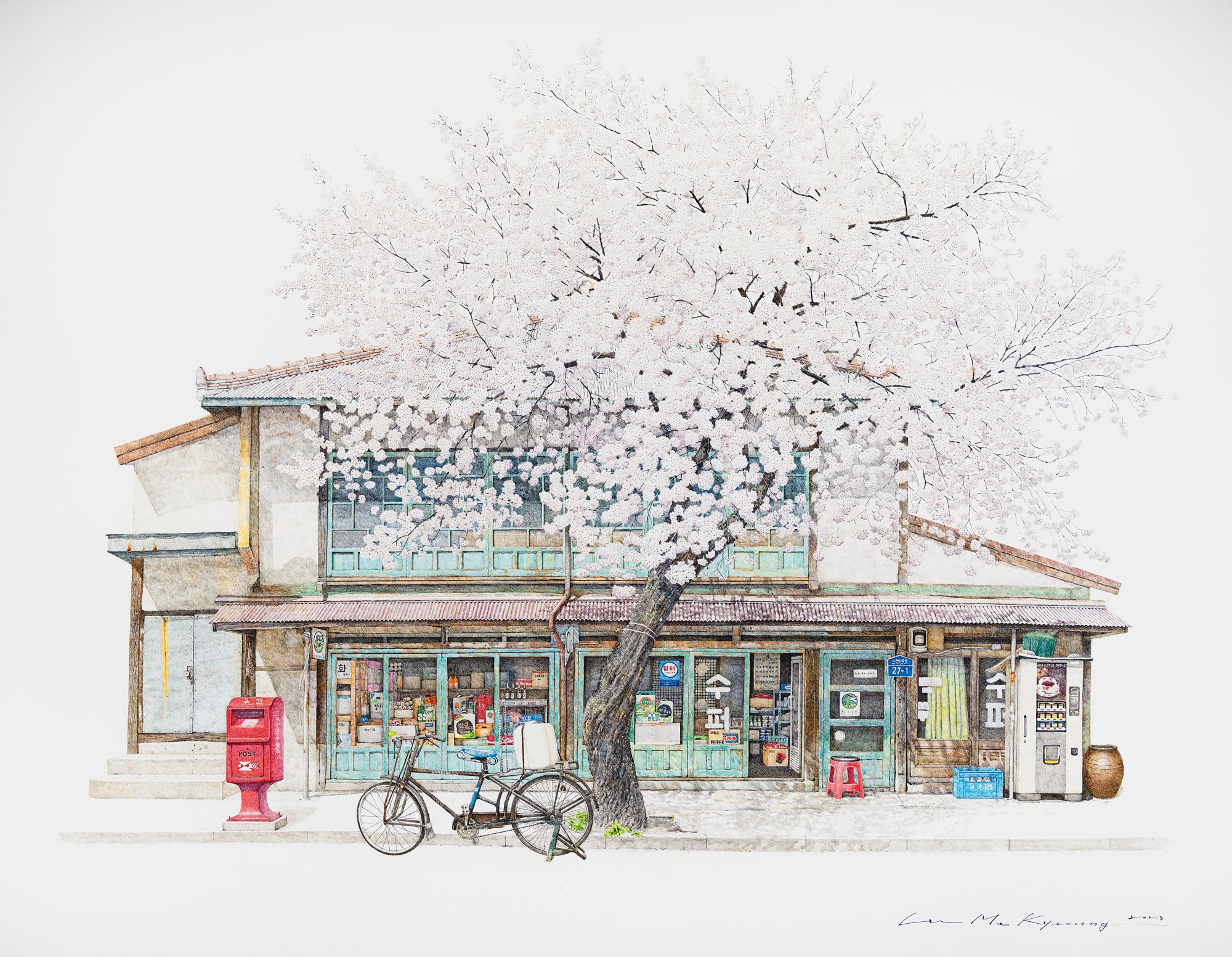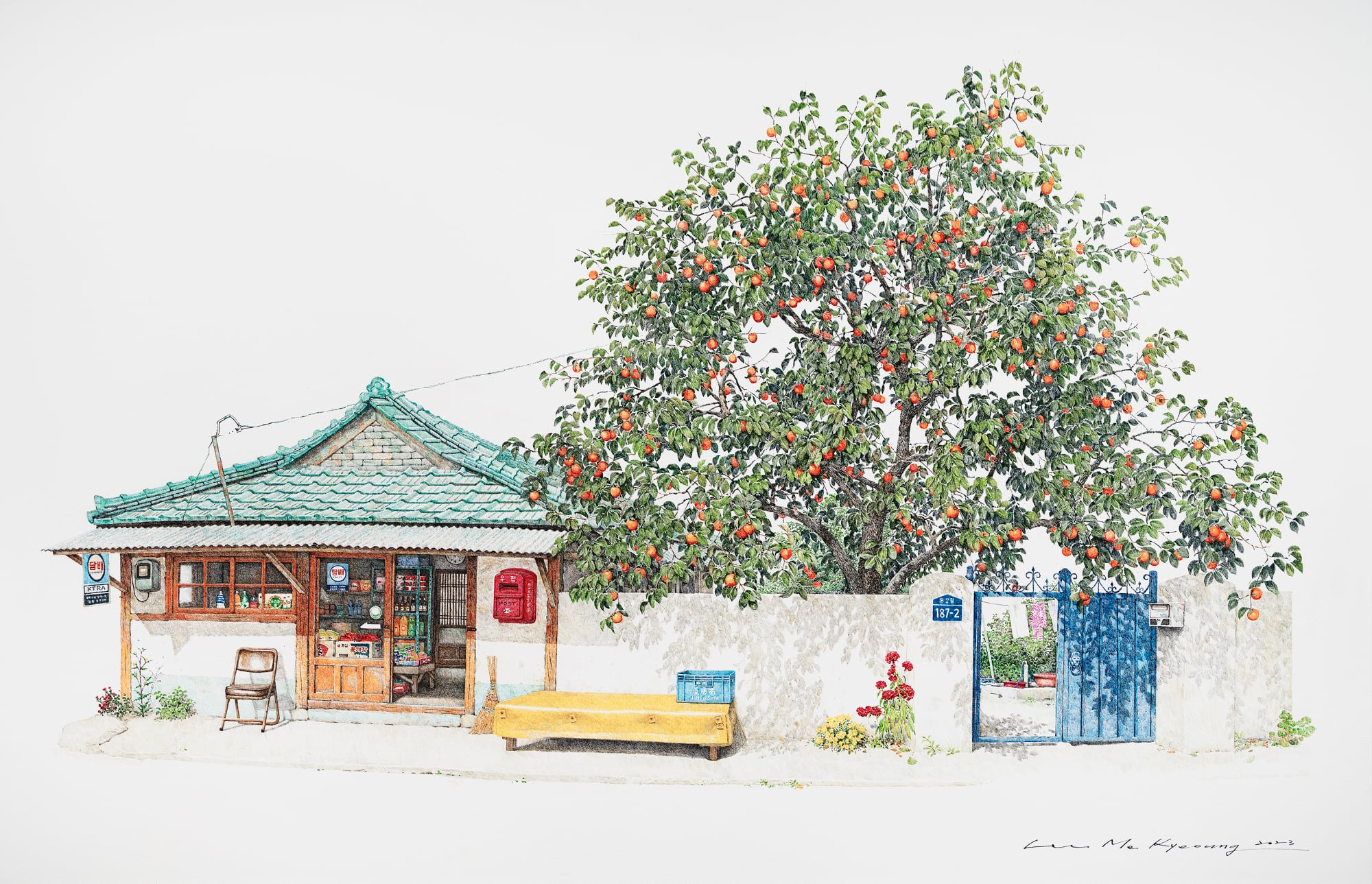 On view throughout July at Gallery Imazoo in Gangnam, Me Kyeoung’s latest works are an ode to these disappearing locales. Enveloped by lush cherry blossoms or persimmon trees, the shops are well-stocked with dense shelves, crates of goods, and advertisements pasted in the windows. Bicycles, benches, and the occasional folding chair stand outside the entrances. Delicately rendered in pen and acrylic, the paintings depict architectural and organizational variances that make each spot unique, while honoring the cultural ubiquities of these spaces.