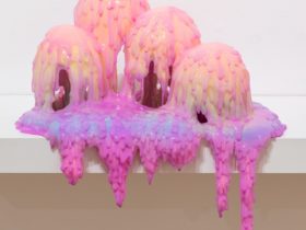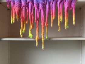 Oozing over the edges of shelves and dolloping tendrils across flat surfaces, Dan Lam’s vibrant sculptures (previously) play with form and space. Using polyurethane foam, epoxy resin, and acrylic, the Dallas-based artist makes otherworldly sculptures that appear like alien substances from outer space, apropos to the pieces in her upcoming solo exhibition, Cosmic Shake.