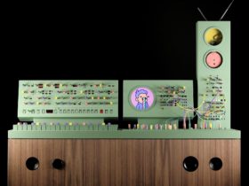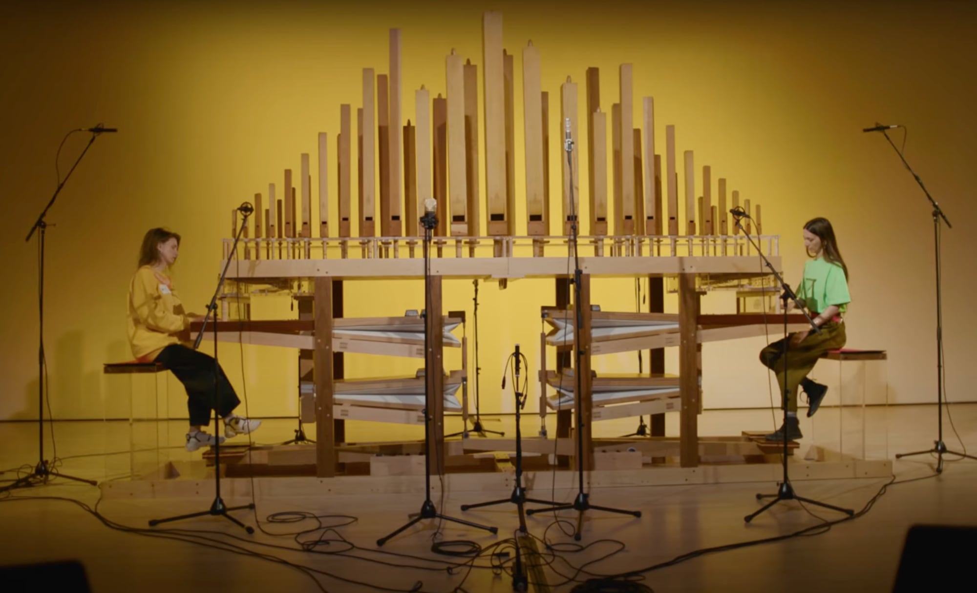 After surveying the artist’s broad and diverse practice, the segment closes with “Auerglass,” an interactive organ-like instrument Auerbach created in collaboration with their friend and musician Cameron Mesirow. Made of glass and wood, the apparatus functions with pedals, keys, and pipes like the traditional design, although it requires two players. Each person has only half a keyboard—four octaves have been divided by alternating notes—and is required to pump air for the other. Physically engaging and rooted in the principles of sound, “Auerglass” is evidence of the artist’s interest in the experiential, connection, and the understanding that “the body is an important thinking tool.”