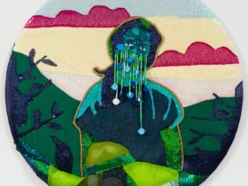 The work of artist Trevon Latin (previously), these reliefs can also be seen as portals. Latin is visionary and corrective, using quilted, mixed-media forms to amend historical narratives and envision new realities. Part of their solo show TOYMAKER: Big Blu & the Weeping Walls!! ?️??, these works reflect a world that welcomes the fluidity of gender and sexuality and where queer love and joy reign.