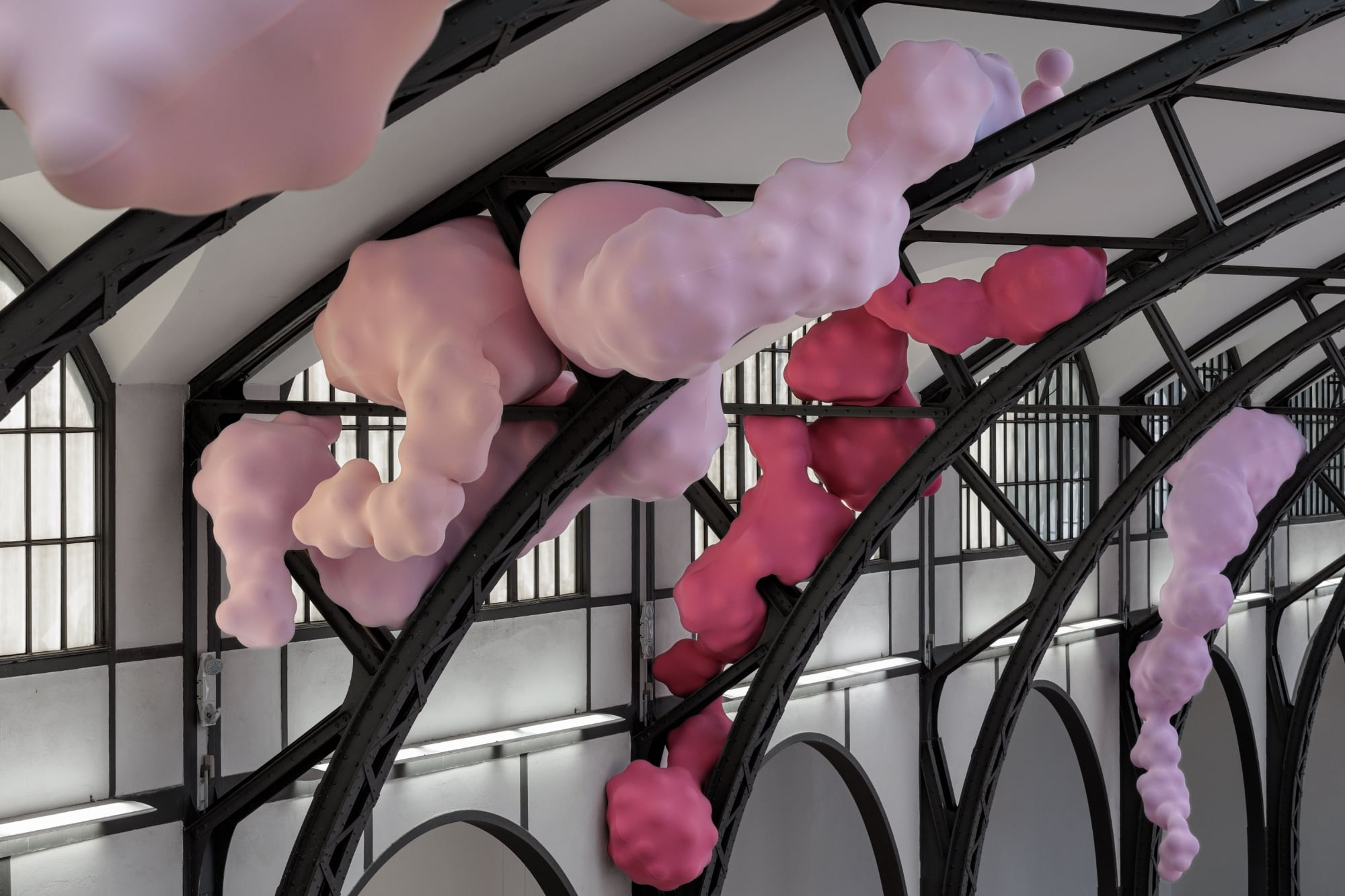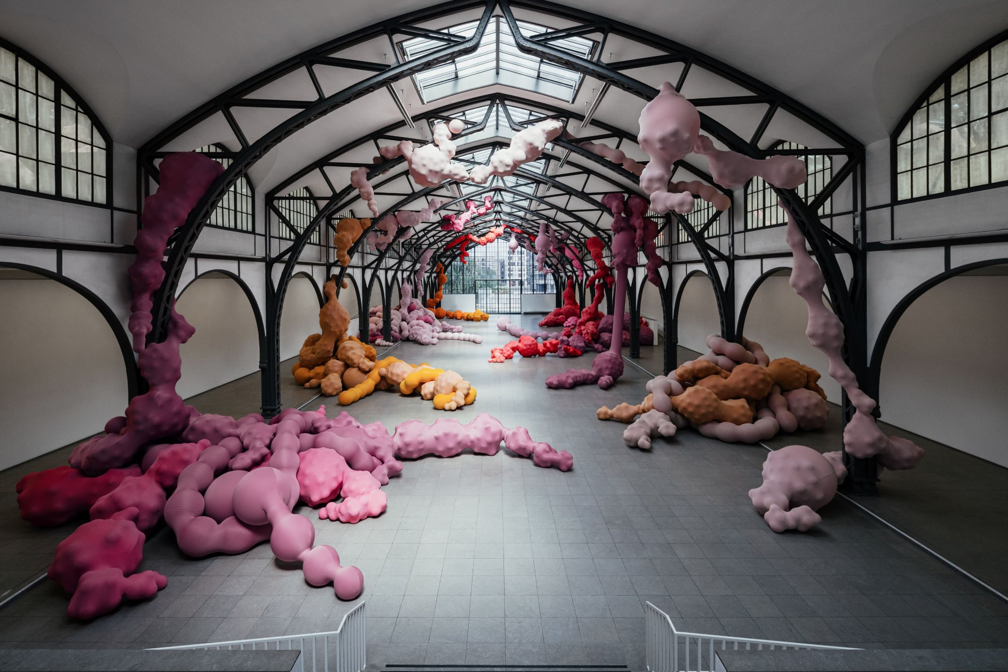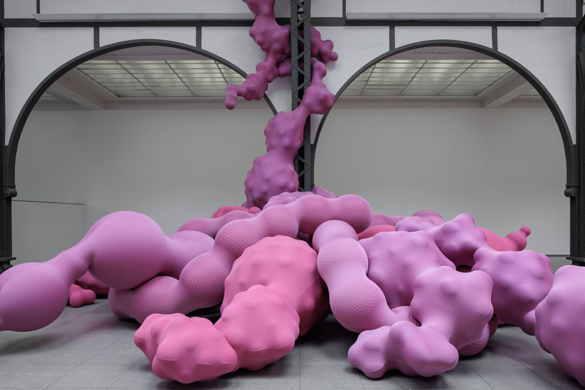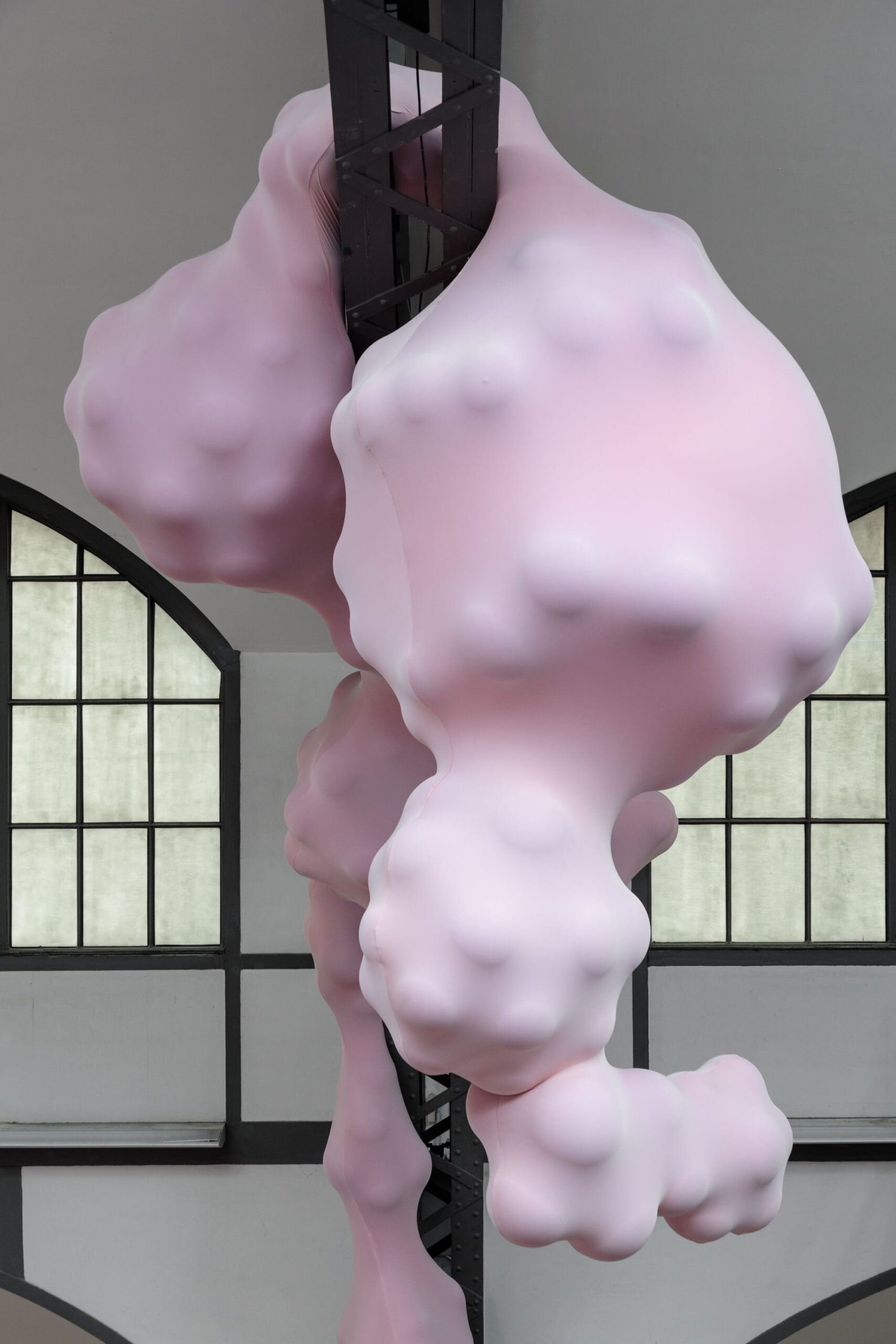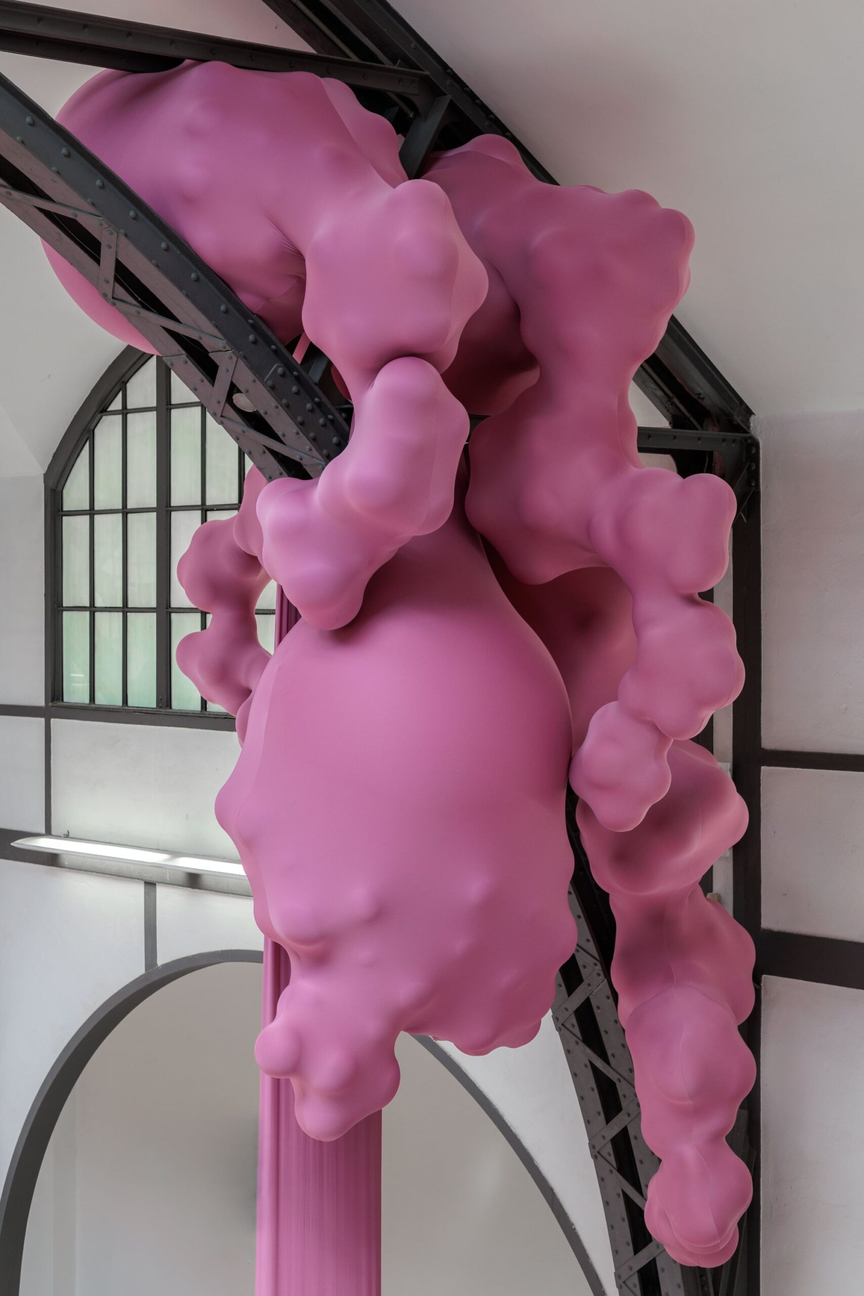 Bulbous, biomorphic sculptures in lavender, tangerine, and blush pink rove throughout the airy Hamburger Bahnhof in Berlin. The largest solo exhibition to date of Barcelona-born artist Eva Fàbregas, Devouring Lovers brings massive, bulging works to the industrial hall, juxtaposing the cold iron structures with soft, pudgy forms. Inviting in color and grotesque in shape, the organic, monstrous sculptures appear alive, as if they could grow and swallow up the remaining space, viewers and all.