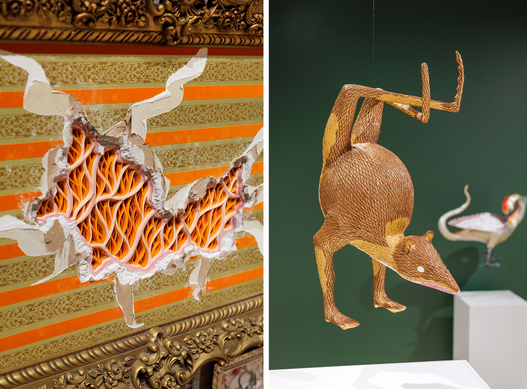 Left: Detail of Charles Clary’s “Memento Morididdle” (2023). Right: Roberto Benavidez, “Bosch Beast No. 4” (2017), paper, paperboard, glue, crepe paper, and wire, 36 x 22 x 12 inches
