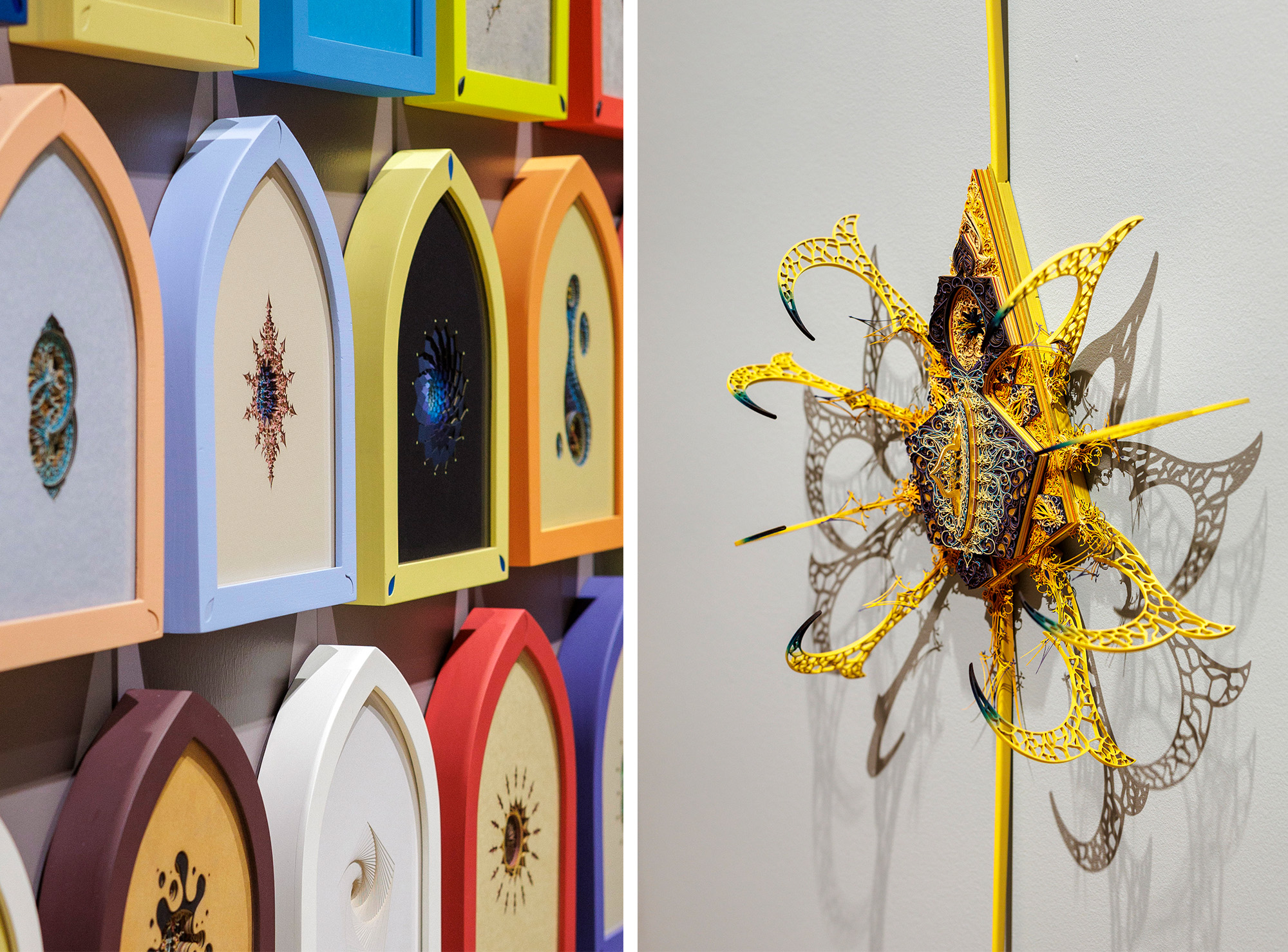 Left: Detail of Eric Standley’s “Drift” (2022). Right: Detail of Eric Standley’s “Llull” (2020), laser-cut paper, wood, and 23k gold leaf, 48 x 16 x 5 inches