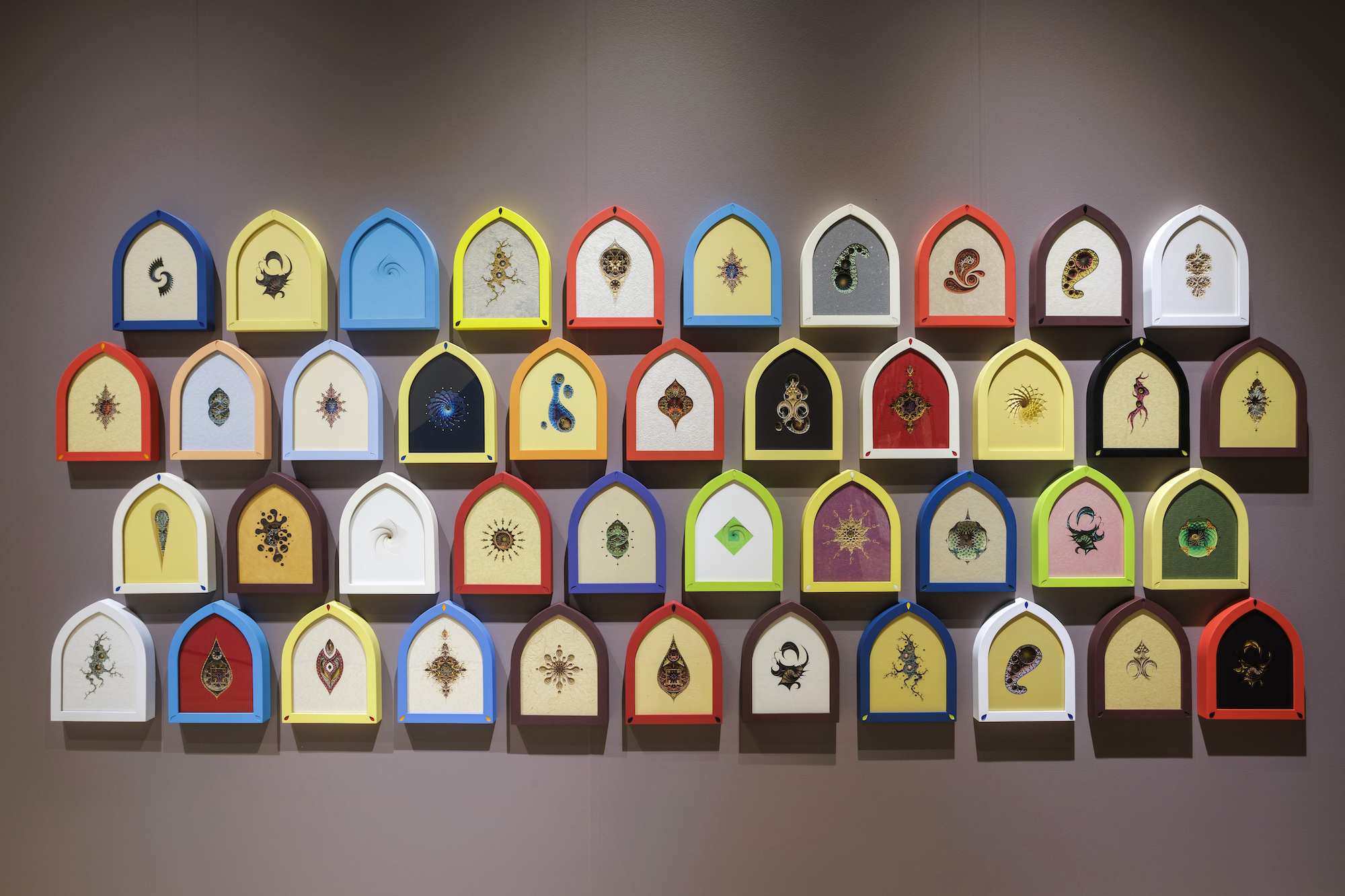 Eric Standley, “Drift” (2022), 48 compositions of laser-cut paper and 23k gold leaf, 12 x 9 x 1.5 inches each