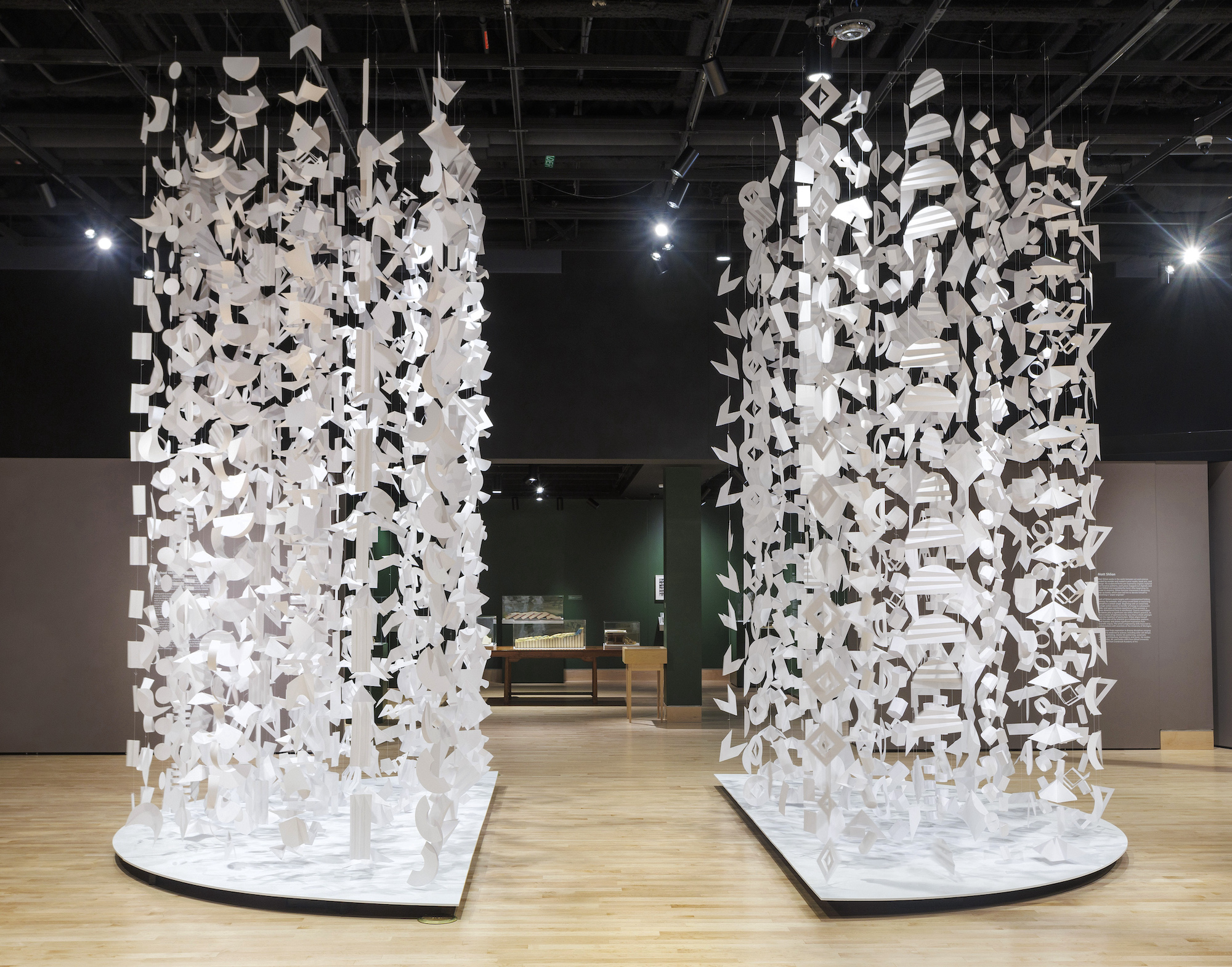 Michael Velliquette, “Deva Realms” (2023), 90 hanging forms of Bristol paper and string, approx. 1,500 components, dimensions variable