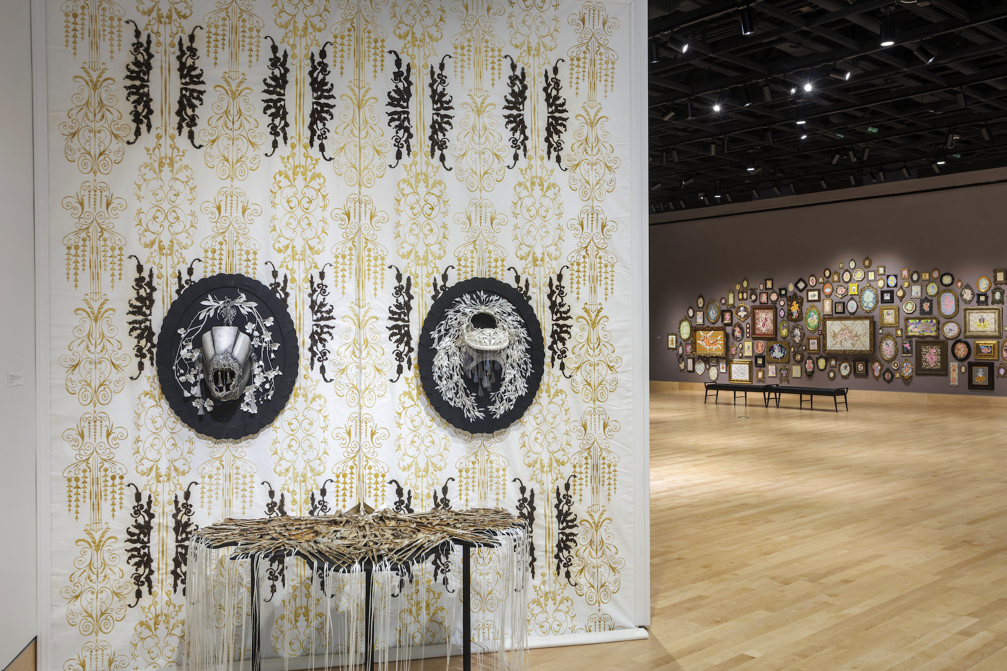 Foreground: Elizabeth Alexander, “Welder’s Daughter: The Waiting Room” (2020), iron filings from parents’ steel work, rust made with filings, graphite, face shield, paper, cast paper, and wood, 144 x 120 x 40 inches. Background: Charles Clary, “Memento Morididdle” (2023)