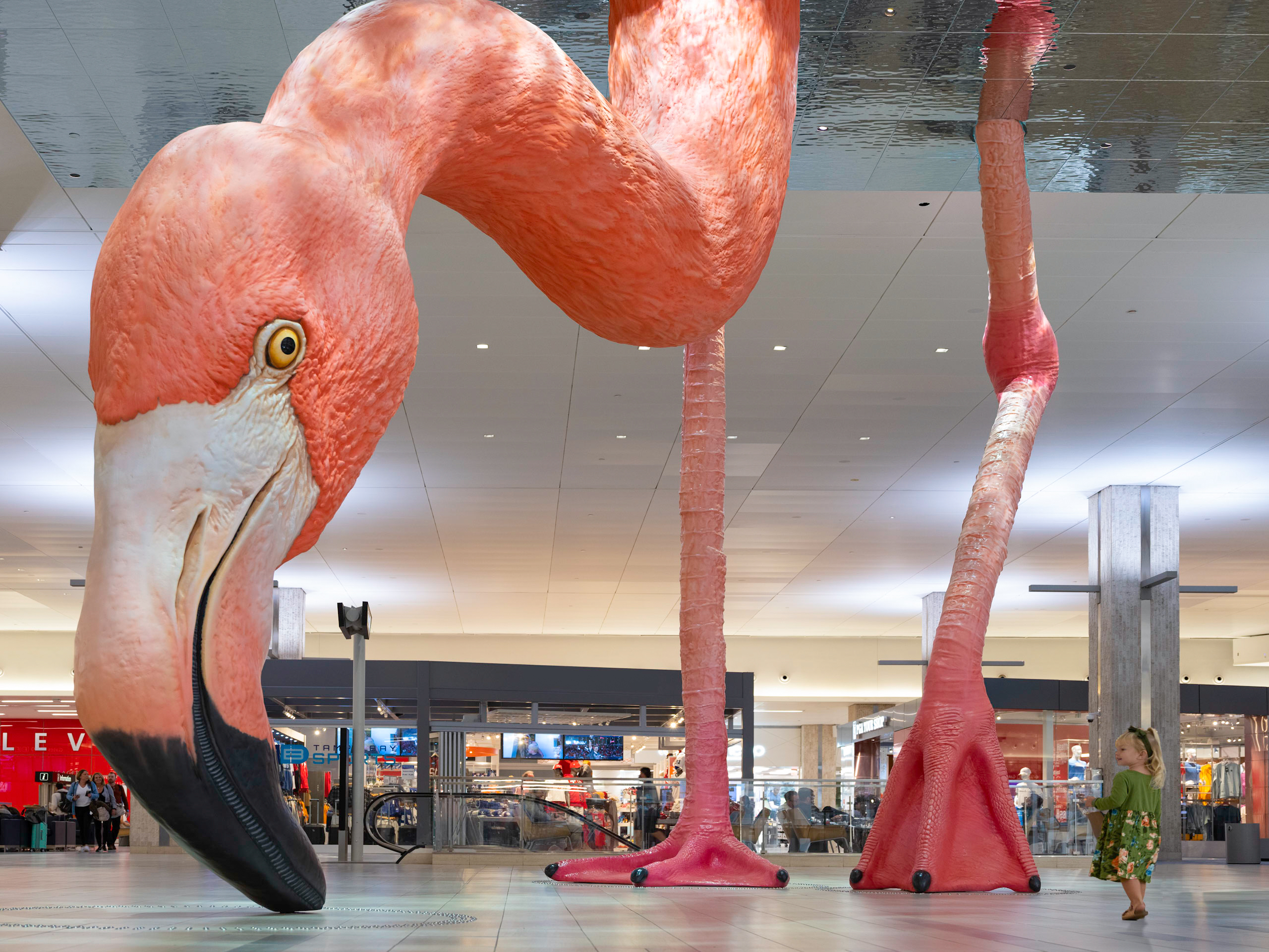 “Home,” a floor-to-ceiling sculpture of a lifelike flamingo, taps into the multiple meanings of its title. Travelers passing through the terminal may be “leaving their homes, returning back home, going to a new home, or simply to a place that feels like home,” reads a statement. In addition to being a place that people dwell, Florida thrums with abundant wildlife, and Mazzotta brings viewers up close and personal with one of the state’s most treasured animals. A glistening film on the ceiling imitates the surface of water, from which the bird’s head and spindly legs emerge as it scans the floor for food, and hidden projectors send glimmering light over the surface, mimicking dappled sunlight filtering through the water.