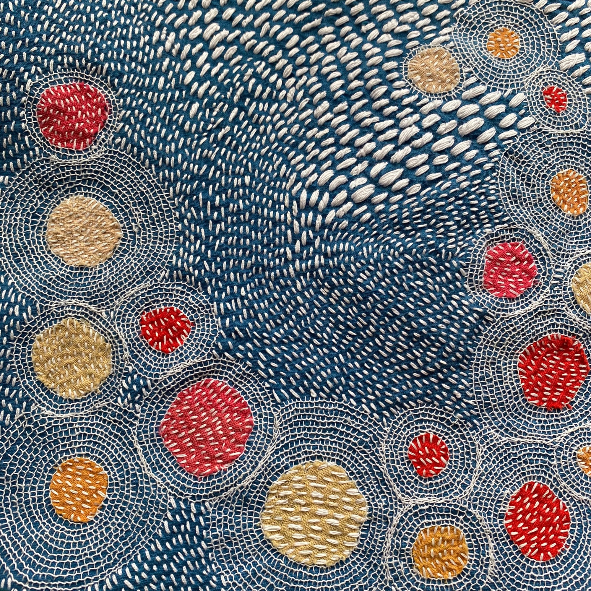The resulting works are rife with patterns. Circular forms buttress dots in varying sizes, and stripes bisect planes of simple back stitches. Many of the motifs evoke the celestial and organic, whether galactic forms, the flow of bodies of water, or small bubbles drifting upward, the latter of which she tends to render in white. “To me, colors have a personality to them, and shapes have a weight and character to them, so when I’m thinking of a piece in my mind, or sitting down to cut fabric, I’m always imagining the push and pull, or the gravity that certain shapes and colors have with one another,” she says.