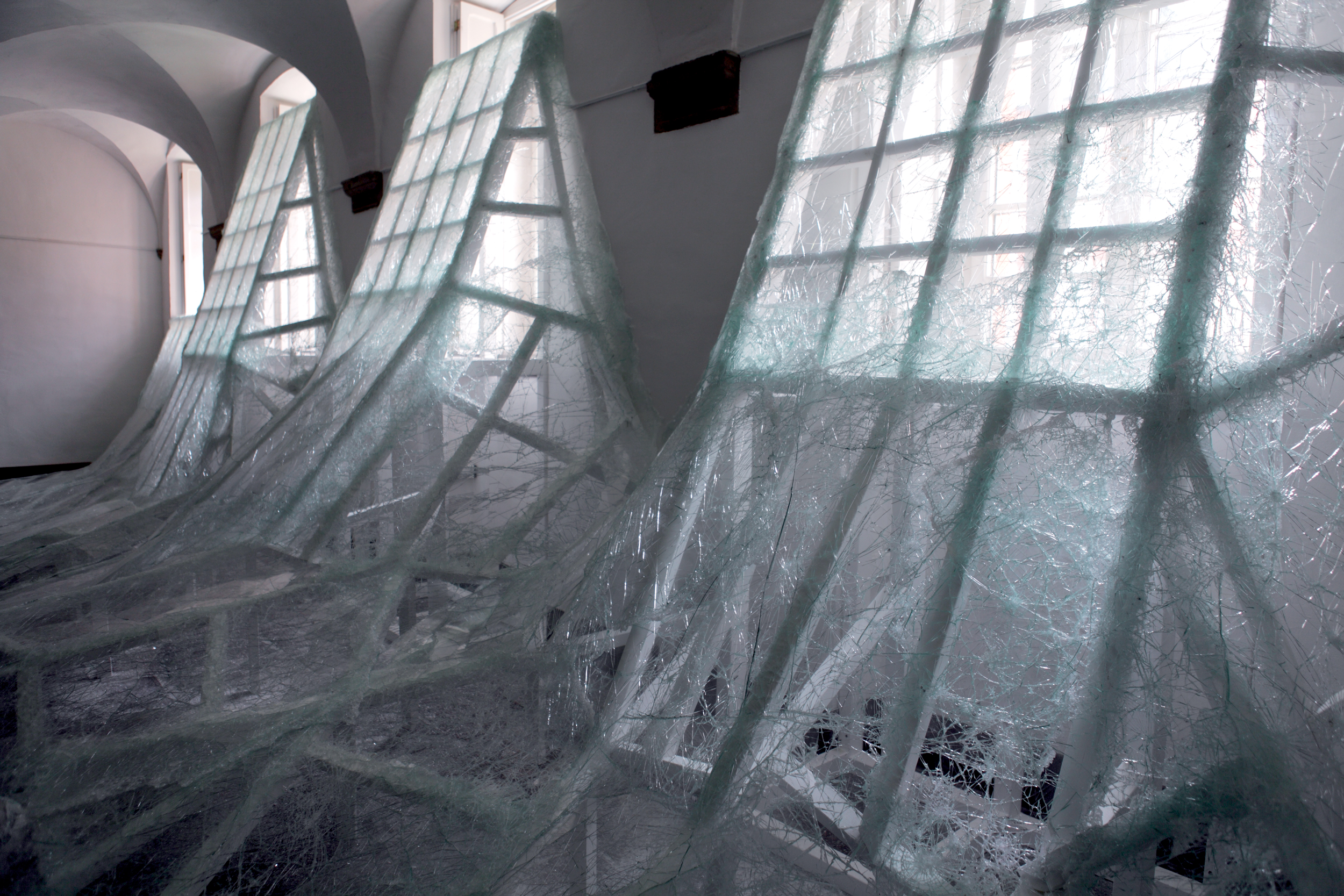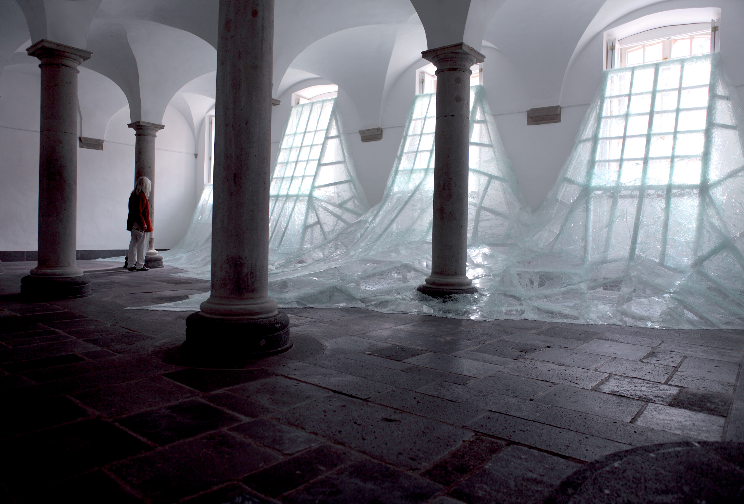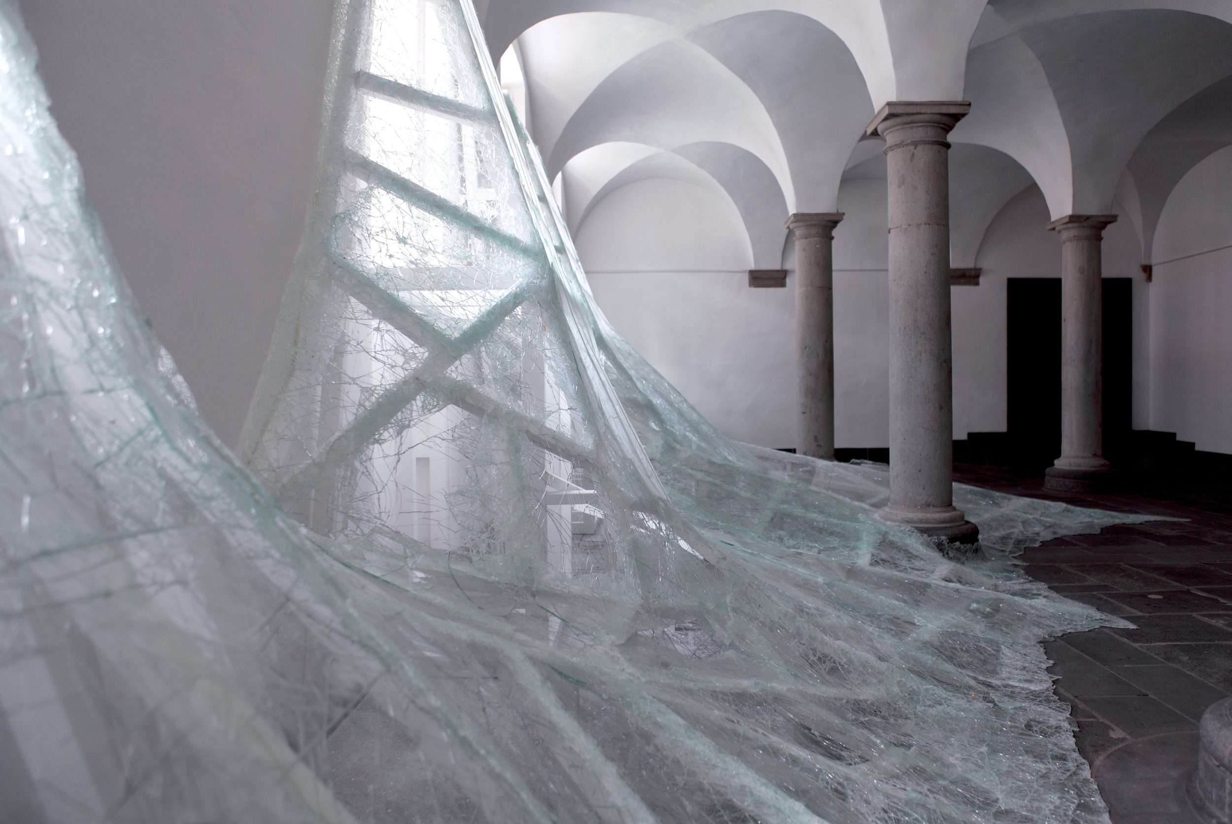 “Aerial” (2012), 33/2 laminated glass from Glas König, wood, nails, and white paint, 3 x 12 x 4.5 meters, two ons of glass. Installed at Brauweiler Abbey in Pulheim, Germany