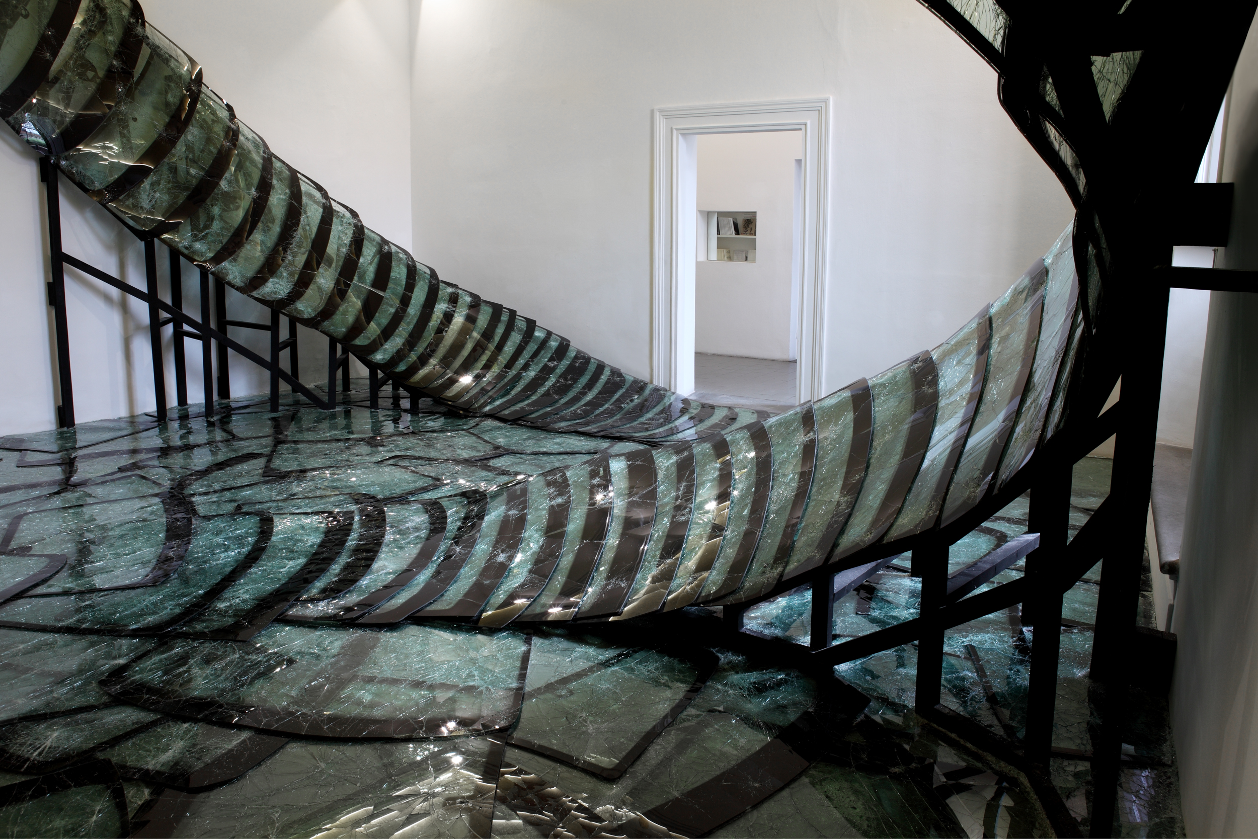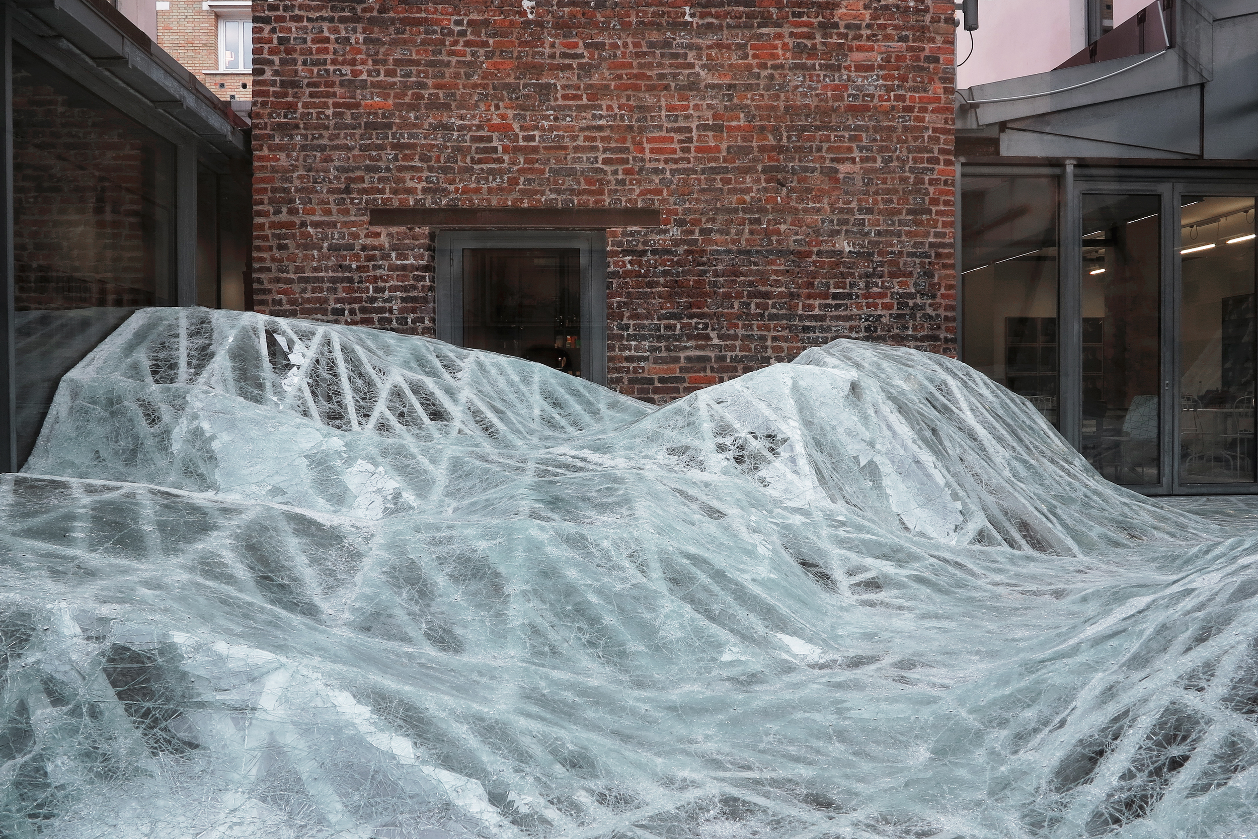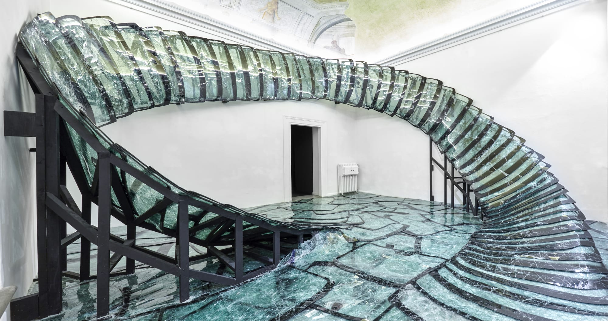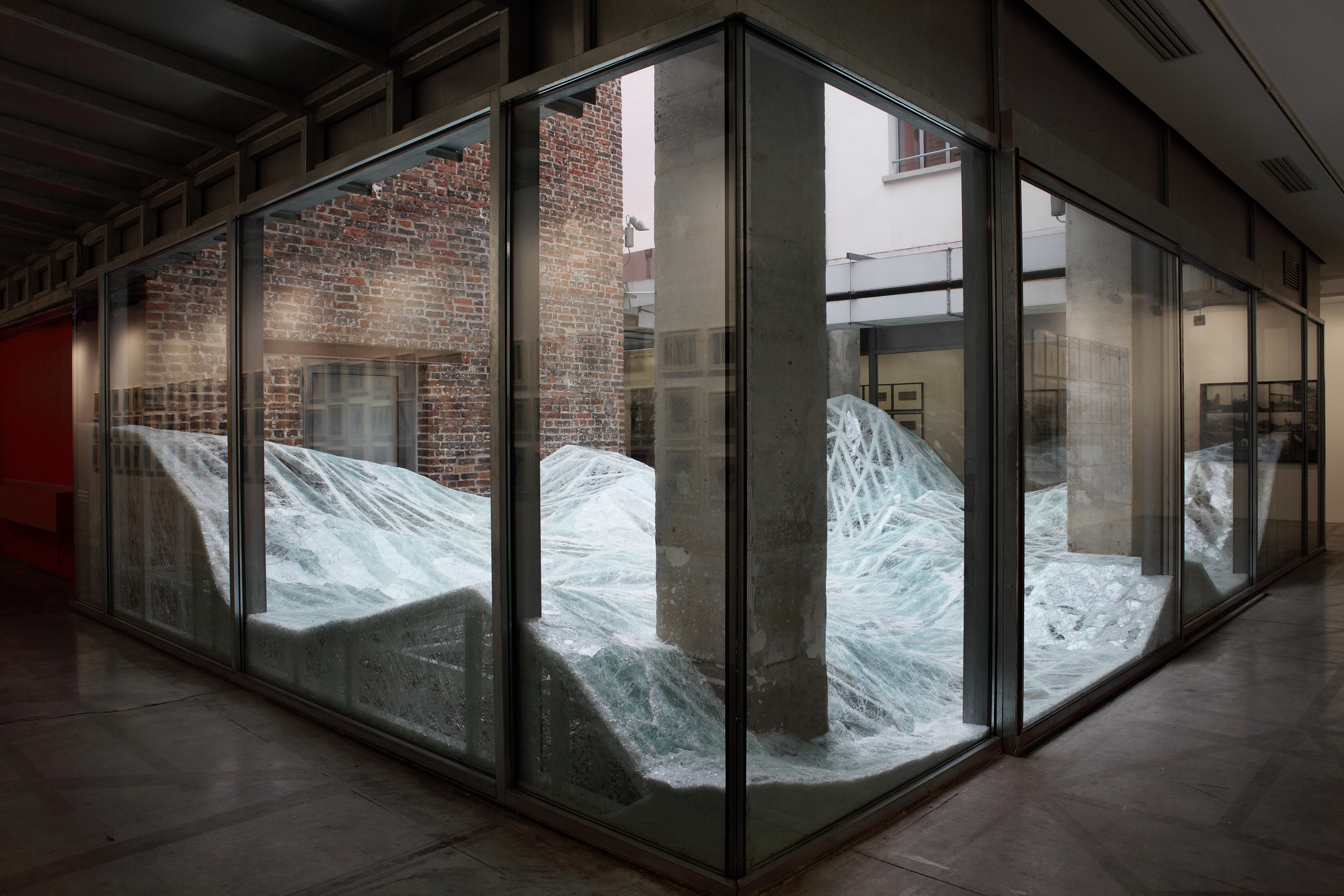 The French artist is known for large-scale installations that repurpose utilitarian objects like cafe chairs, staples, and windshields into elaborate, immersive artworks. Enormous sheets of glass cascade from the windows of an abbey or slosh around inside of a courtyard, often using many tons of the fragile planes to accomplish a sense of undulating motion.